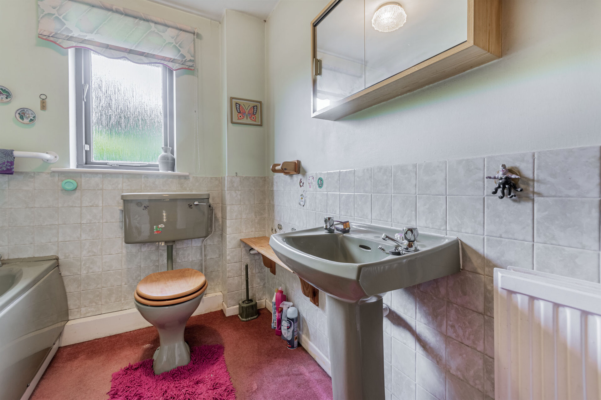 A three piece suite comprising of a panelled bath, pedestal wash hand basin, and w.c ,airing cupboard housing the tank, radiator and opaque window to the rear.