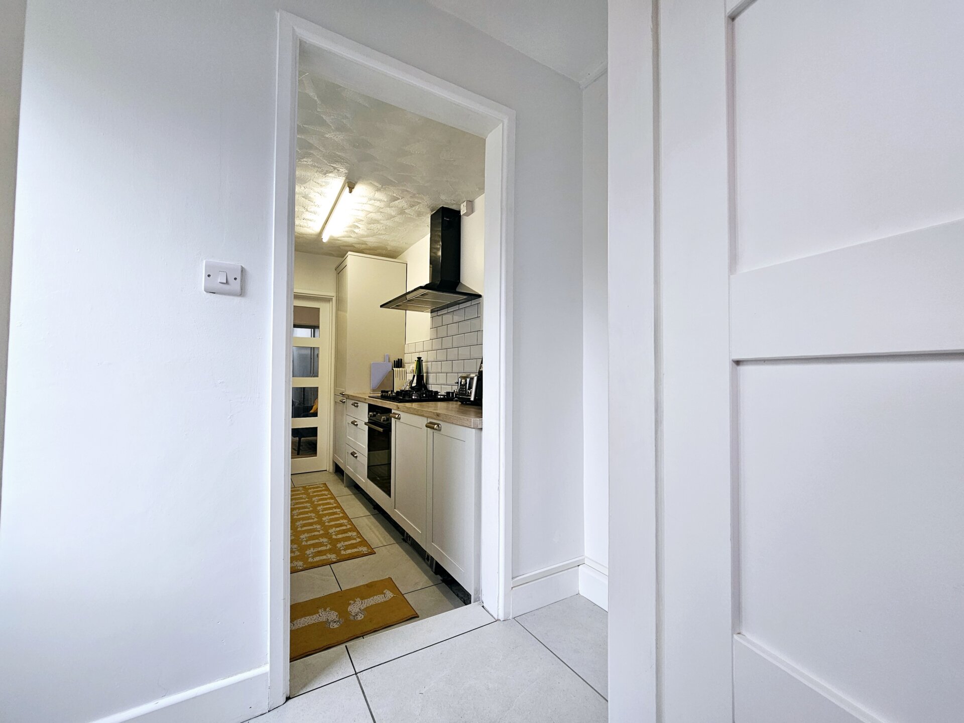 Rear Corridor with tiled flooring, double glazed door to the right elevation leading to the garden and door to