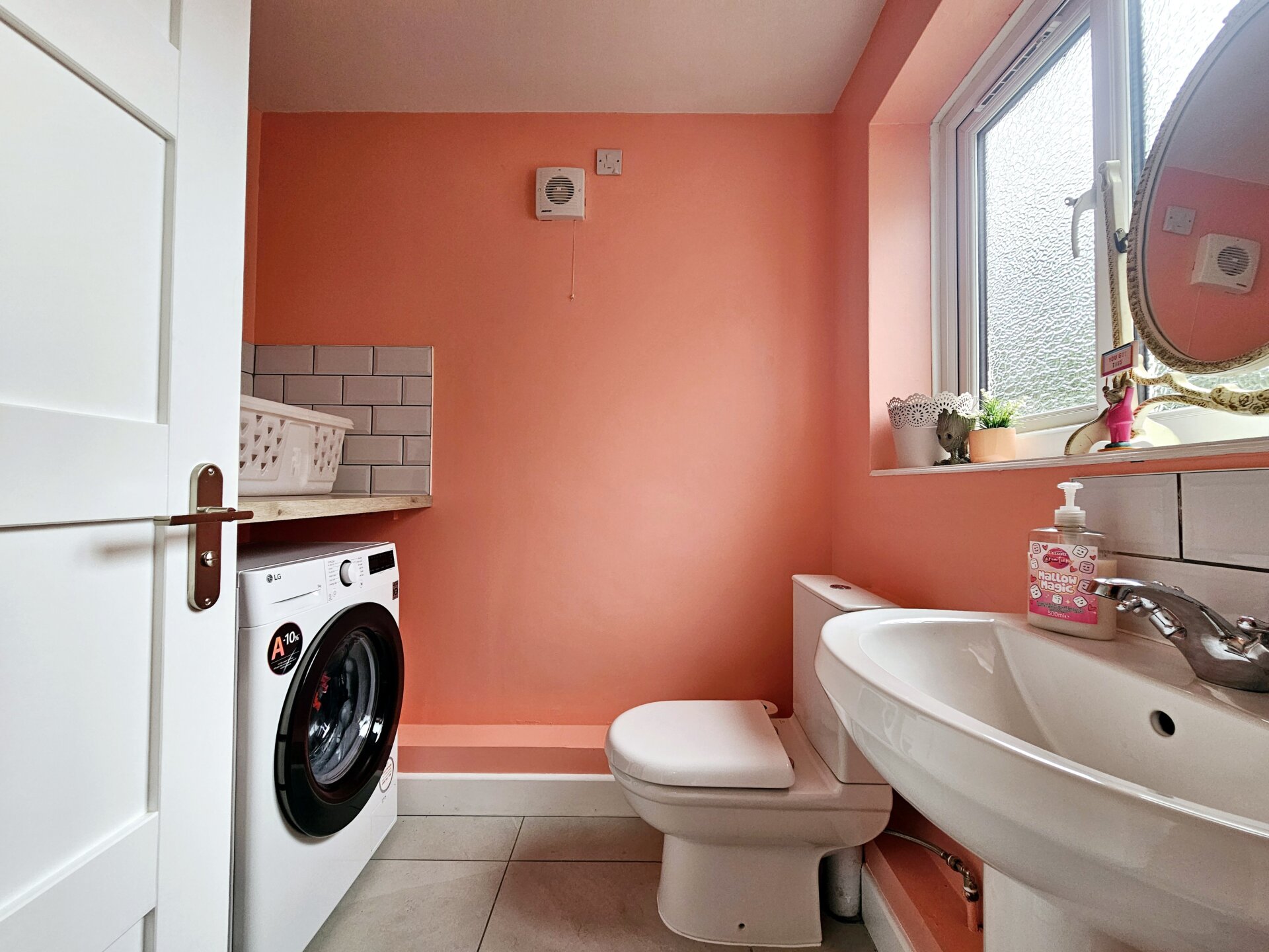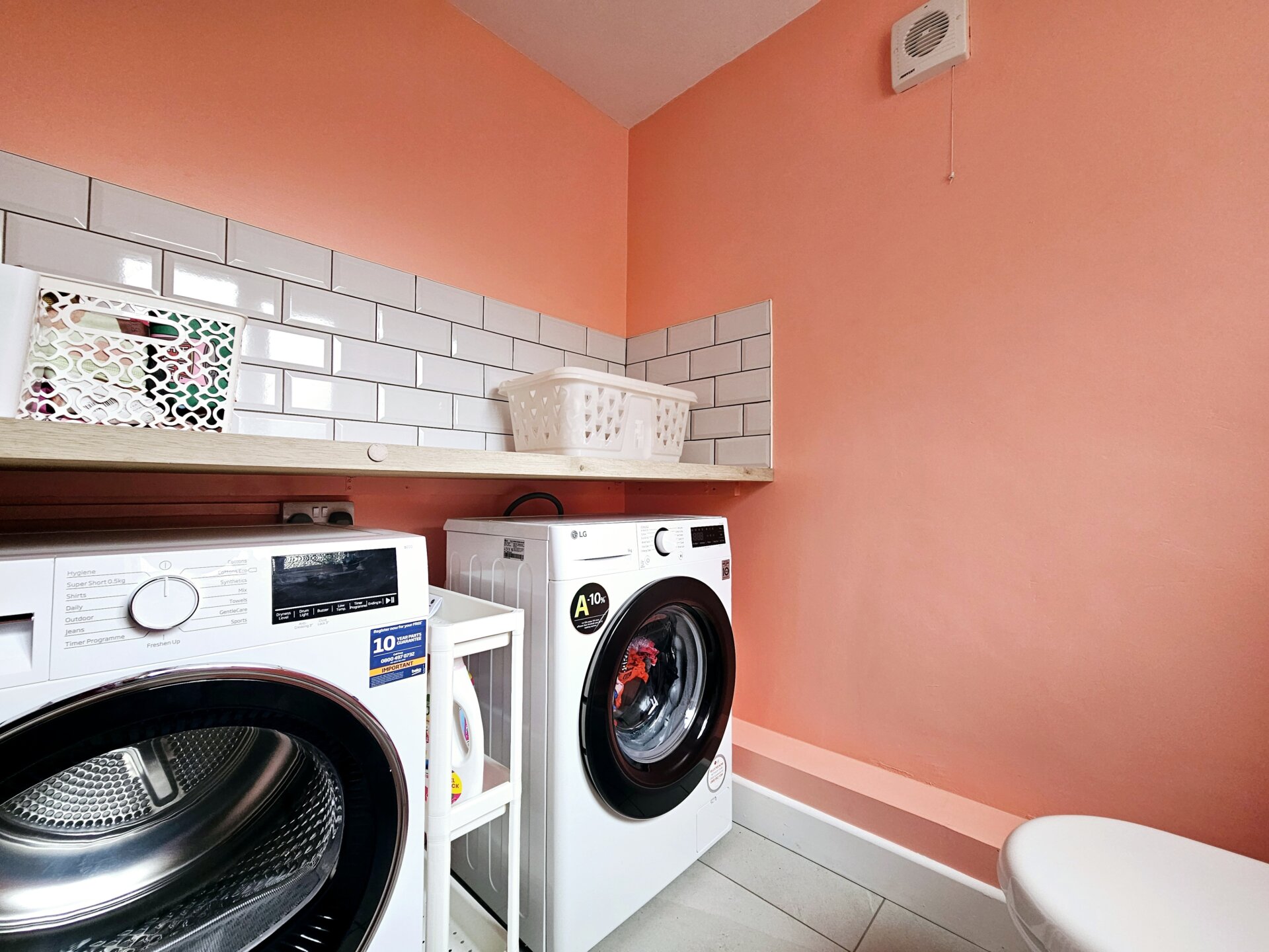 A superb extra room with square top work surface with tiled splash backs, space for washing machine and dryer, low flush wc, wash hand basin, tiled flooring and opaque double glazed window to the right elevation.