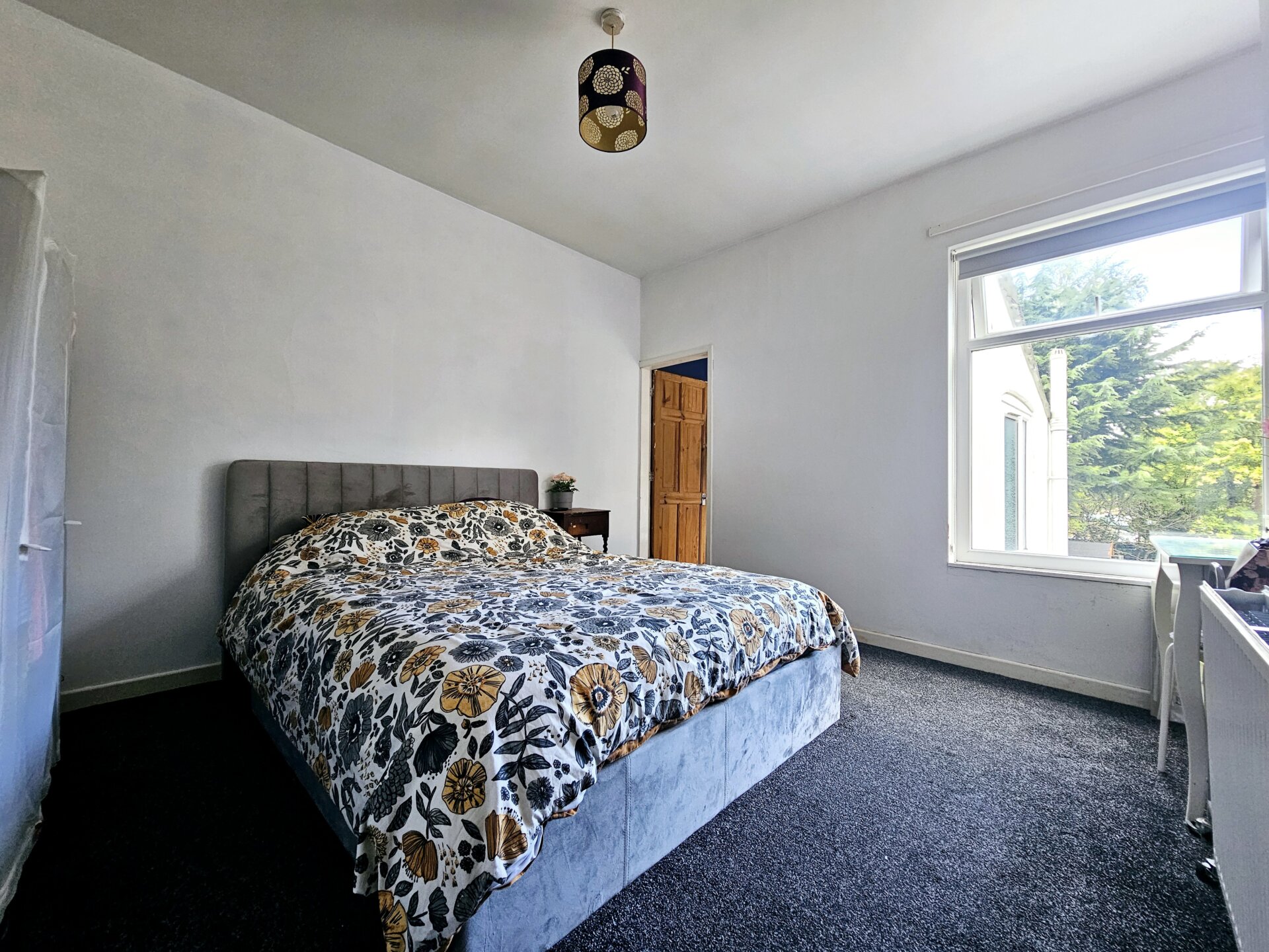 A generous bedroom with continued high ceilings and large double glazed window to the front elevation, carpet flooring and radiator.