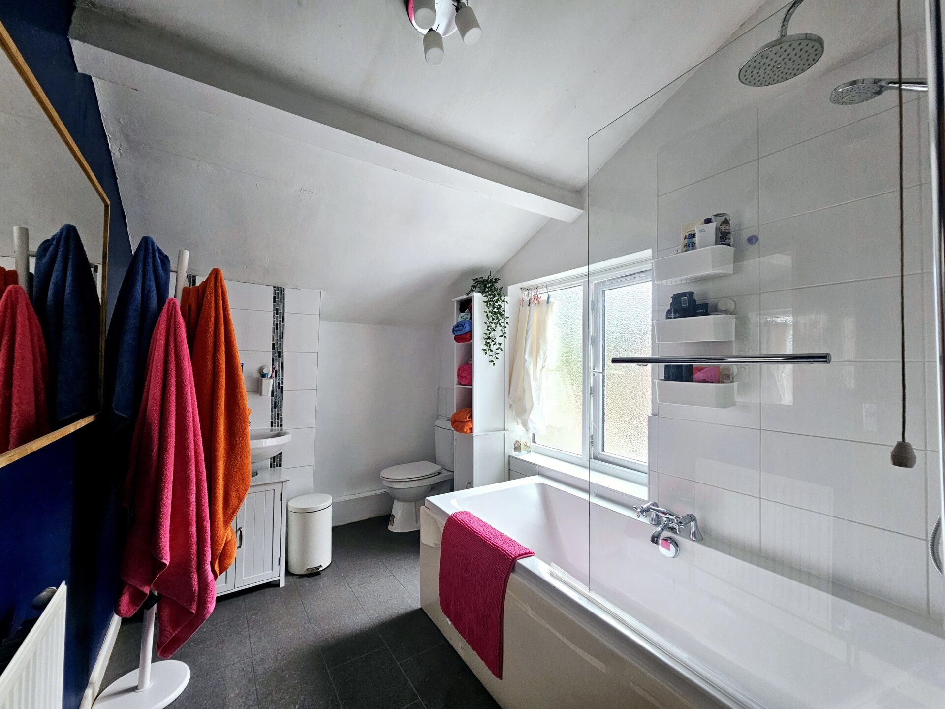 What a cracking size three piece bathroom suite, comprising a panelled bath with waterfall shower over with mixer, glass privacy screen, tiled splash backs, low flush wc, pedestal wash hand basin, radiator, opaque double glazed window to the right elevaton.