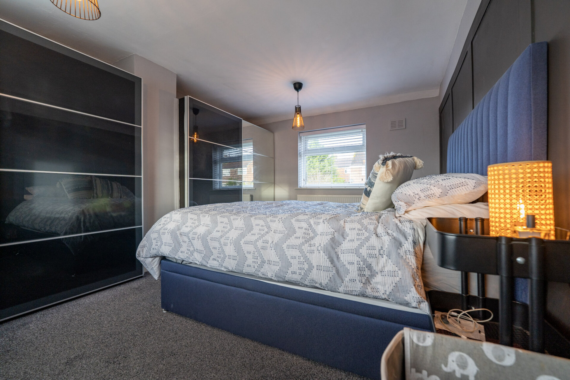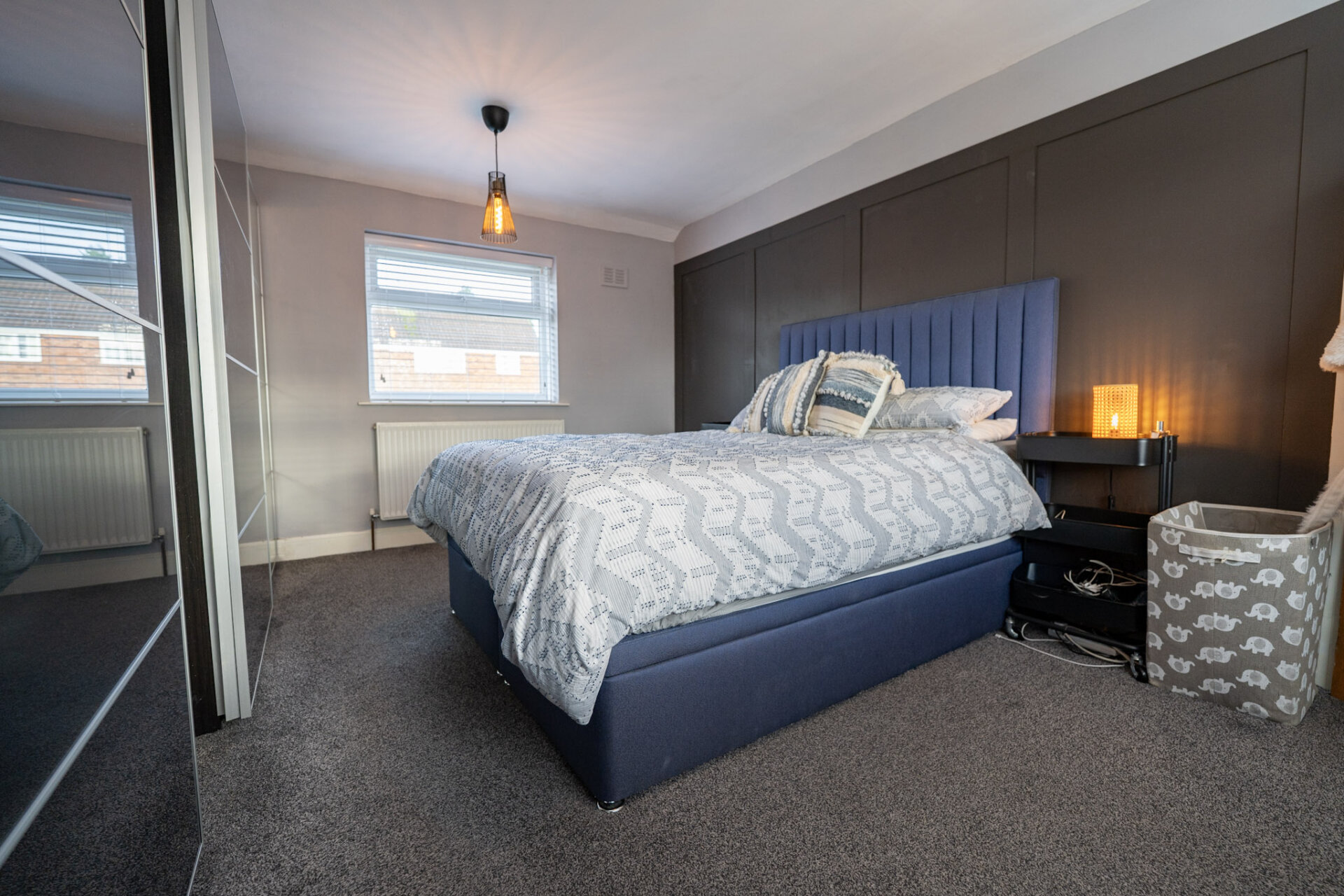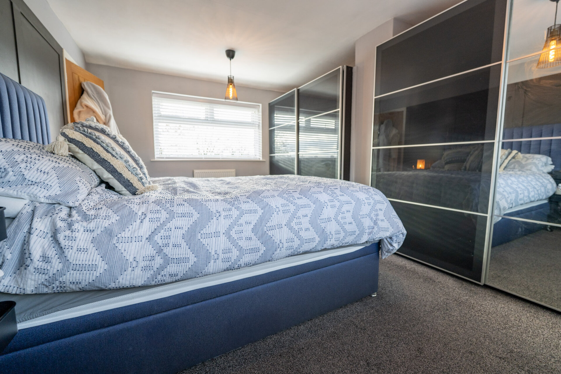 A superb size main bedroom with dual aspect double glazed windows to the front and rear elevations, recess alcoves with large wardrobes, carpet flooring and radiator.