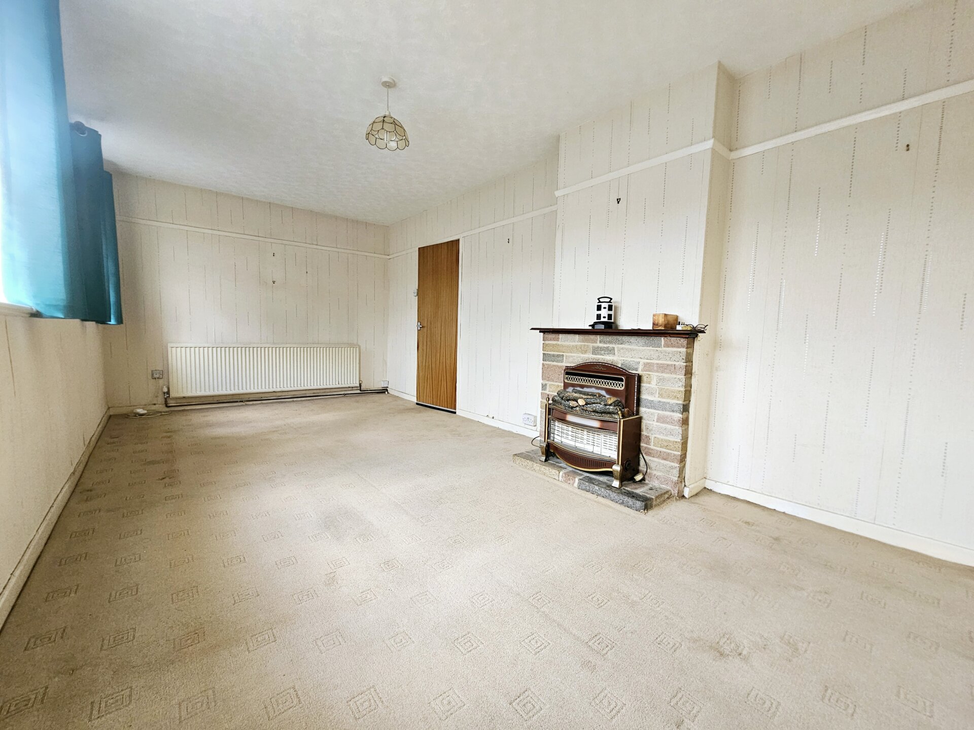 A great reception room with carpet flooring, chimney breast with gas effect fire place with surround, two radiators and two double glazed windows to the rear elevation.