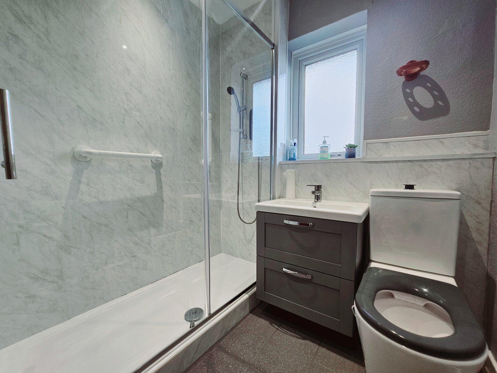 An updated shower room with double walk in shower, vanity with inset wash hand basin, wc, radiator and opaque double glazed window to the rear elevation.