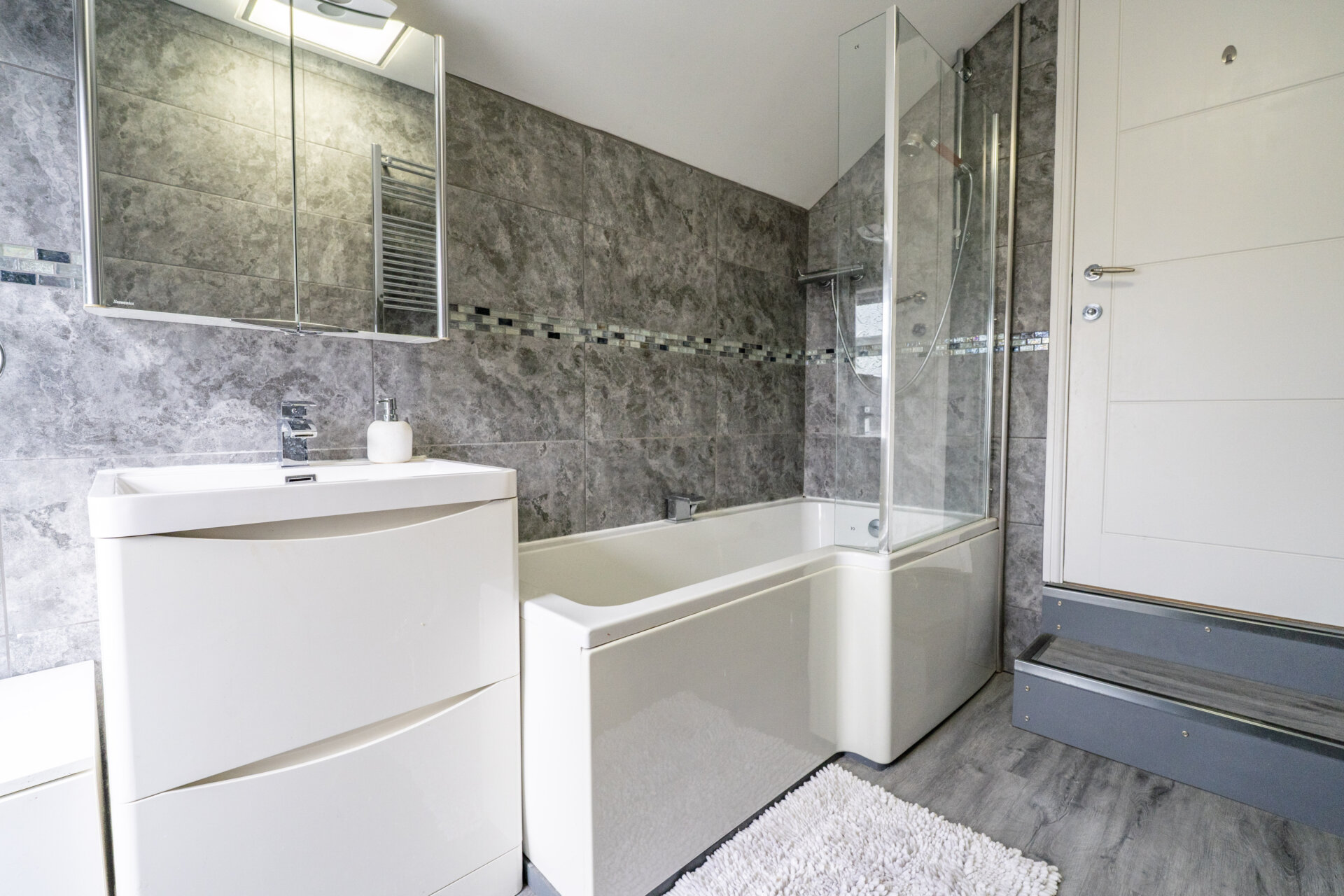 A stunning re fitted white three piece bathroom suite comprising a 'P' shaped bath with shower over, glass privacy screen, low flush WC, vanity unit with inset wash hand basin, ladder style radiator and opaque double glazed window.