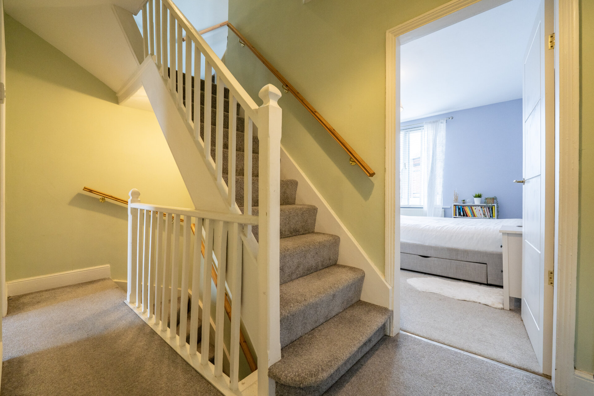 Stairs ascending to the first floor with carpet to both, with balustrade, hand rails and doors to bedrooms and bathroom.