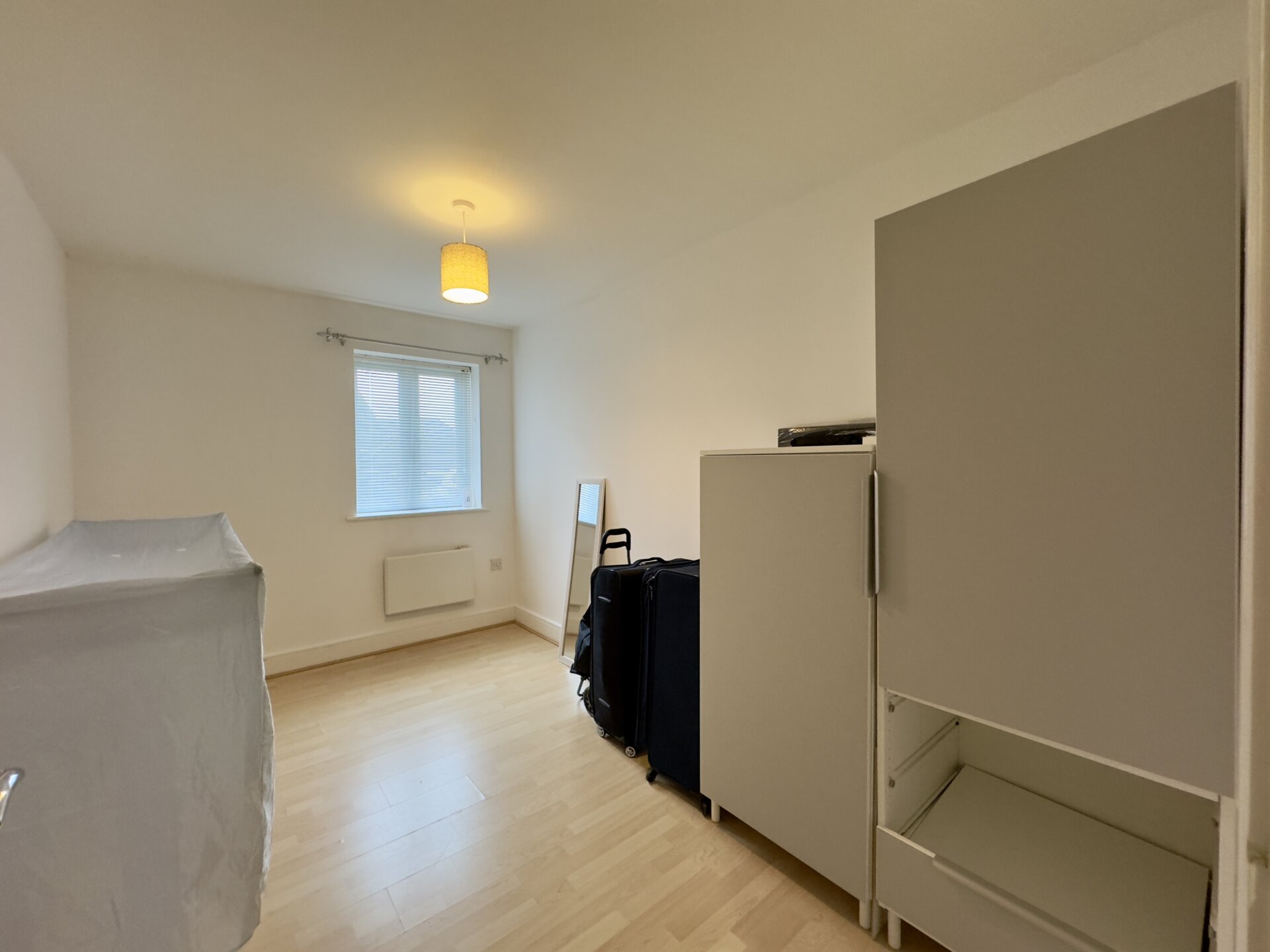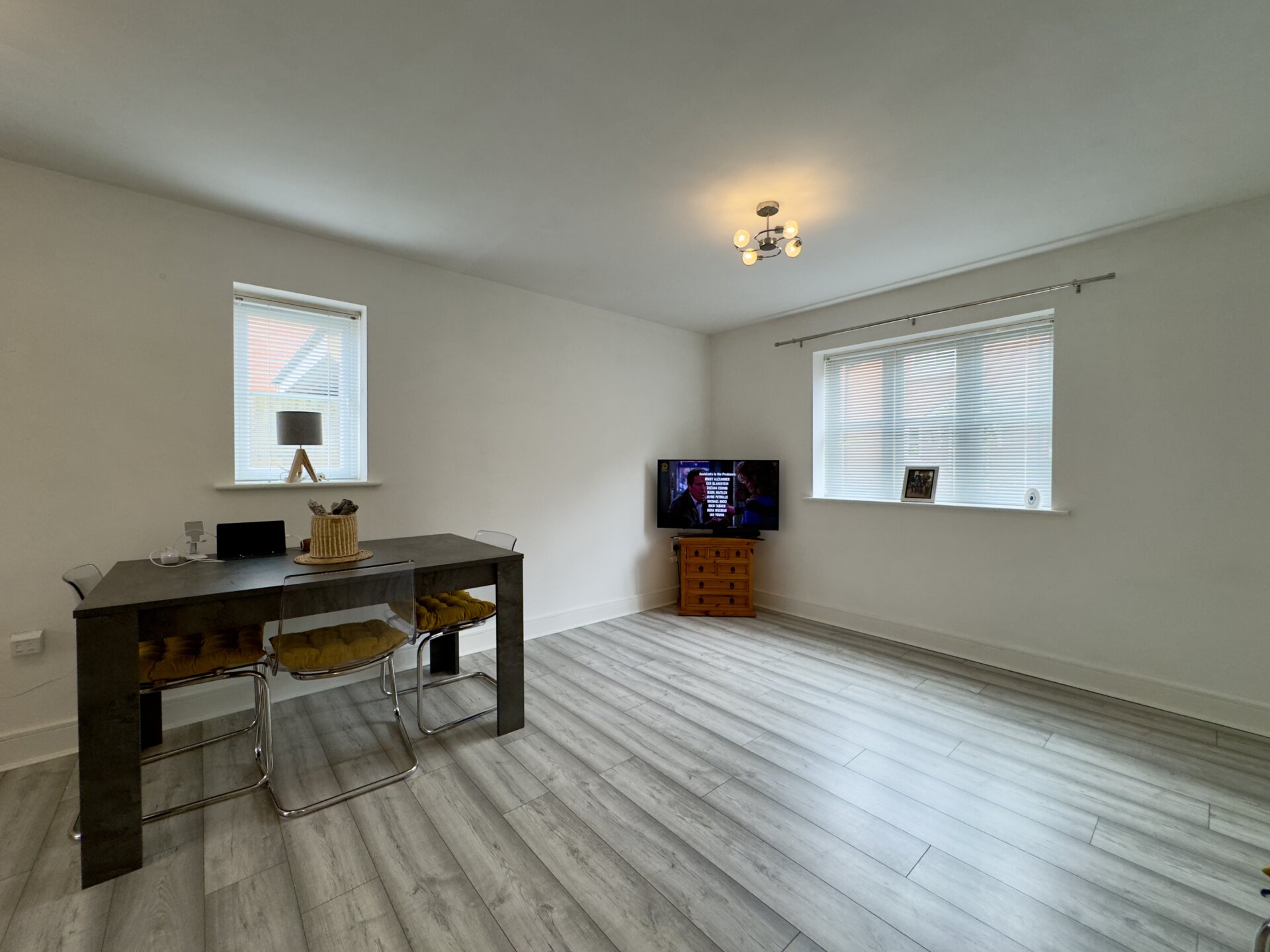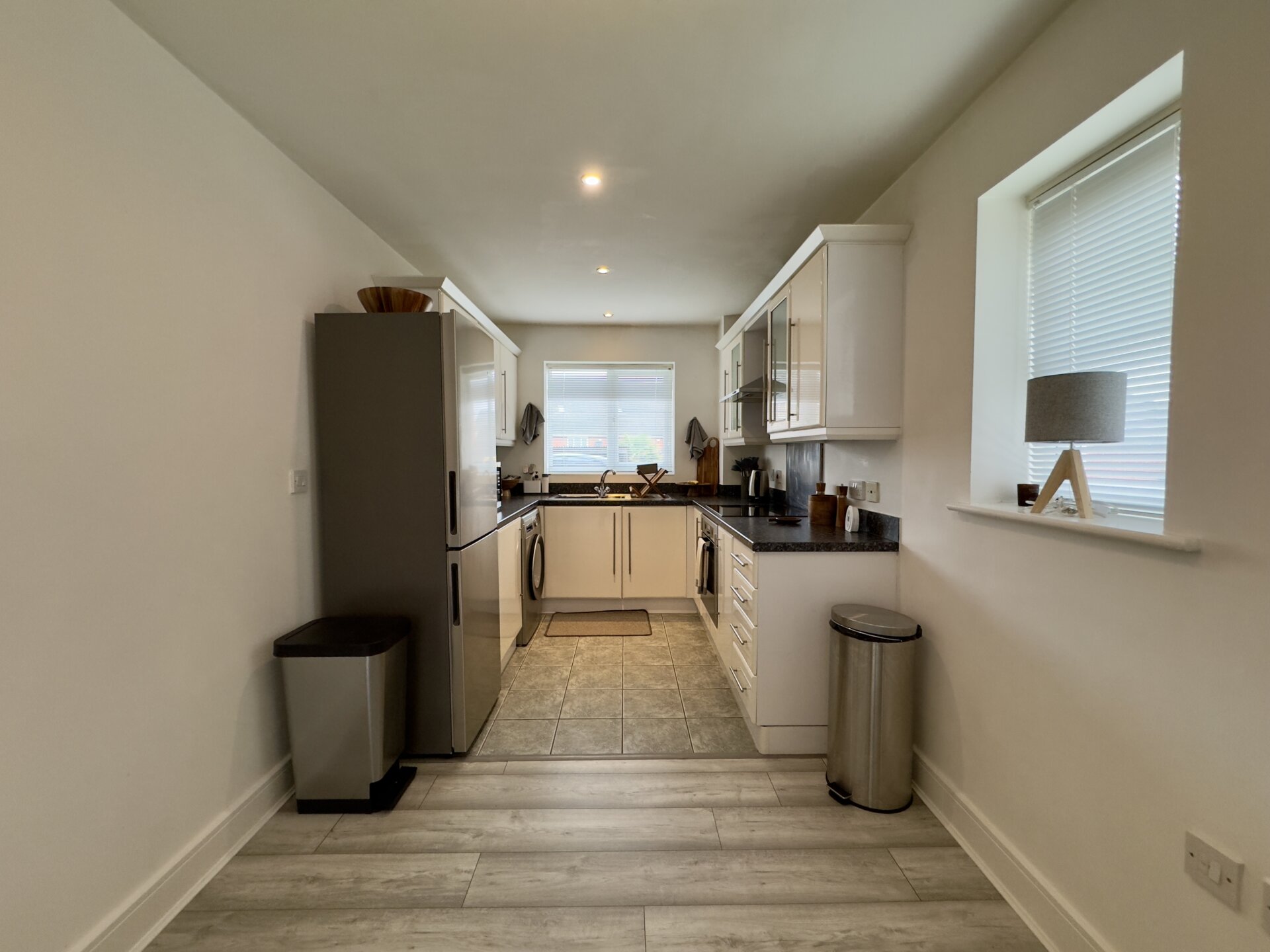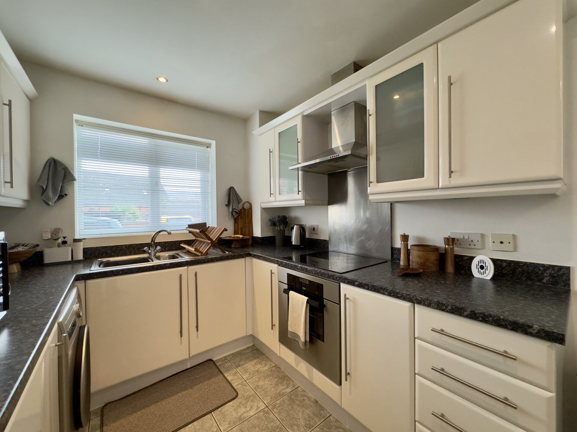 Upon entering the property, you step into the entrance hall which has a useful storage cupboard and gives access to all rooms. The open plan living area is a nice size and bright due to having dual aspect windows letting in an abundance of light. The kitchen is fitted with a range of modern wall, base and drawer units with an ample amount of work surface over. The kitchen is complete with an integrated oven and hob with cooker hood over. There’s also space for all of the usual kitchen appliances.