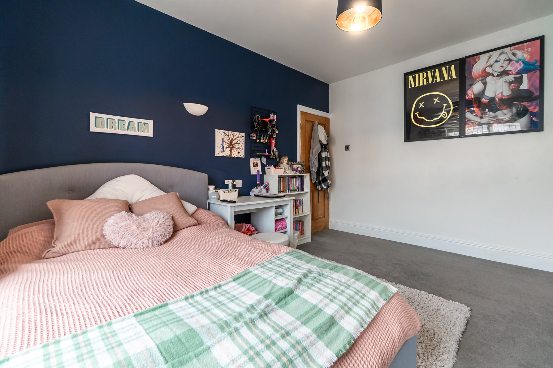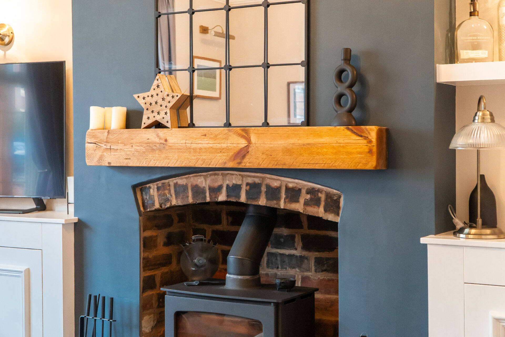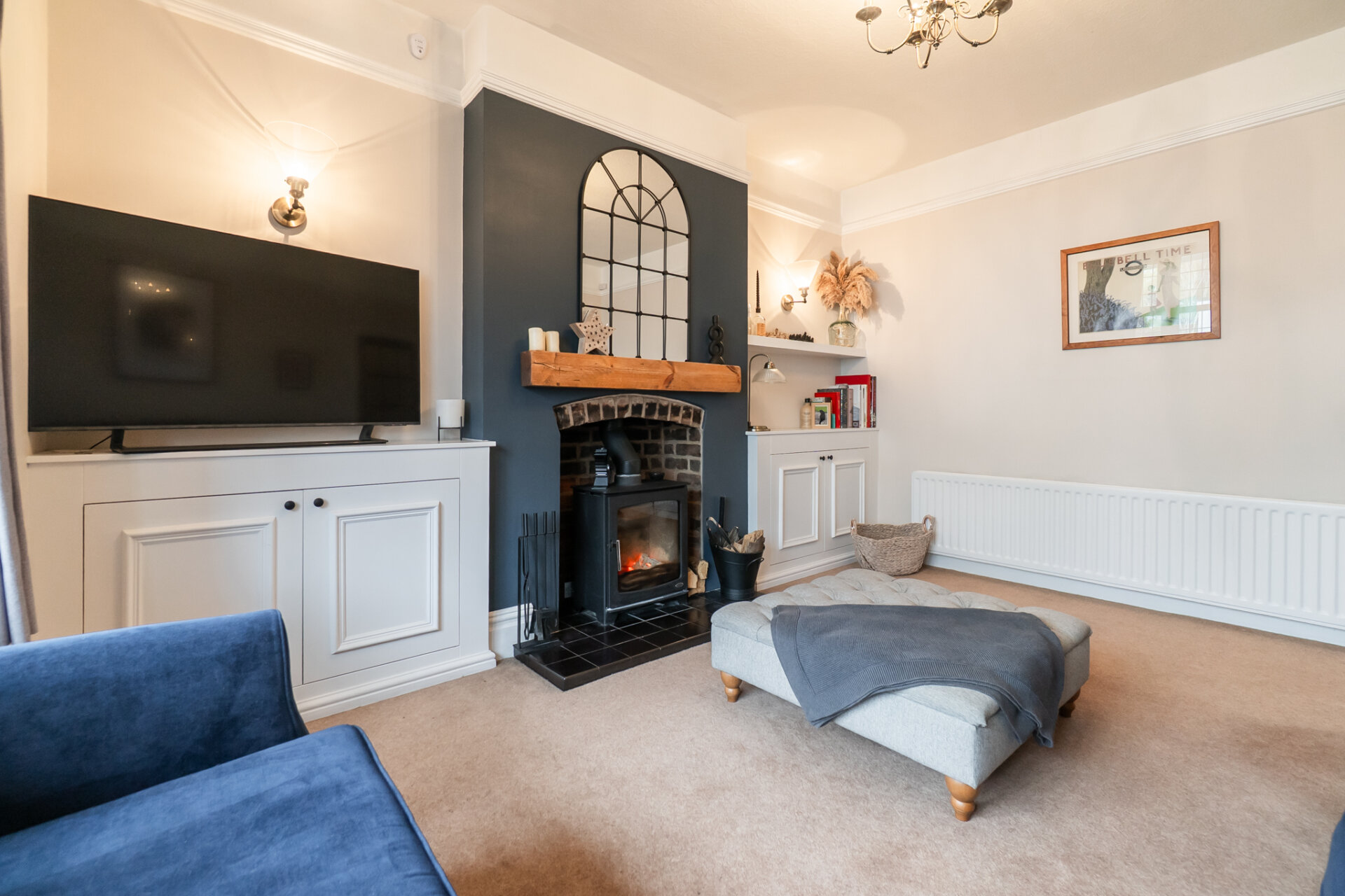 To the front of the property, a beautifully presented reception room features a bay window that fills the space with natural light, complemented by a log burner that creates a warm and welcoming focal point.