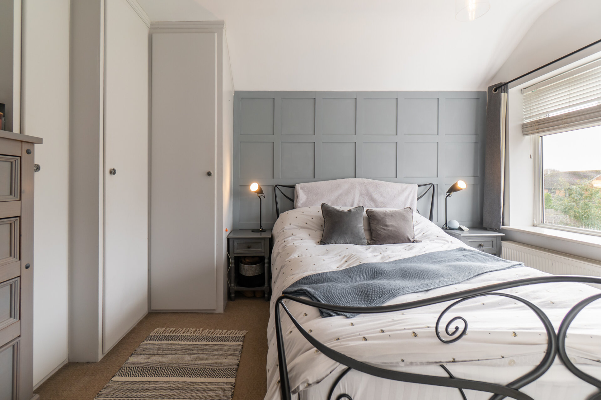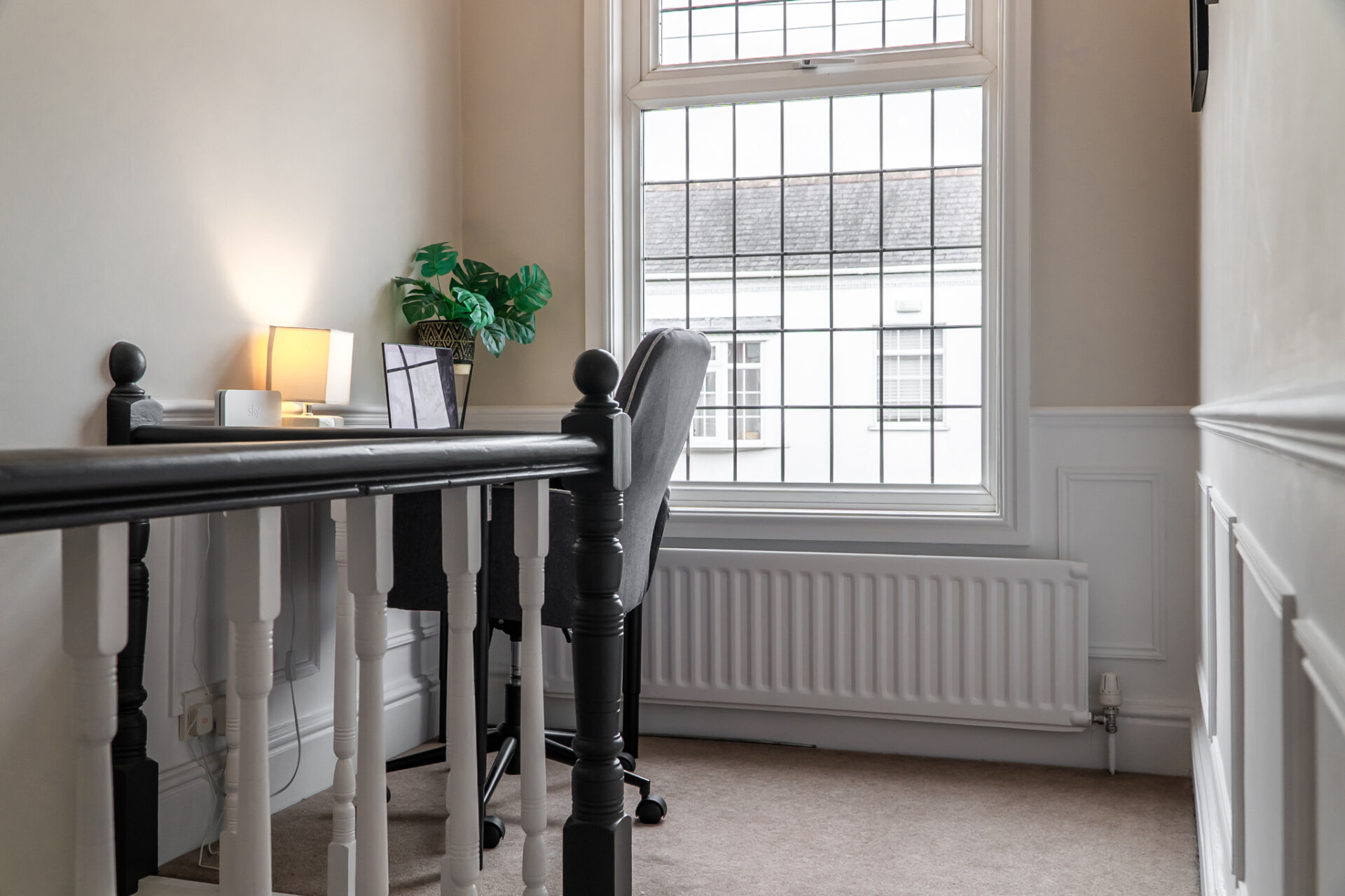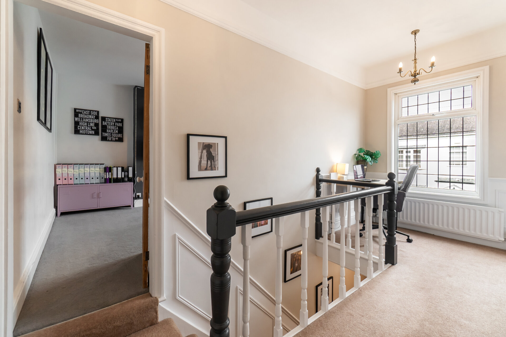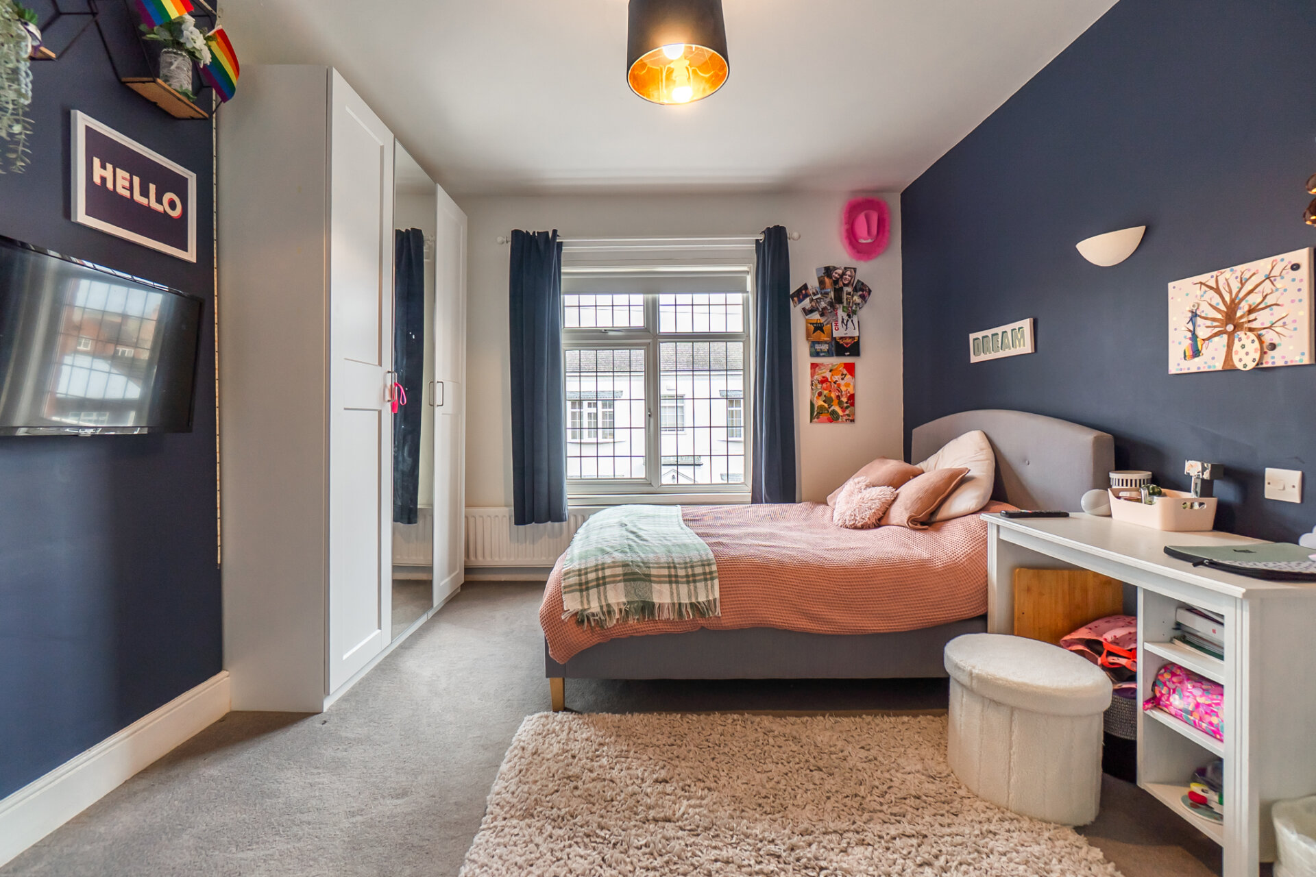 To the front of the property, a beautifully presented reception room features a bay window that fills the space with natural light, complemented by a log burner that creates a warm and welcoming focal point.
