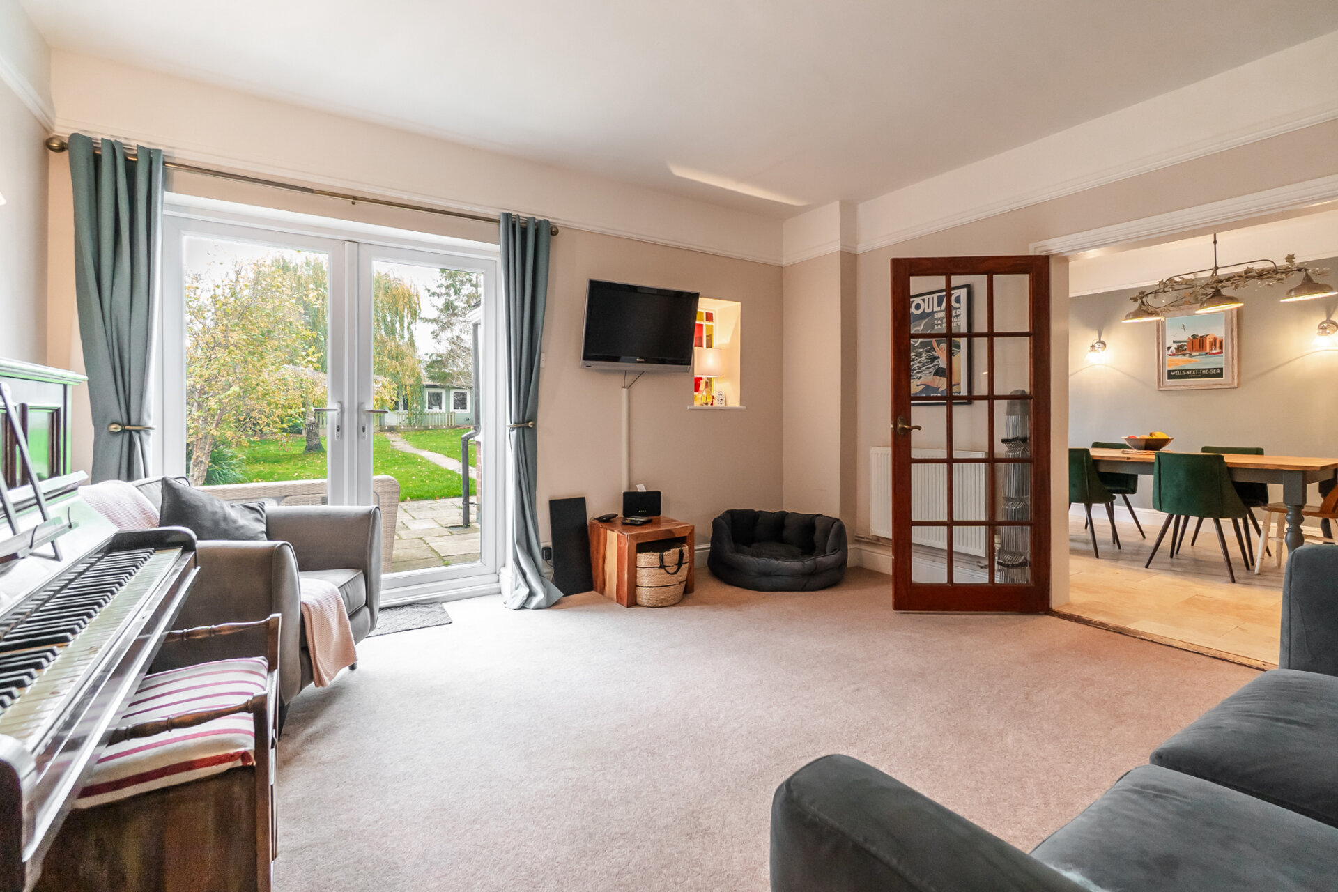 To the rear, the home has been tastefully extended to form a superb open-plan kitchen and dining area — the true heart of the home — boasting a central island, Aga, and ample fitted cabinetry. This space flows seamlessly into a further reception room through double doors, with French doors opening onto the rear garden, providing a wonderful connection between indoor and outdoor living.