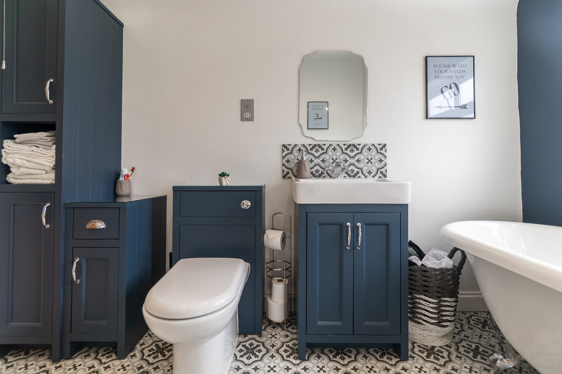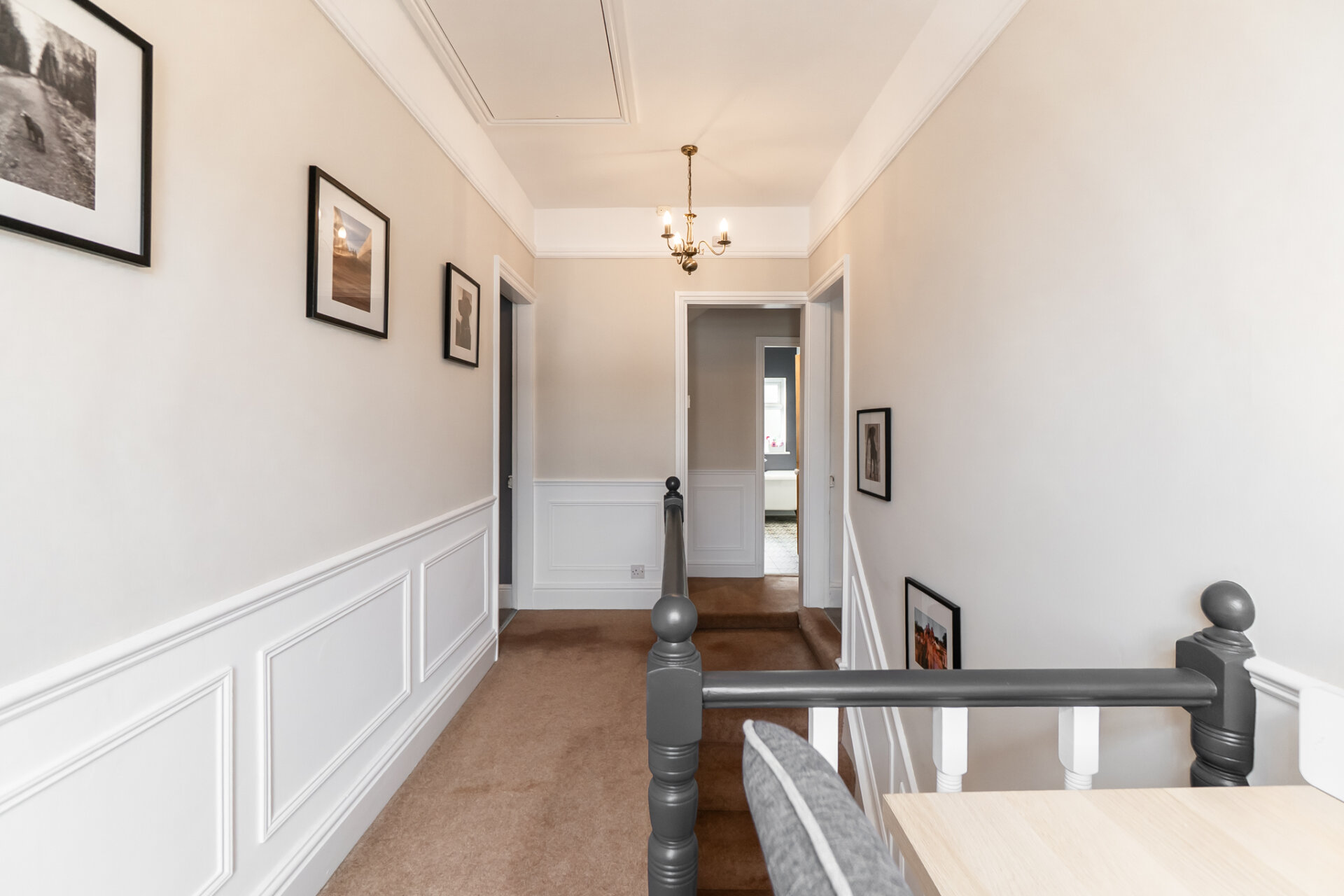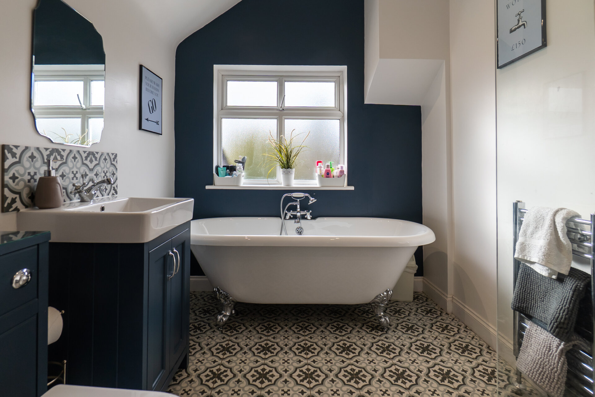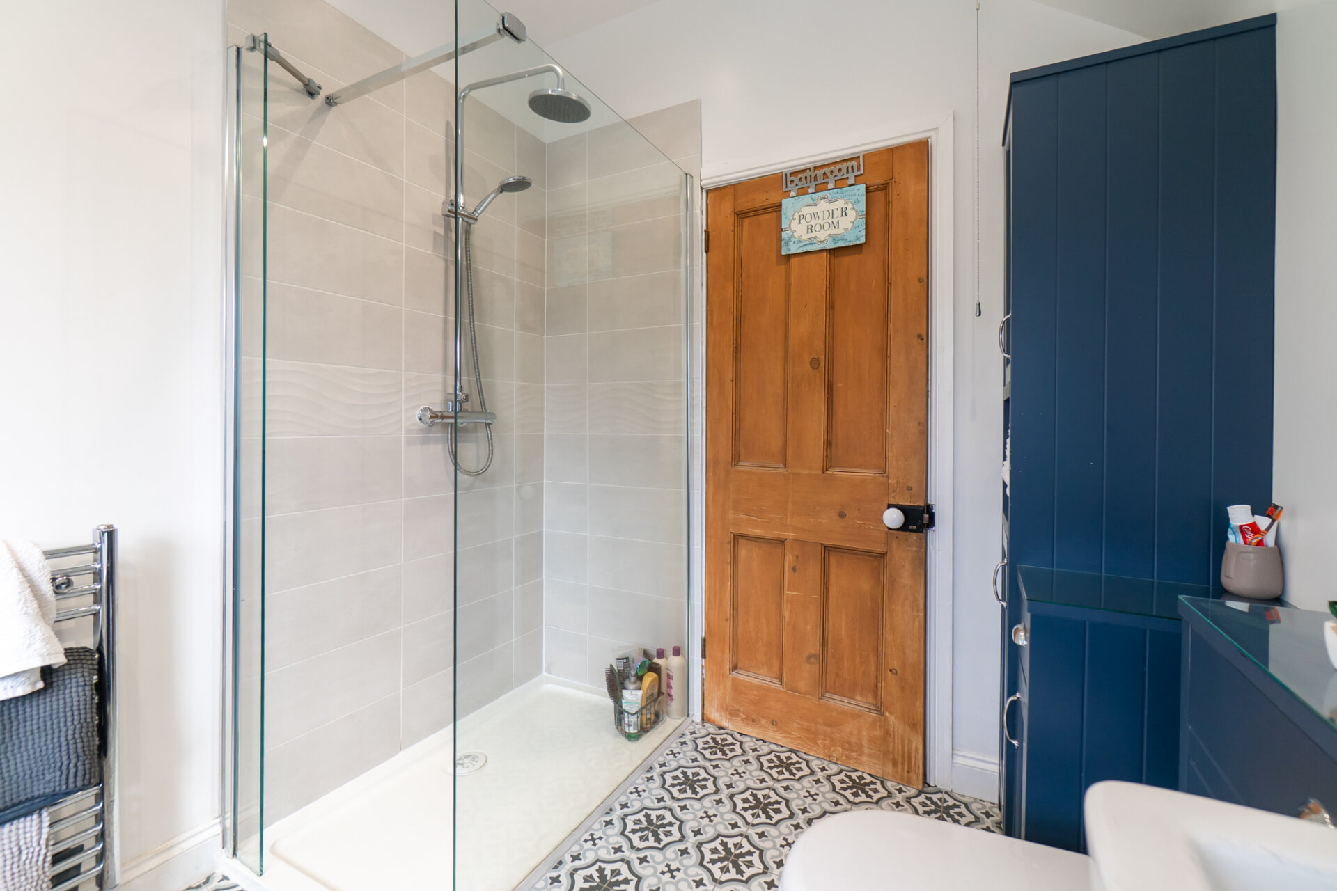 Upstairs, there are four generously sized double bedrooms. The main bedroom benefits from its own en-suite shower room, while the family bathroom is fitted with a luxurious four-piece suite, including a roll-top bath and walk-in shower, combining style and functionality.