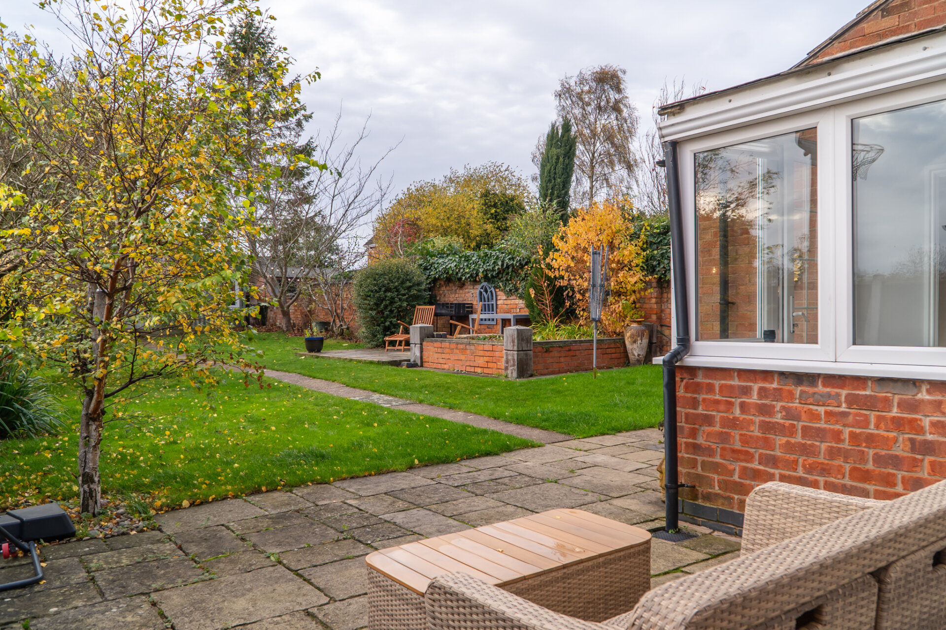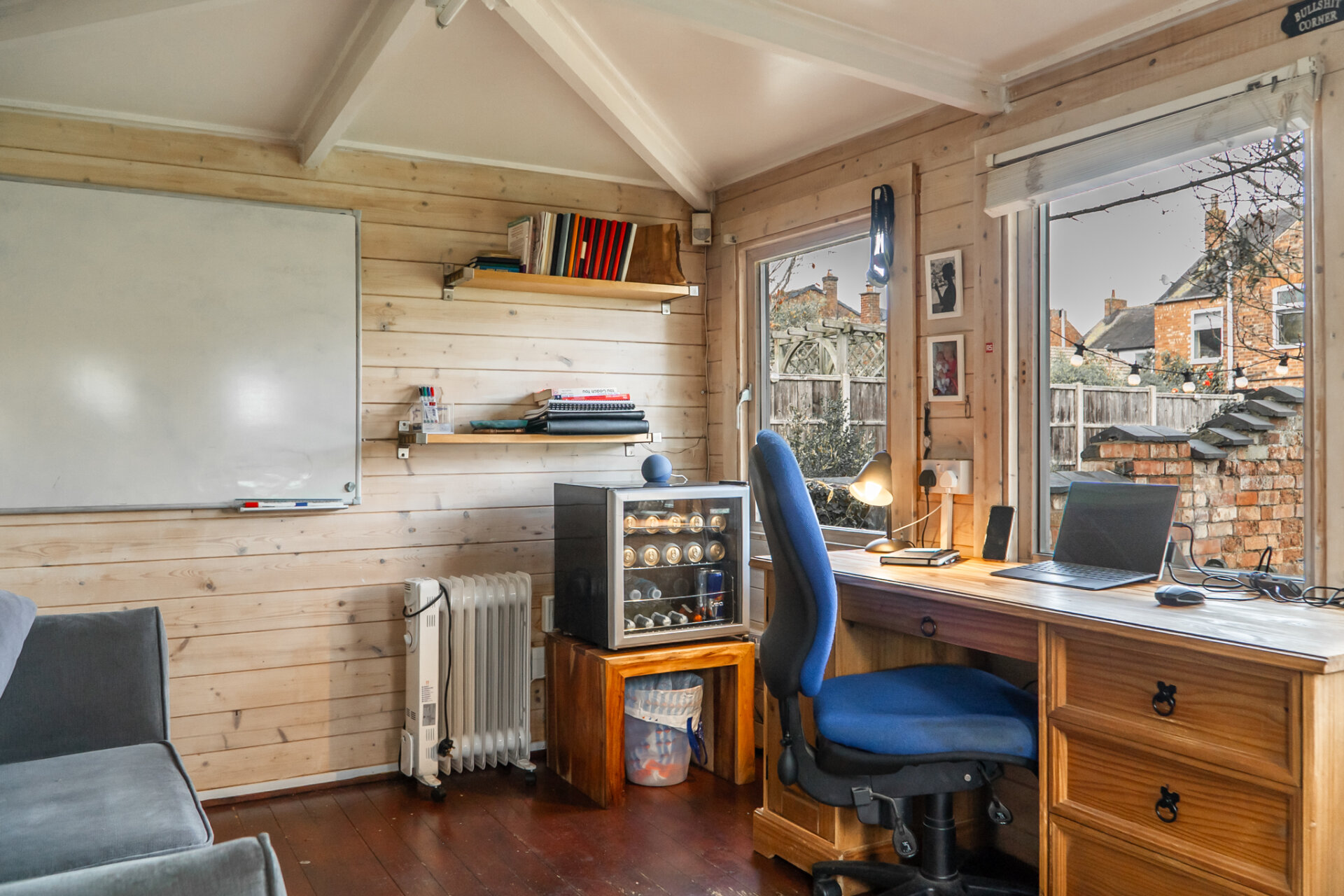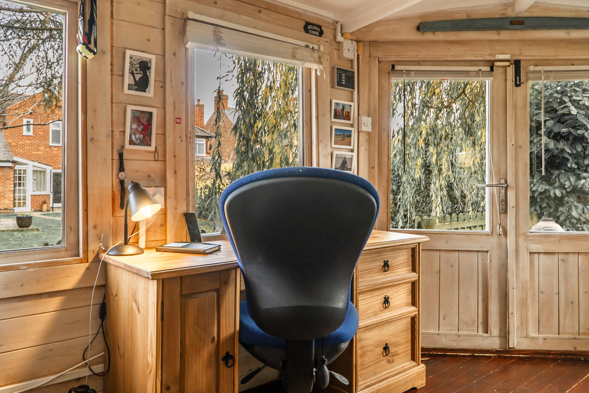 Outside, the rear garden is a private oasis, enclosed by walled and fenced boundaries and thoughtfully designed to offer multiple areas for relaxation and entertaining — including patio, lawn, seating, and decked areas. To the rear of the garden, a home office/outbuilding provides an ideal workspace or hobby room, alongside a large integral storage area.
