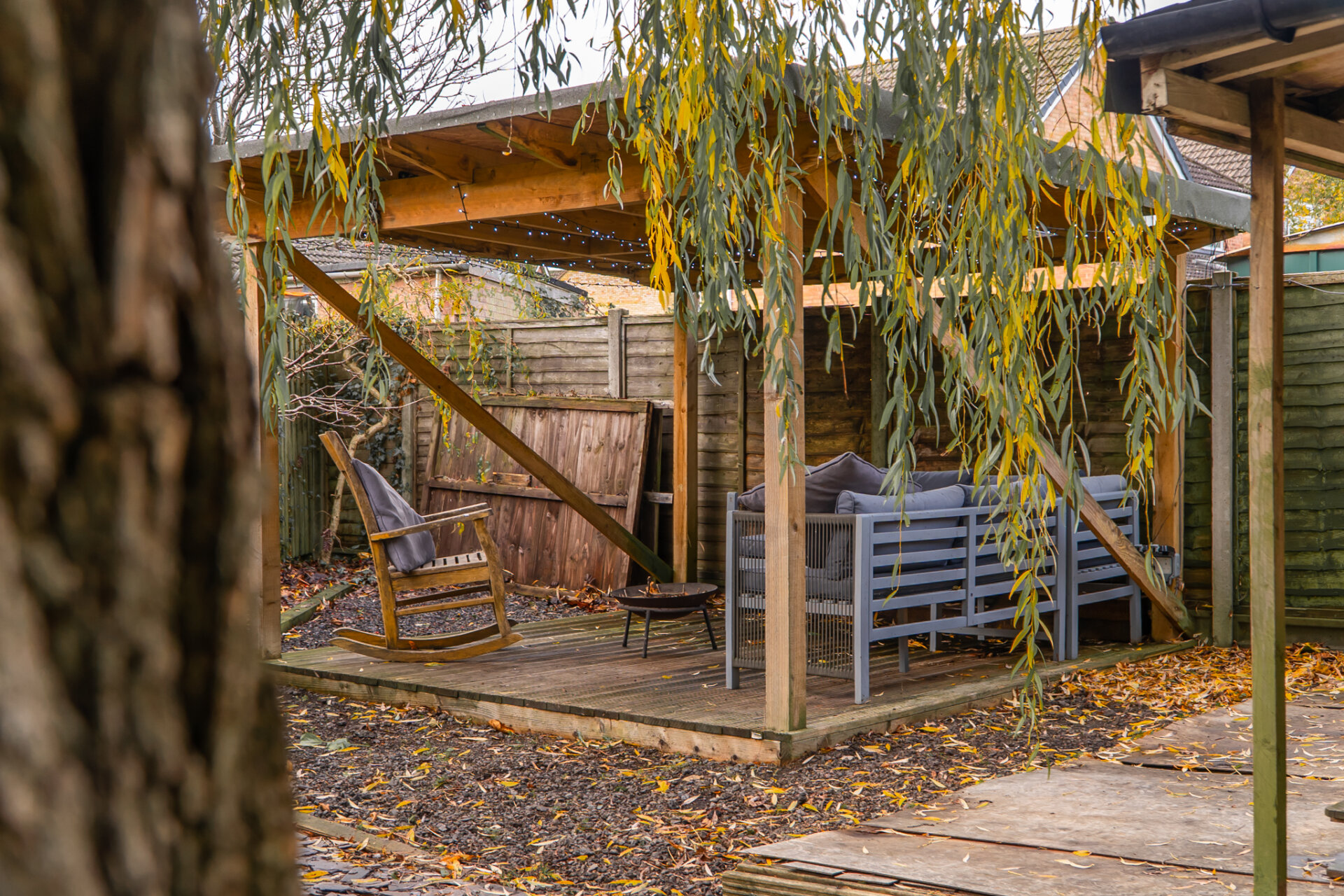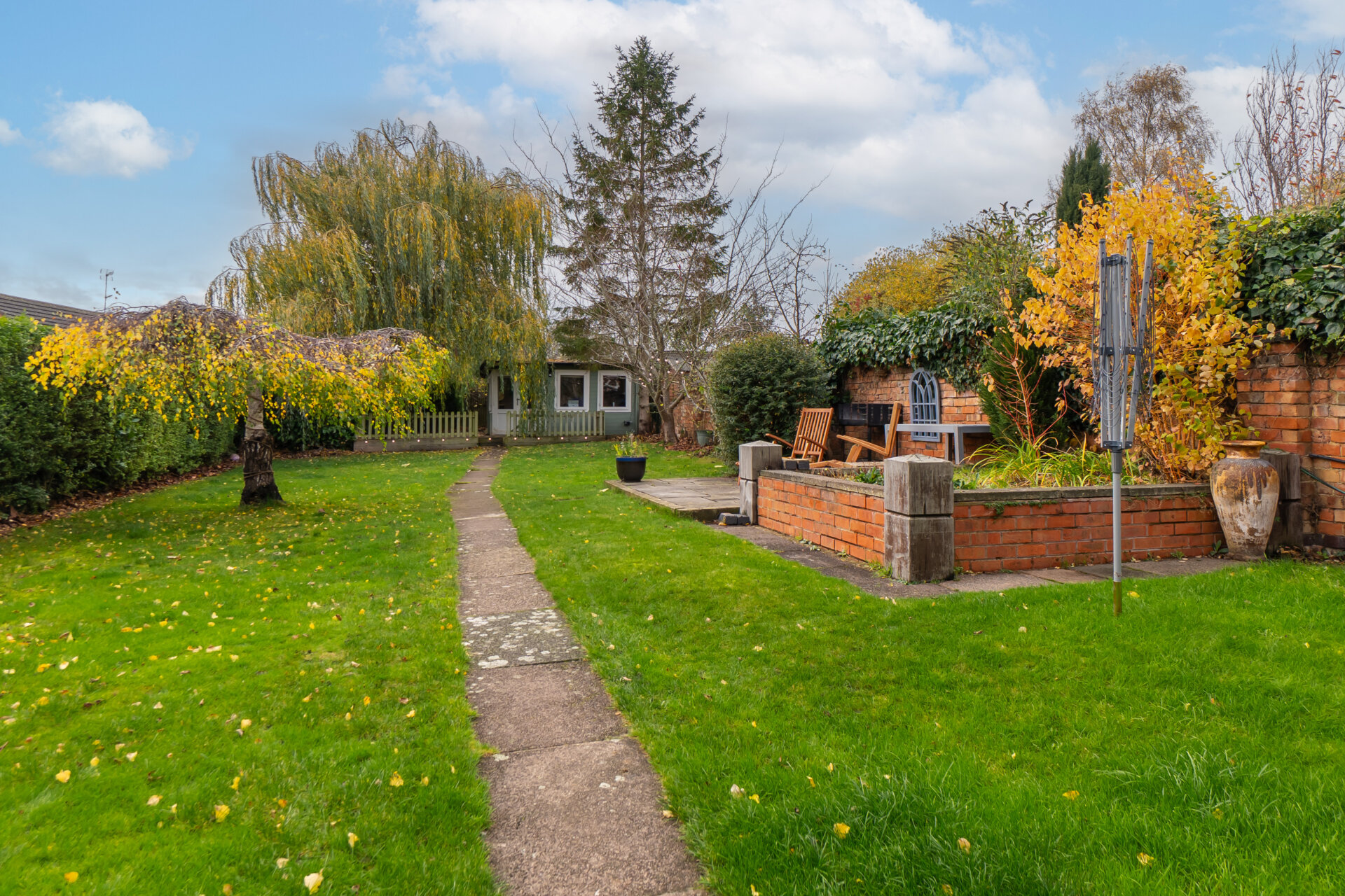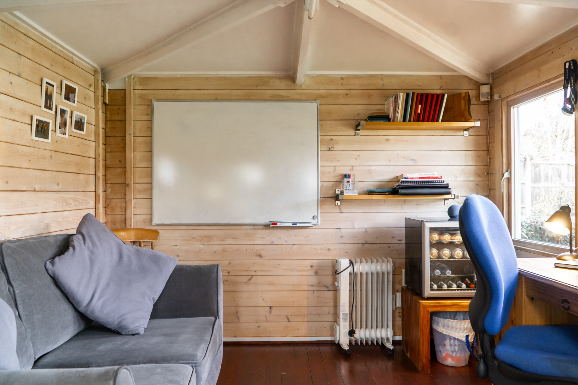 Outside, the rear garden is a private oasis, enclosed by walled and fenced boundaries and thoughtfully designed to offer multiple areas for relaxation and entertaining — including patio, lawn, seating, and decked areas. To the rear of the garden, a home office/outbuilding provides an ideal workspace or hobby room, alongside a large integral storage area.