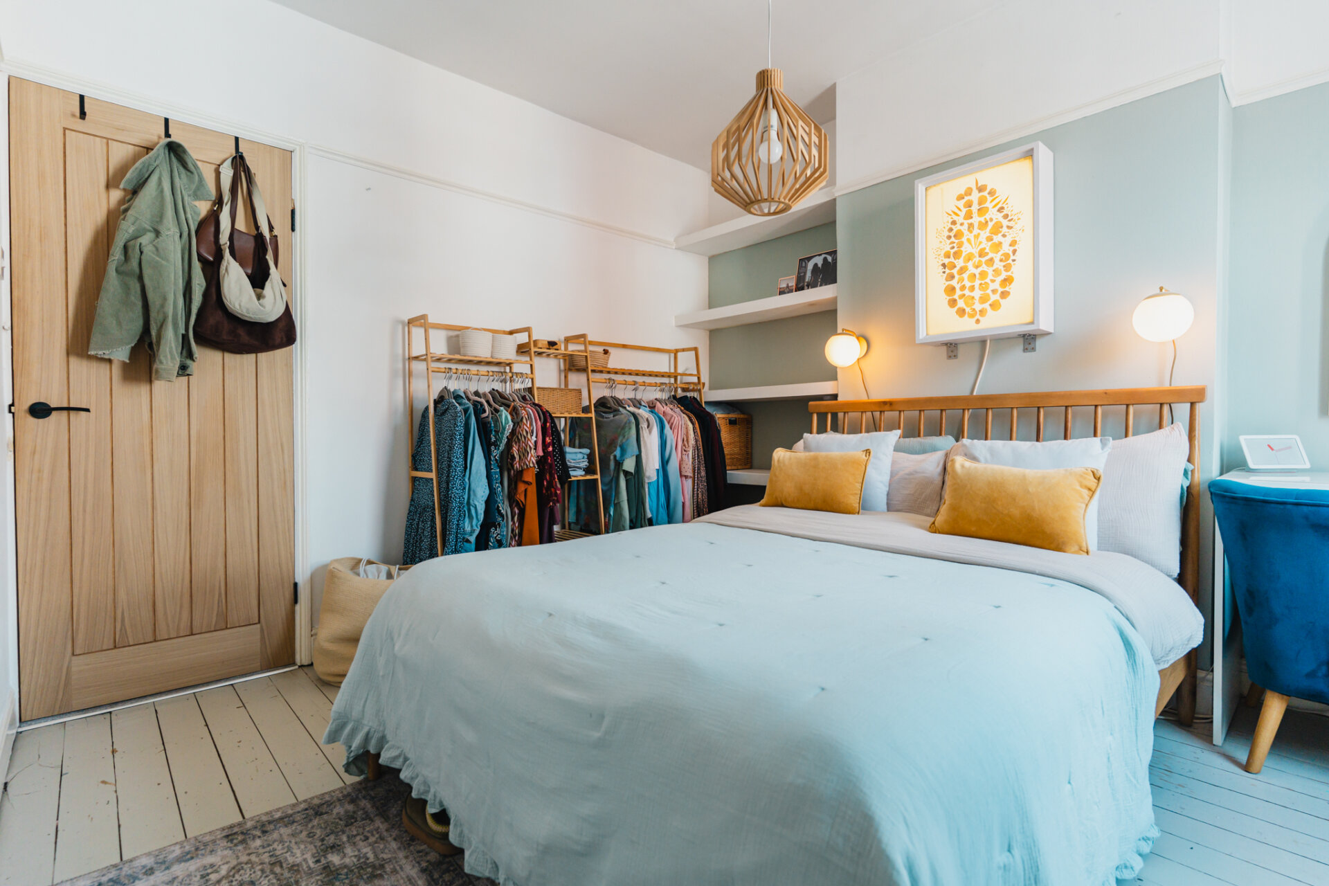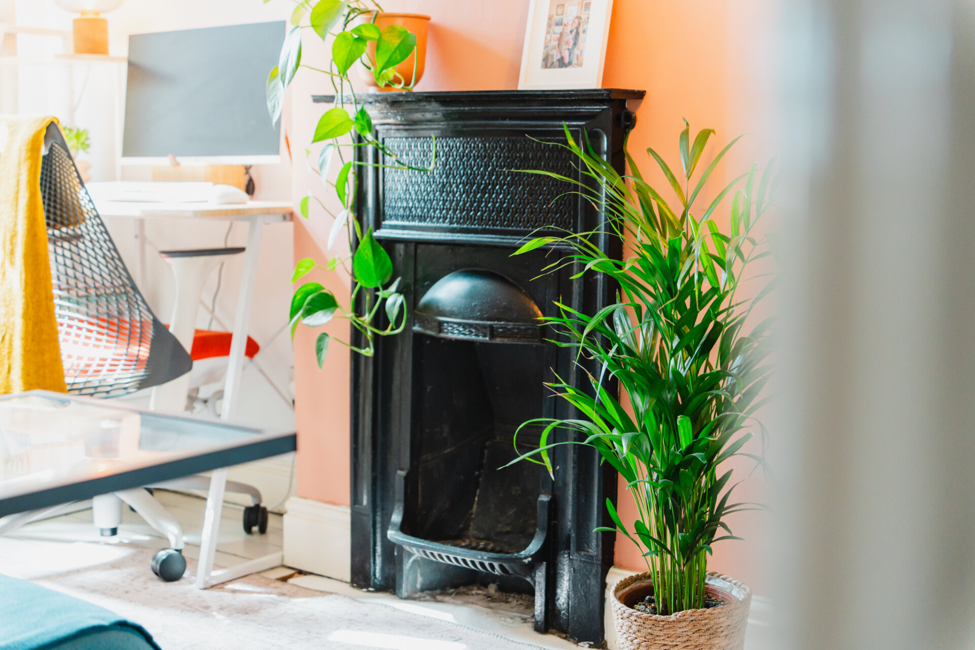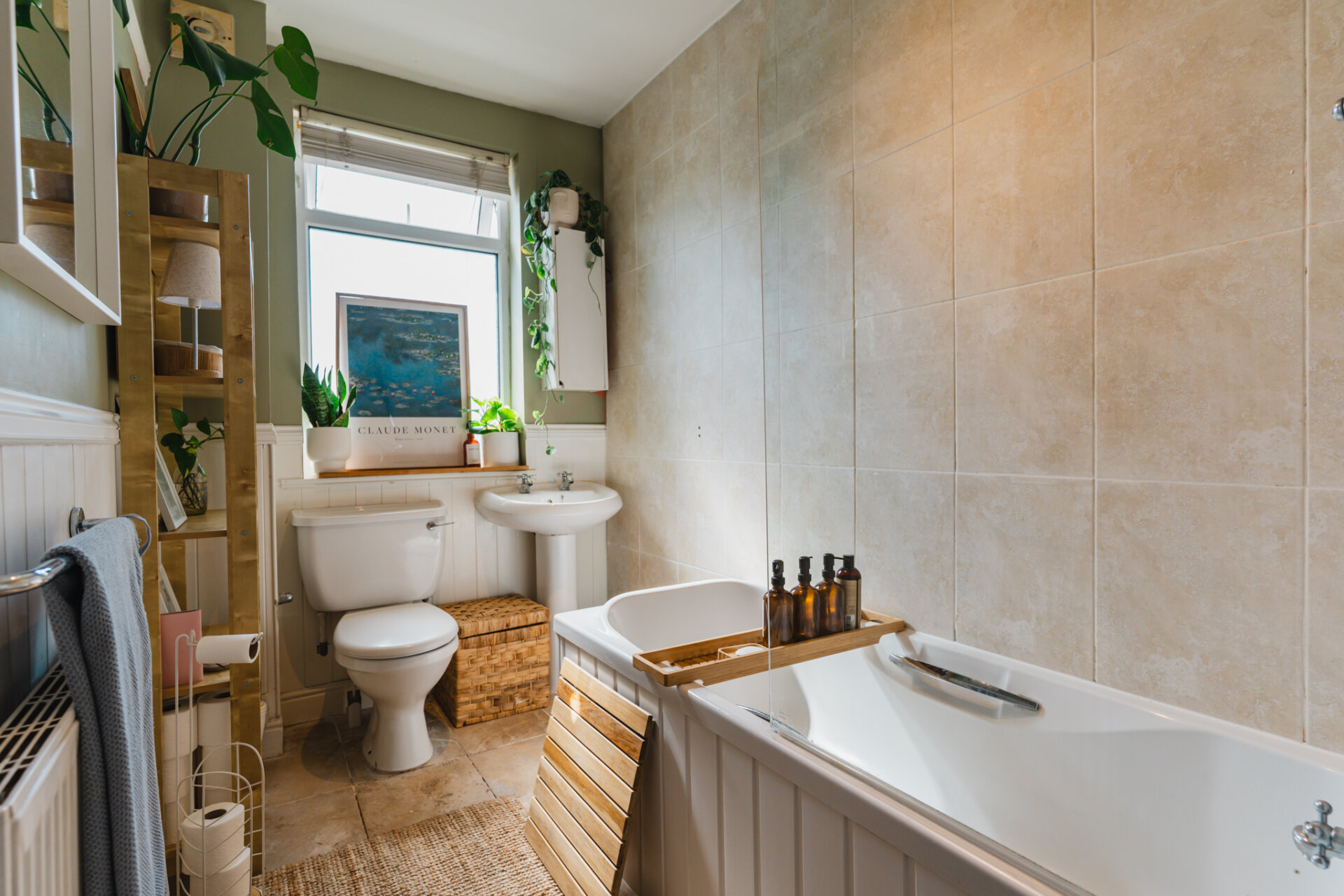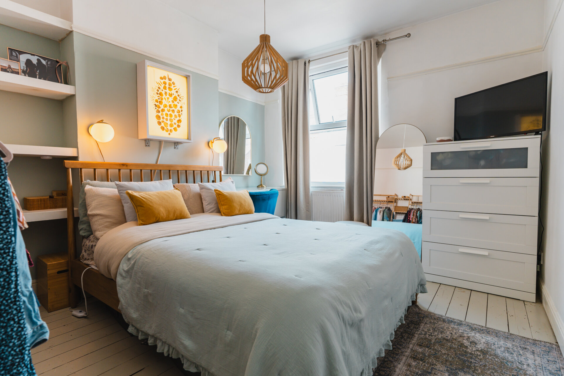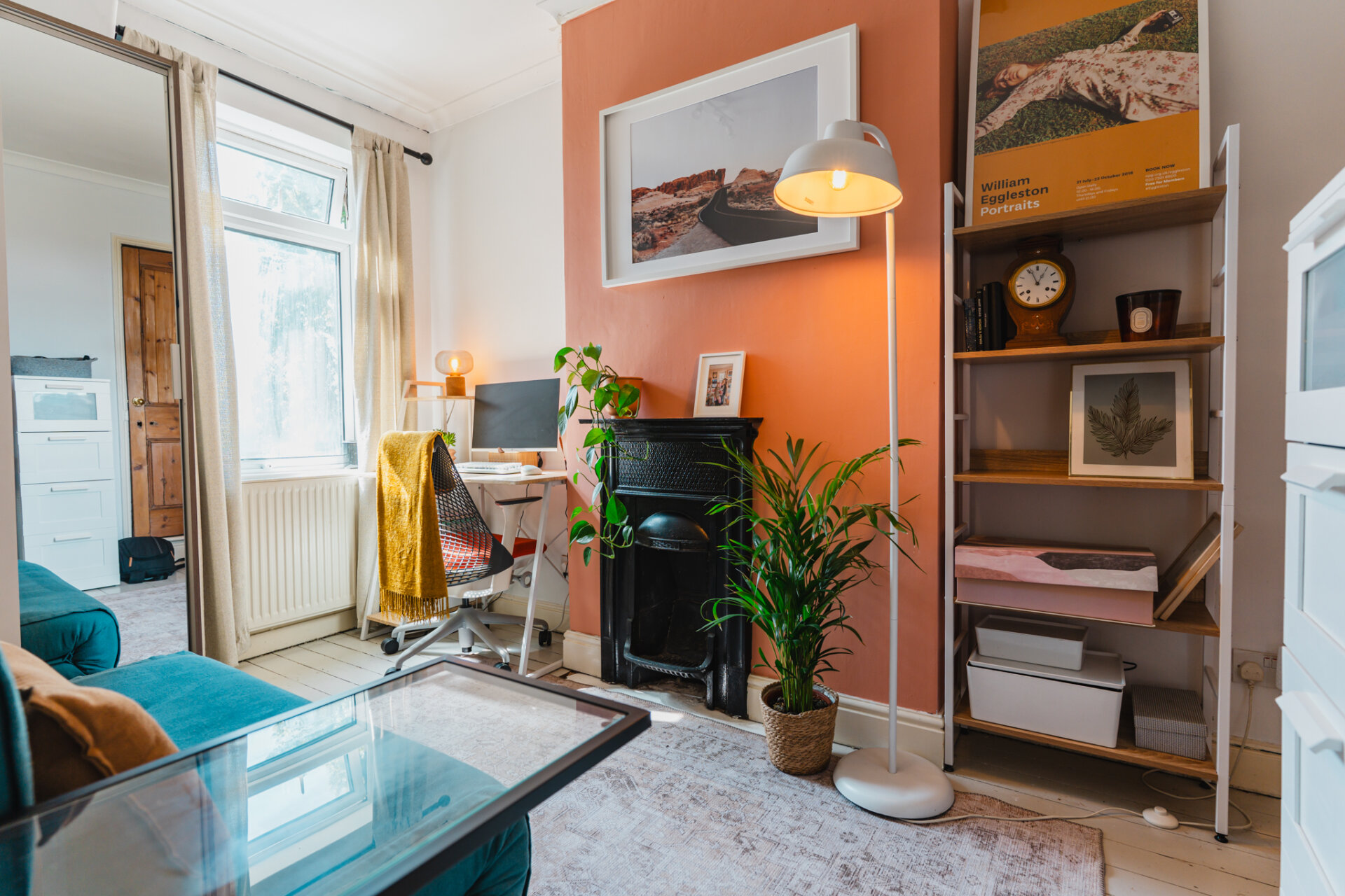 A central staircase ascends to a generous first-floor landing, where two double bedrooms and the main bathroom are positioned. Both bedrooms are elegantly presented, each with stripped timber floors and a distinctive sense of character. The principal bedroom, to the front, offers excellent proportions and retains a serene, pared-back aesthetic. The second bedroom, overlooking the garden, is painted in a rich burgundy and features a beautiful cast-iron fireplace — a nod to the home’s Victorian roots. The family bathroom has been fully renovated in a classic three-piece arrangement, with contemporary fixtures and a clean, considered finish.