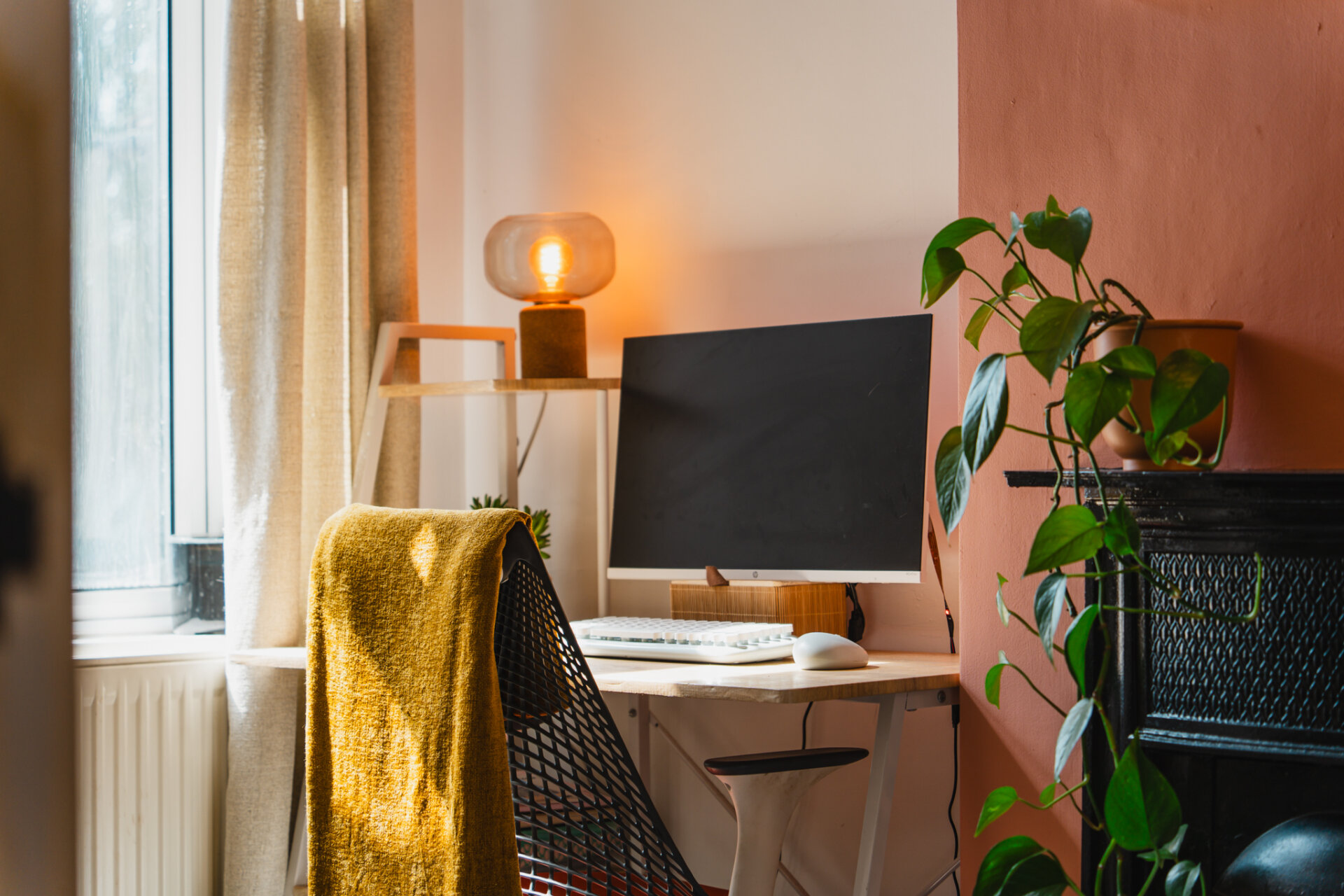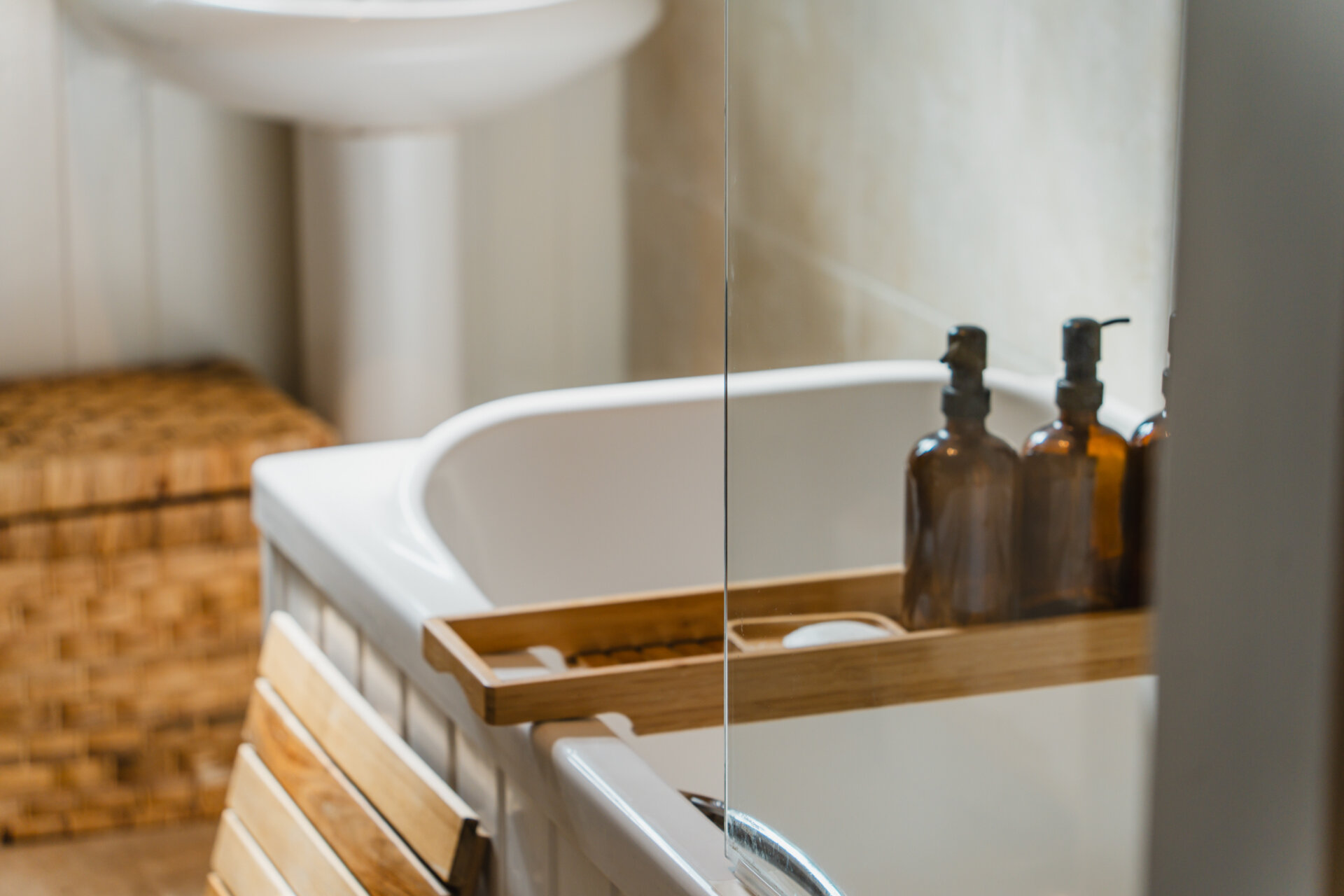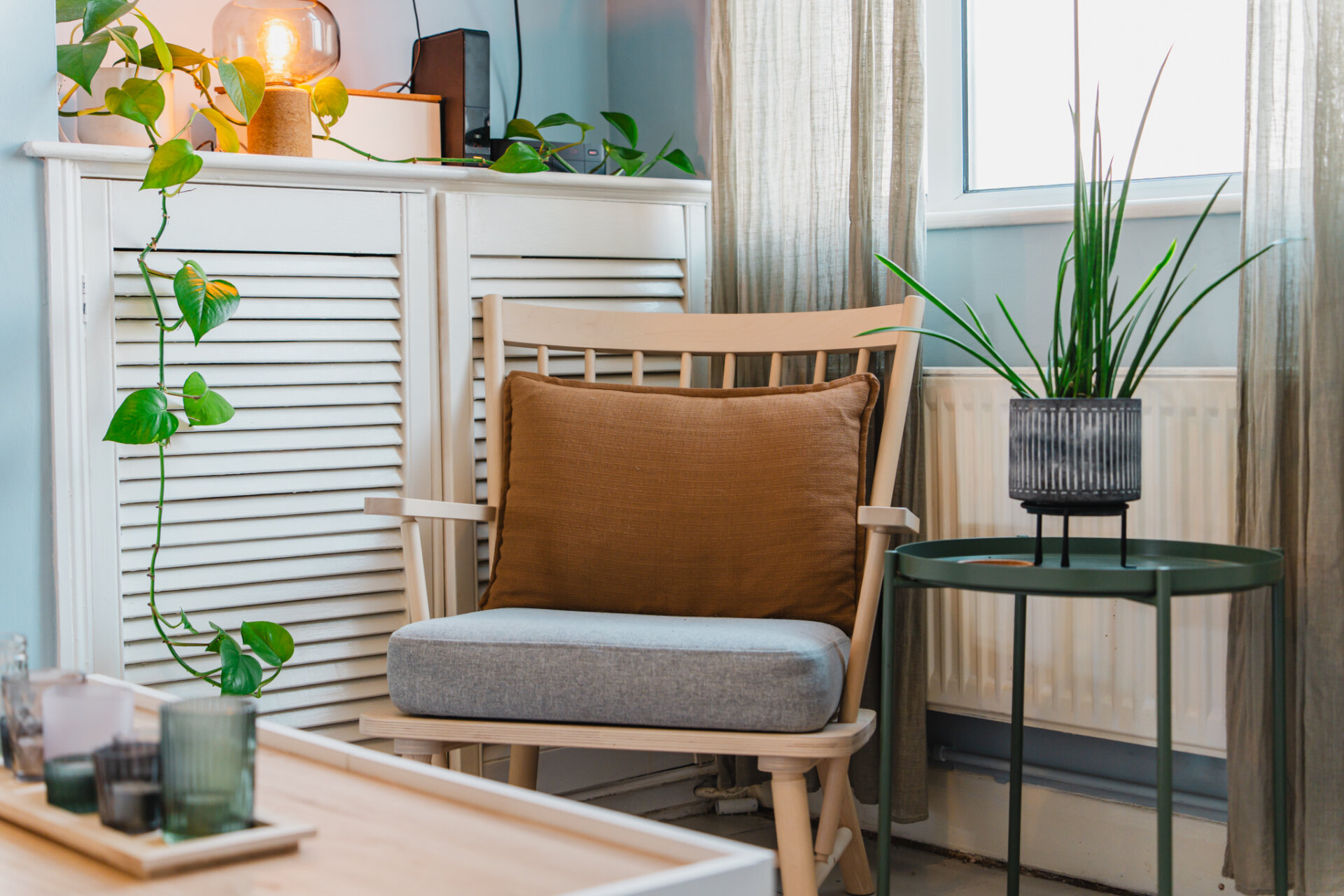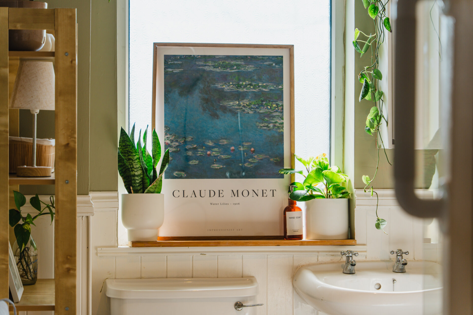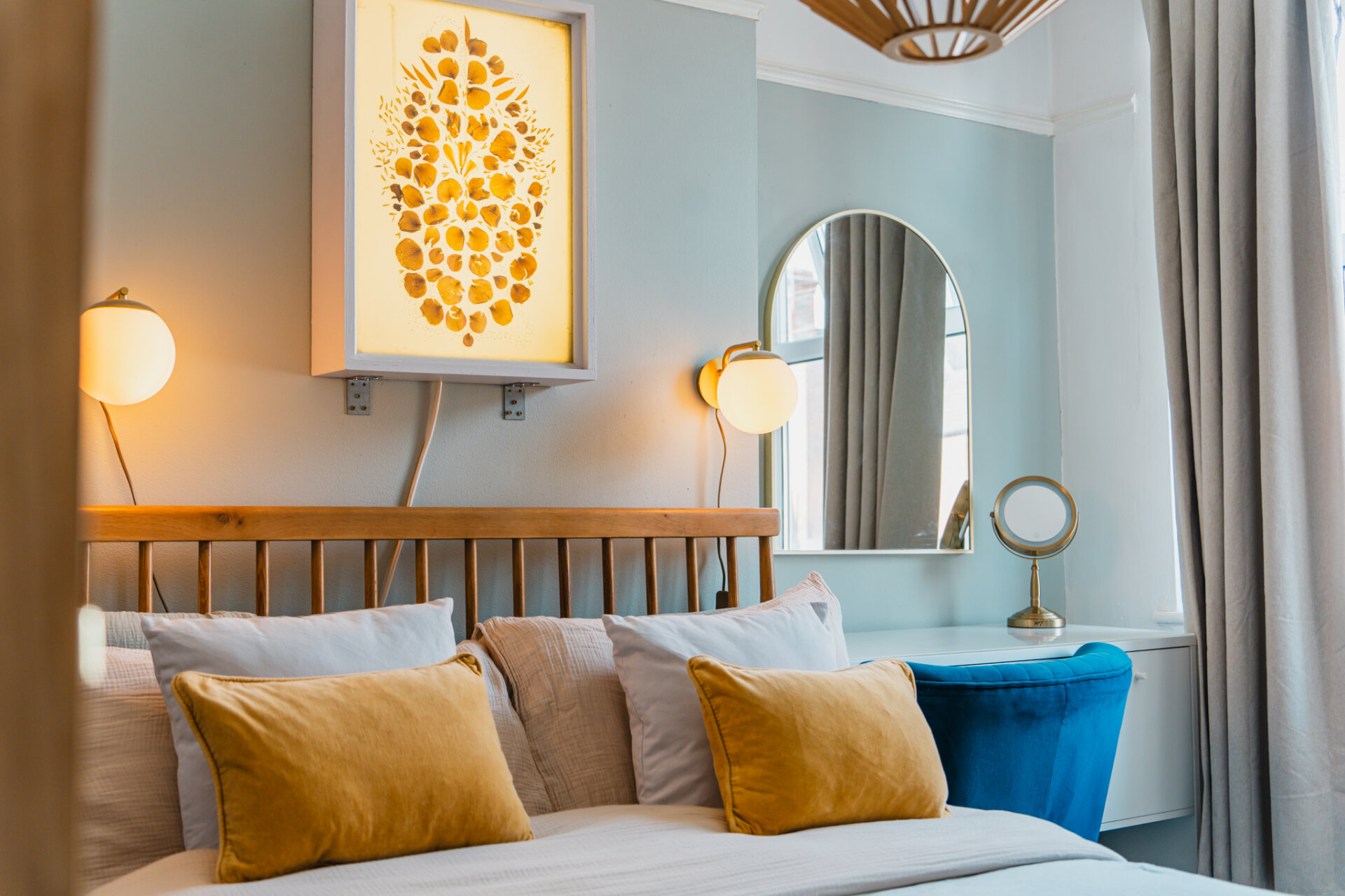 A central staircase ascends to a generous first-floor landing, where two double bedrooms and the main bathroom are positioned. Both bedrooms are elegantly presented, each with stripped timber floors and a distinctive sense of character. The principal bedroom, to the front, offers excellent proportions and retains a serene, pared-back aesthetic. The second bedroom, overlooking the garden, is painted in a rich burgundy and features a beautiful cast-iron fireplace — a nod to the home’s Victorian roots. The family bathroom has been fully renovated in a classic three-piece arrangement, with contemporary fixtures and a clean, considered finish.