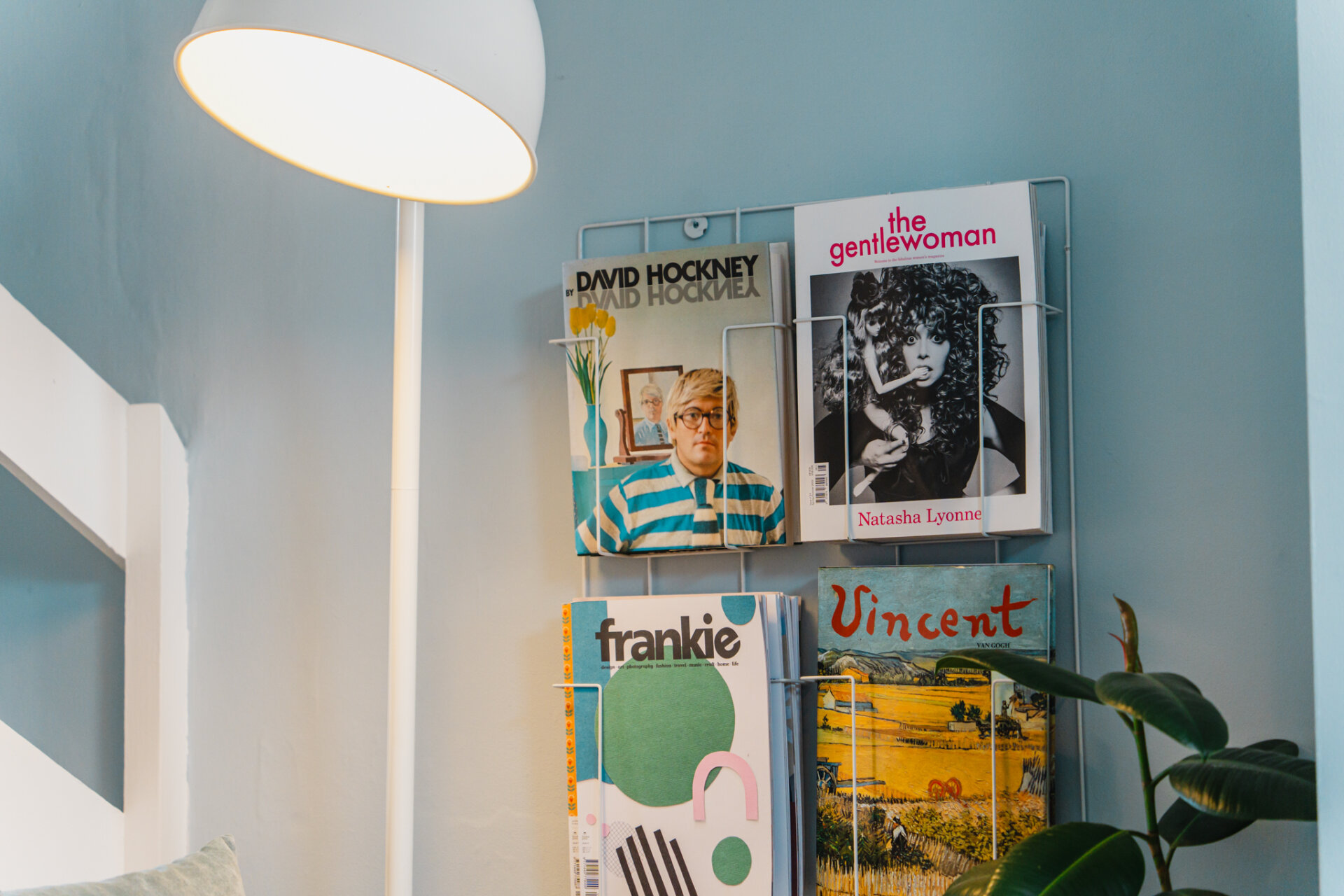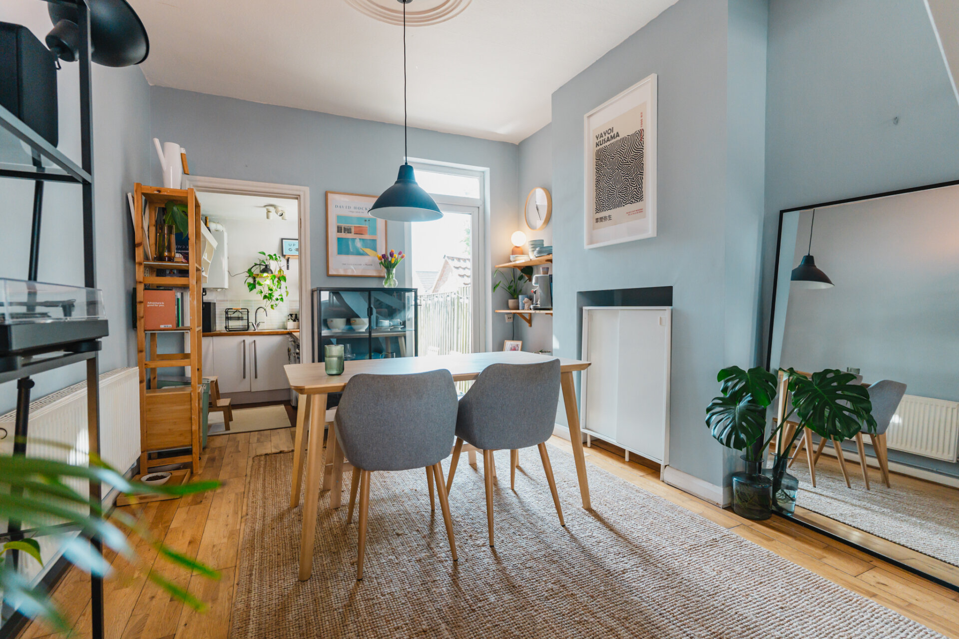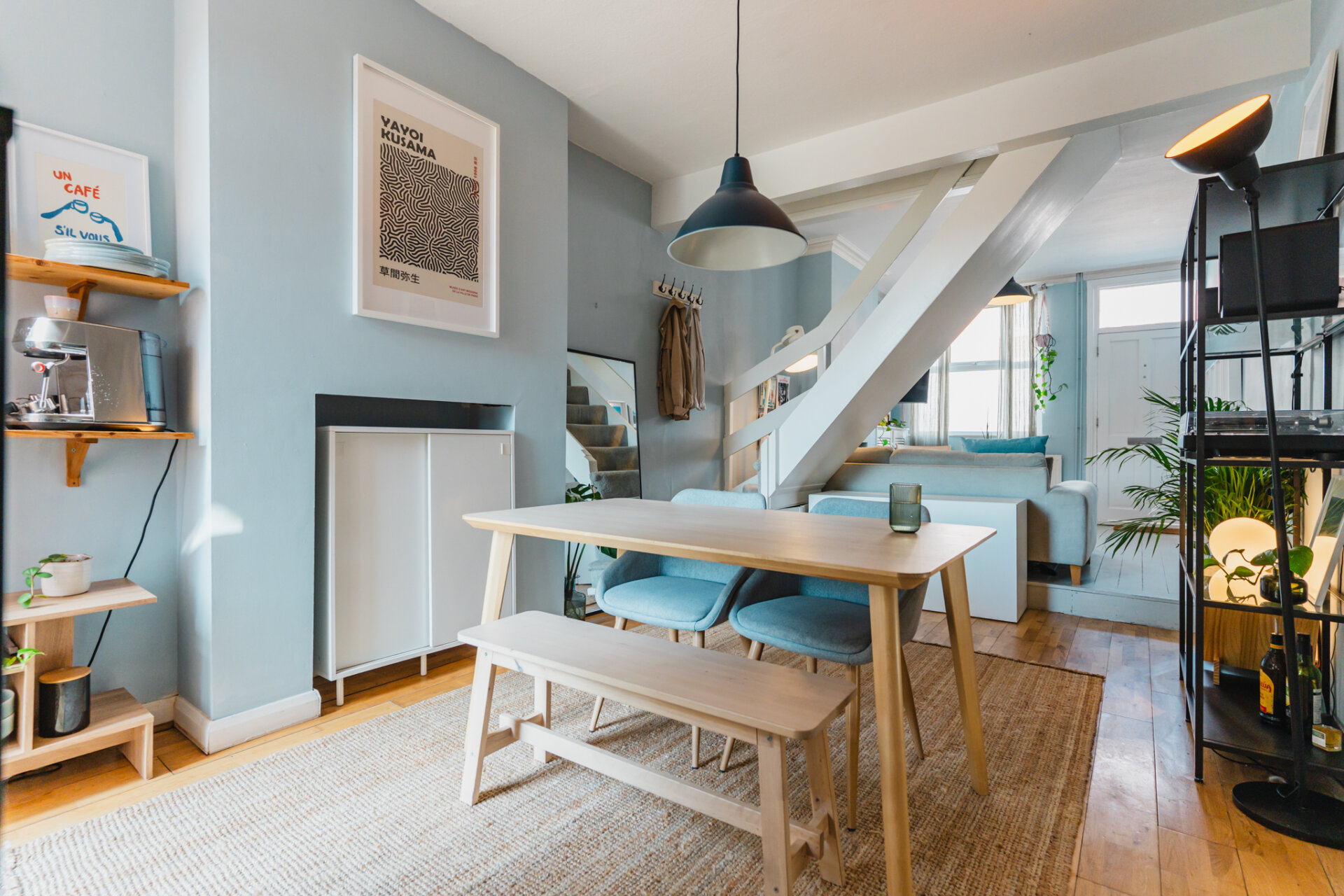 The façade retains its classic Victorian character, defined by red brickwork and a prominent large double-glazed window, which hints at the generous proportions found within. Entry is via a traditional timber door into a light and open reception area, where the front sitting and dining rooms have been subtly reconfigured to create a near open-plan living space. The room is flooded with light from the wide, double-glazed window, which faces the quiet residential street. Painted timber floorboards in a matte white finish run underfoot, offering both warmth and neutrality, while a soft baby-blue colour palette adds a gentle vibrancy to the walls. The resulting space is effortlessly adaptable.