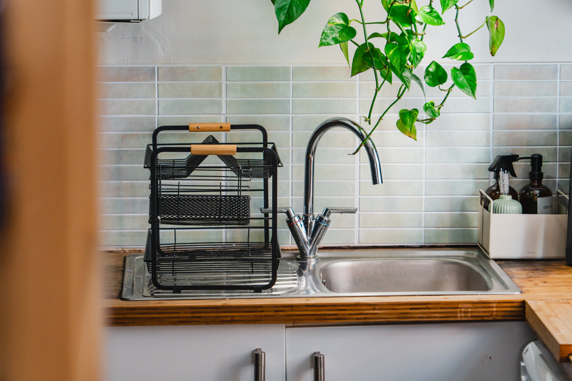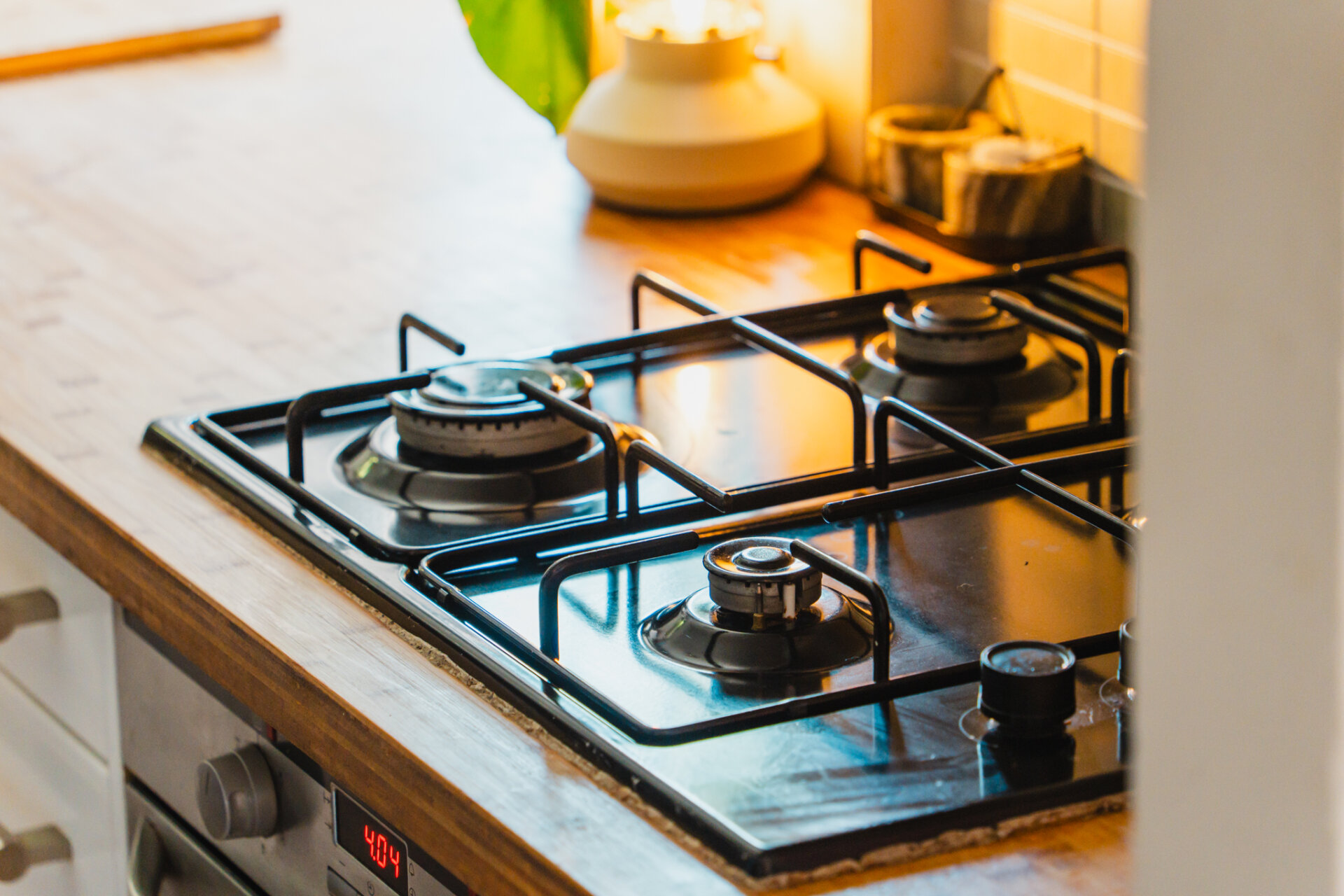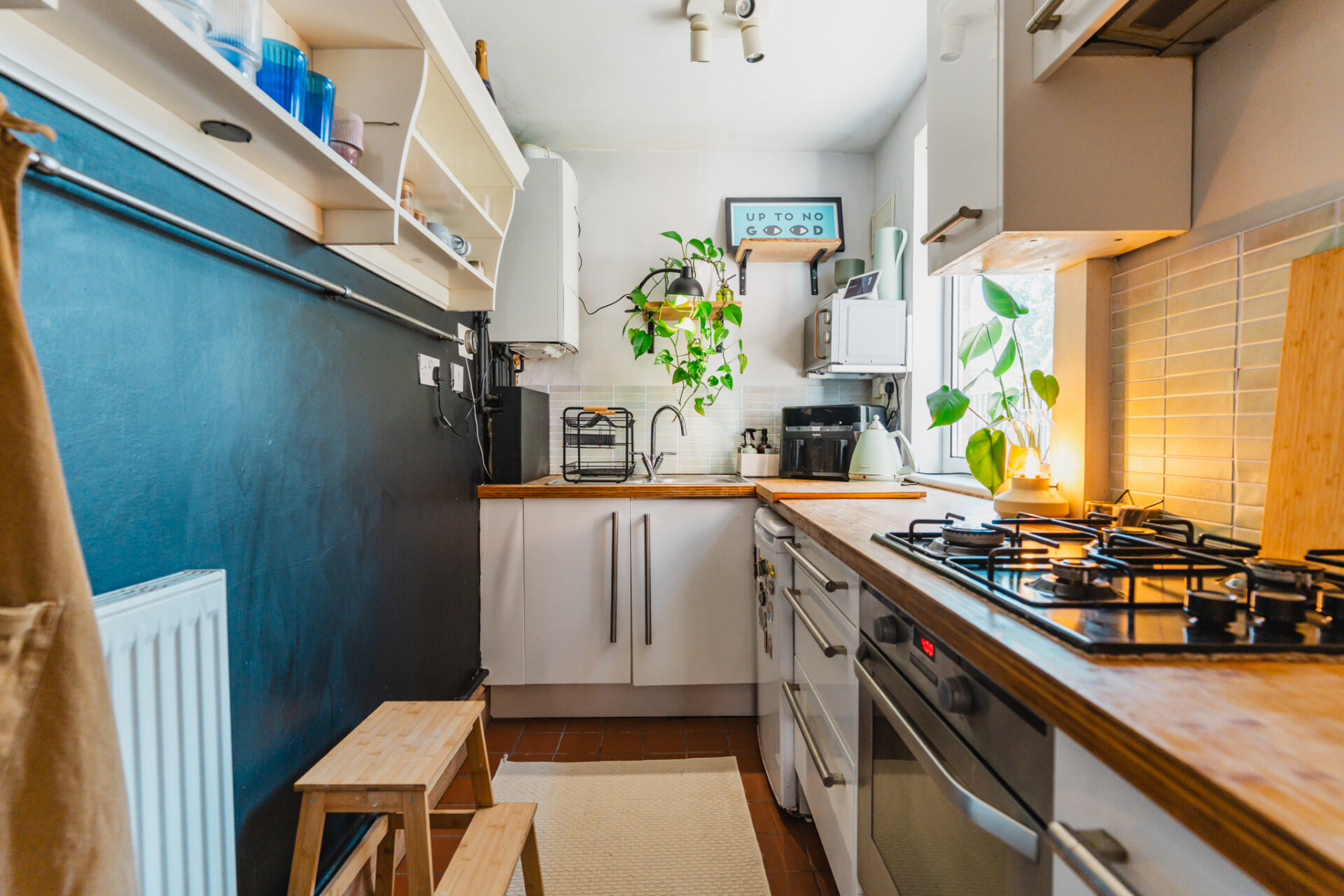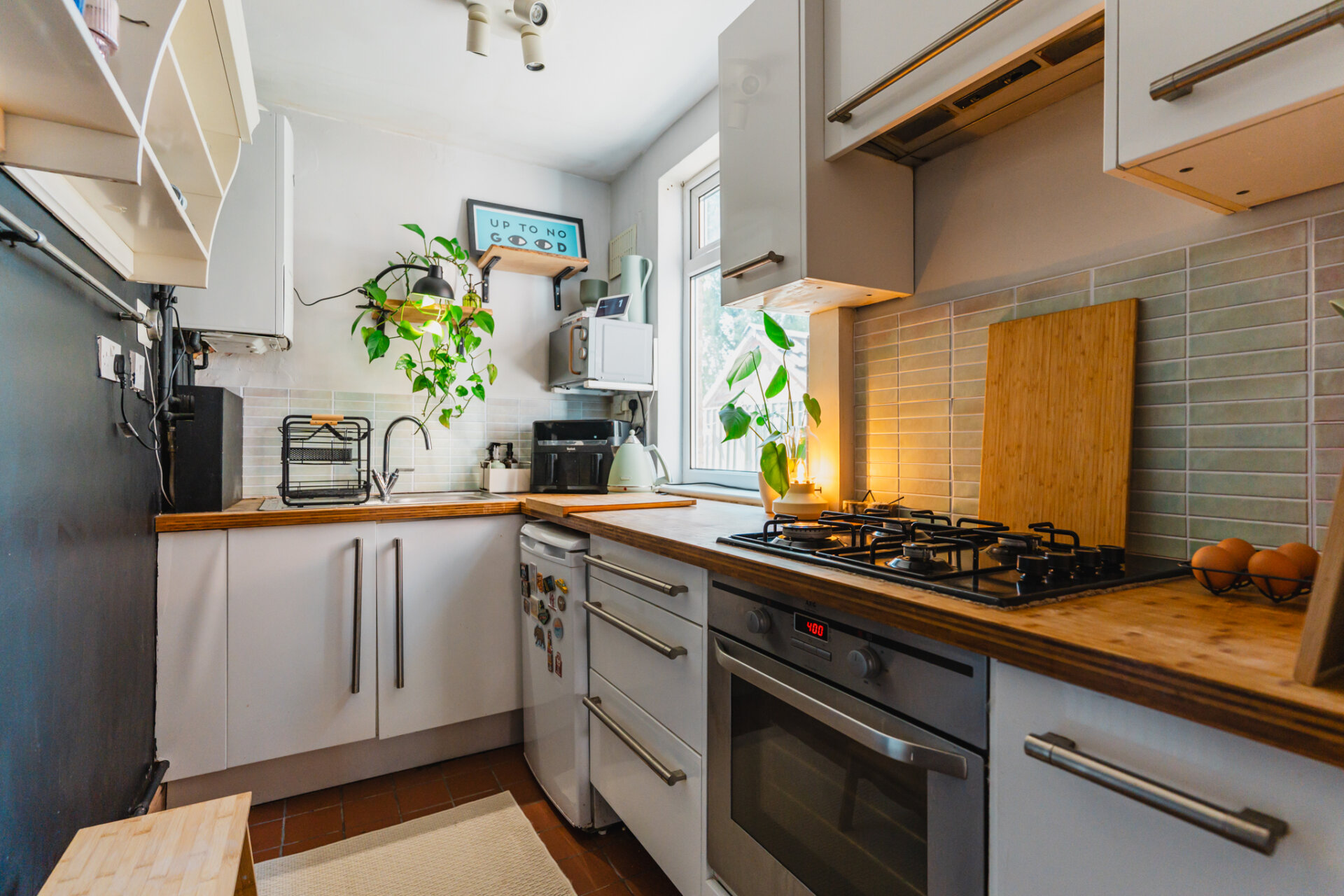 At the rear, French doors provide a graceful transition to the garden, drawing the eye towards the greenery beyond and reinforcing the home’s excellent natural flow. This leads to a beautifully appointed breakfast kitchen, located at the far end of the ground floor. Here, oak worktops bring a tactile warmth, balanced by crisp white cabinetry with matte detailing. There is ample space for appliances, and the arrangement is as practical as it is stylish, with a four-ring gas hob, integrated fridge-freezer, integrated oven, and a concealed extractor. Double-glazed windows overlook the garden, allowing light to pour into the space throughout the day.