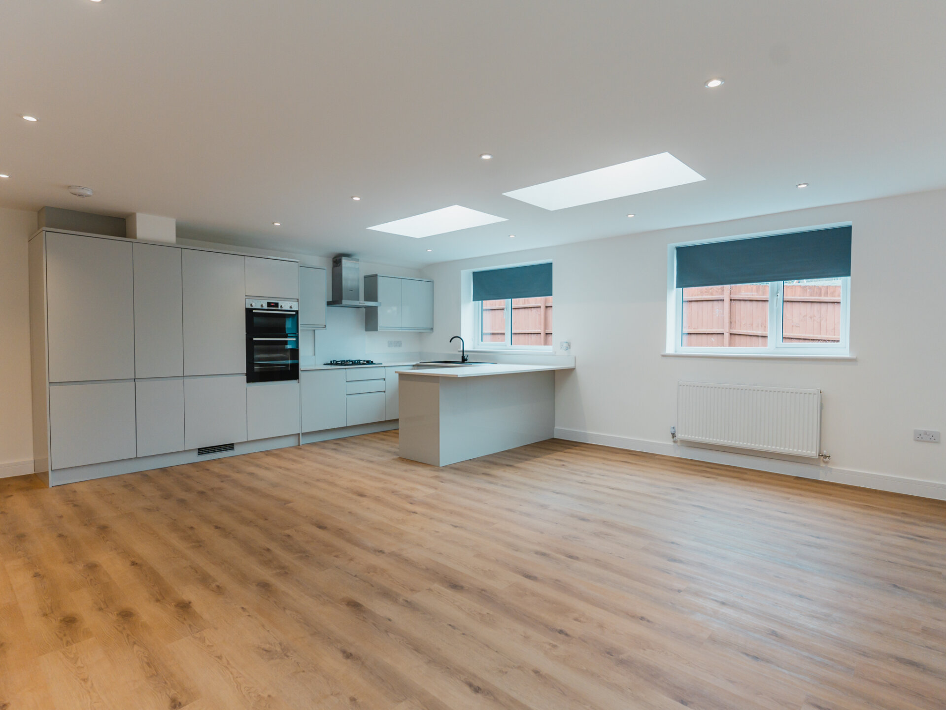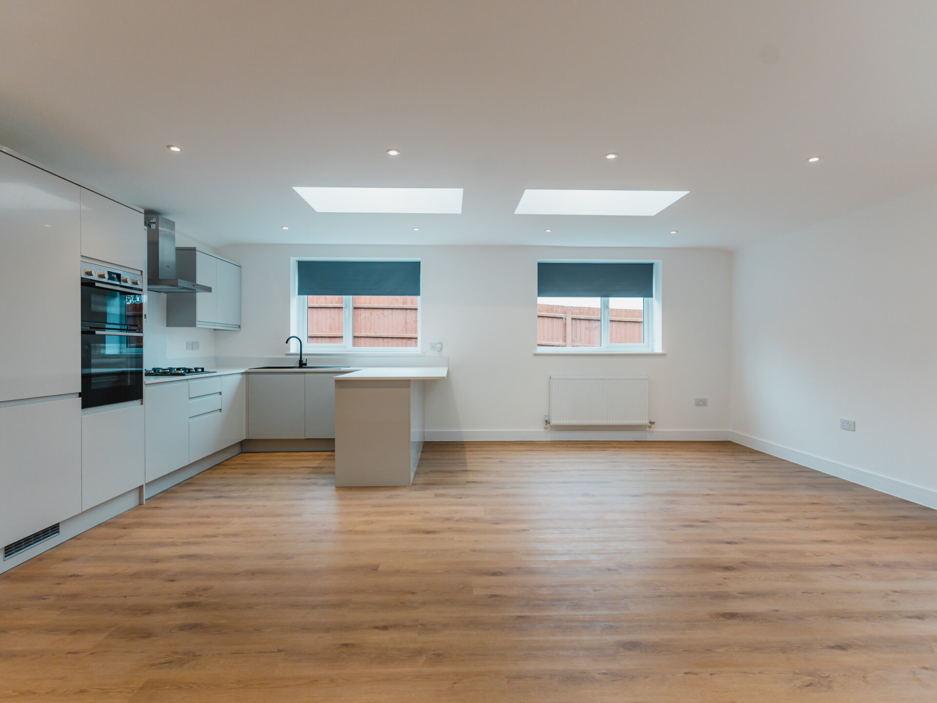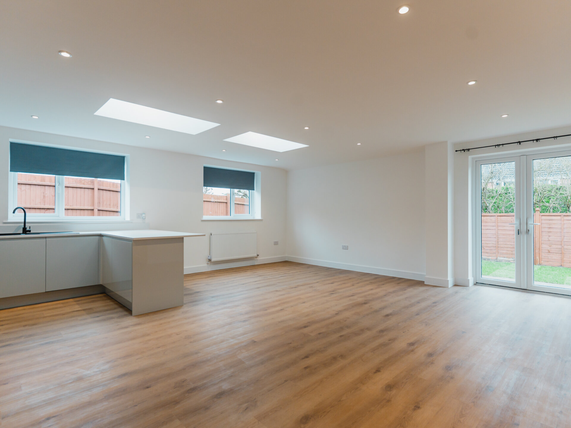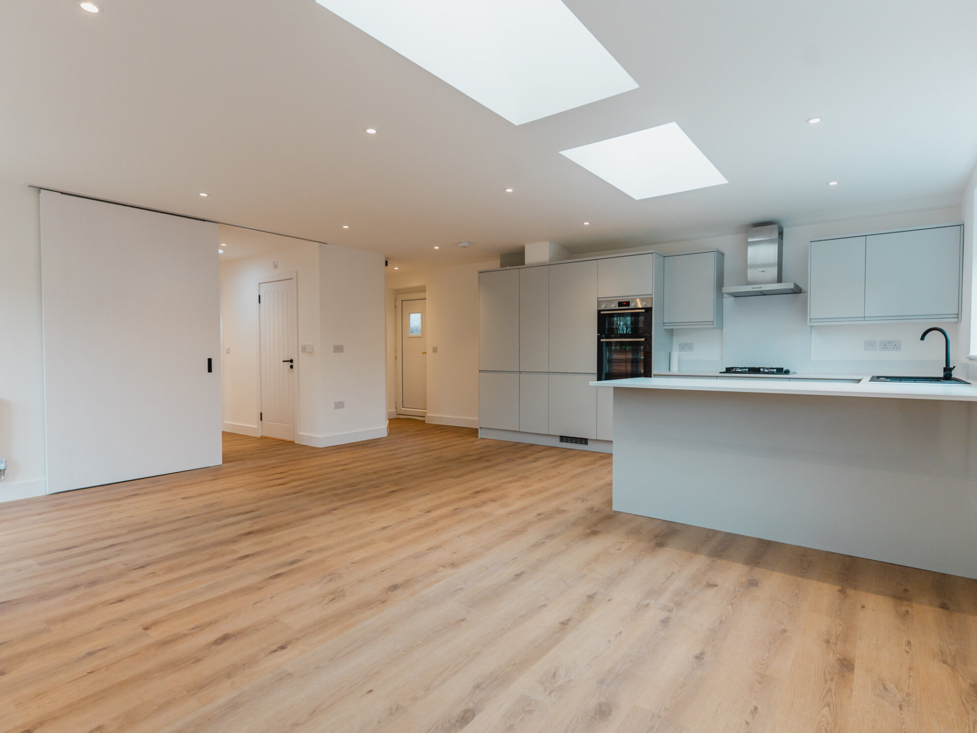 Entry to the home is via a wide entrance hallway with a sky lantern, providing access to both the living and bedroom quarters. Bright and airy, the property offers an immediate sense of space upon entering. The largest bedroom is well-equipped with a newly fitted, designer three-piece en-suite, with ample space for all necessary furniture, plush wool carpets and a large double-glazed bay-window to the front aspect. Two further well-proportioned bedrooms provide generous accommodation and offer dual-aspect double-glazed windows. To the rear, a light touch has been applied to the internal fittings, allowing the home’s materiality to take centre stage. Almost completely open-plan and separated by a sliding door, a seamless grey colour palette complements the bespoke kitchen, featuring solid worktops, luxury LVT flooring and two separate wide skylights. Integrated appliances include a fridge-freezer, dishwasher, four-ring gas hob and double oven. Newly installed double-glazed uPVC French doors provide convenient access and pleasant views onto the South-west-facing rear garden. A real sense of space is enjoyed here. The property is well equipped with a newly fitted Worcester combi-boiler with five years remaining on it’s warranty. A beautiful designer three-piece family bathroom with rainfall shower and separate w/c complete the accommodation.