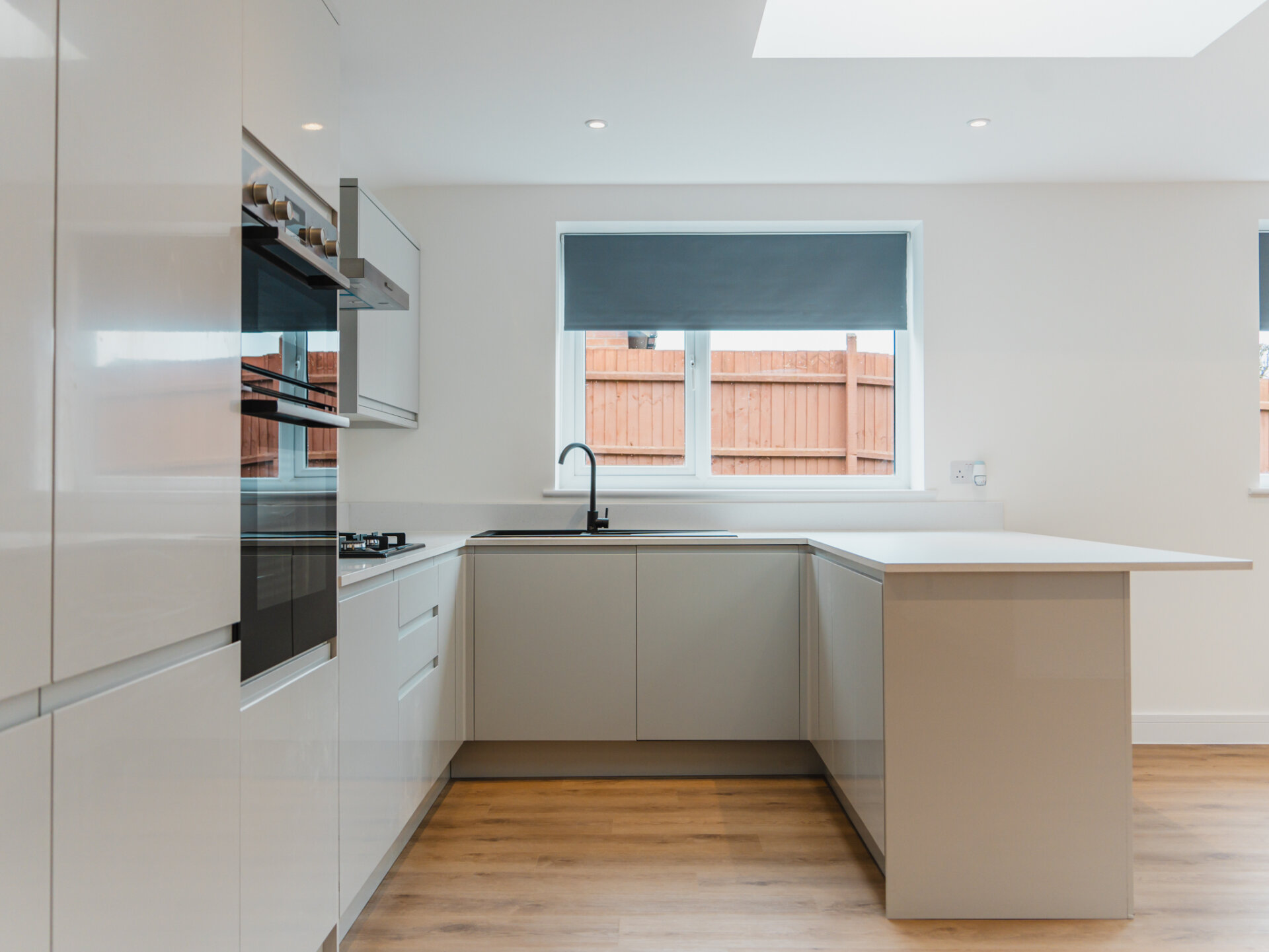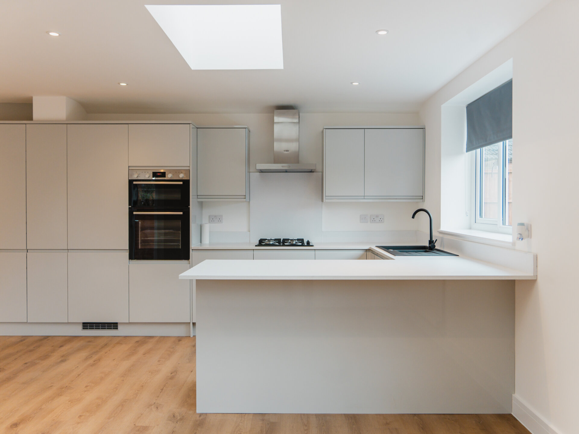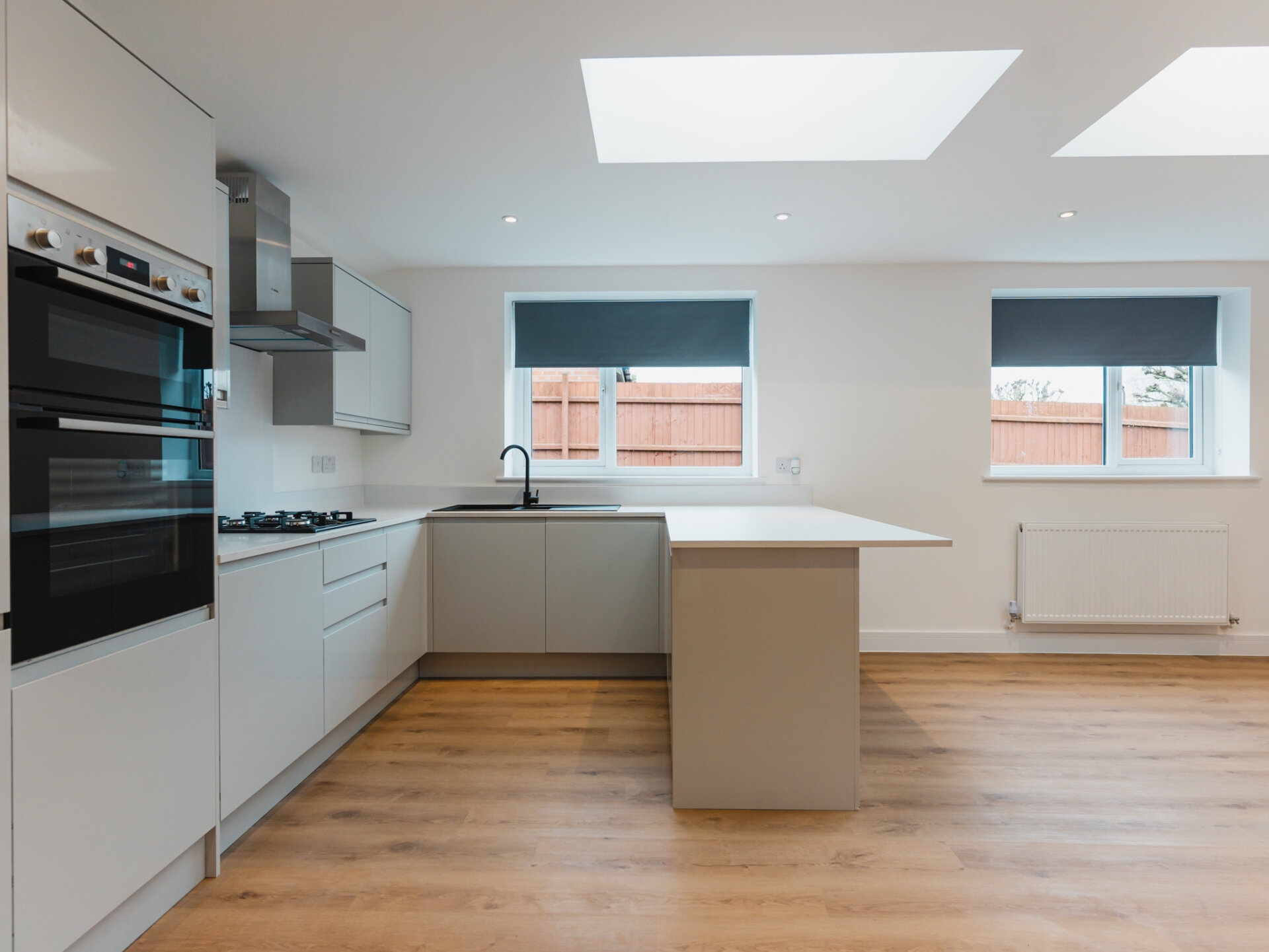 Entry to the home is via a wide entrance hallway with a sky lantern, providing access to both the living and bedroom quarters. Bright and airy, the property offers an immediate sense of space upon entering. The largest bedroom is well-equipped with a newly fitted, designer three-piece en-suite, with ample space for all necessary furniture, plush wool carpets and a large double-glazed bay-window to the front aspect. Two further well-proportioned bedrooms provide generous accommodation and offer dual-aspect double-glazed windows. To the rear, a light touch has been applied to the internal fittings, allowing the home’s materiality to take centre stage. Almost completely open-plan and separated by a sliding door, a seamless grey colour palette complements the bespoke kitchen, featuring solid worktops, luxury LVT flooring and two separate wide skylights. Integrated appliances include a fridge-freezer, dishwasher, four-ring gas hob and double oven. Newly installed double-glazed uPVC French doors provide convenient access and pleasant views onto the South-west-facing rear garden. A real sense of space is enjoyed here. The property is well equipped with a newly fitted Worcester combi-boiler with five years remaining on it’s warranty. A beautiful designer three-piece family bathroom with rainfall shower and separate w/c complete the accommodation.