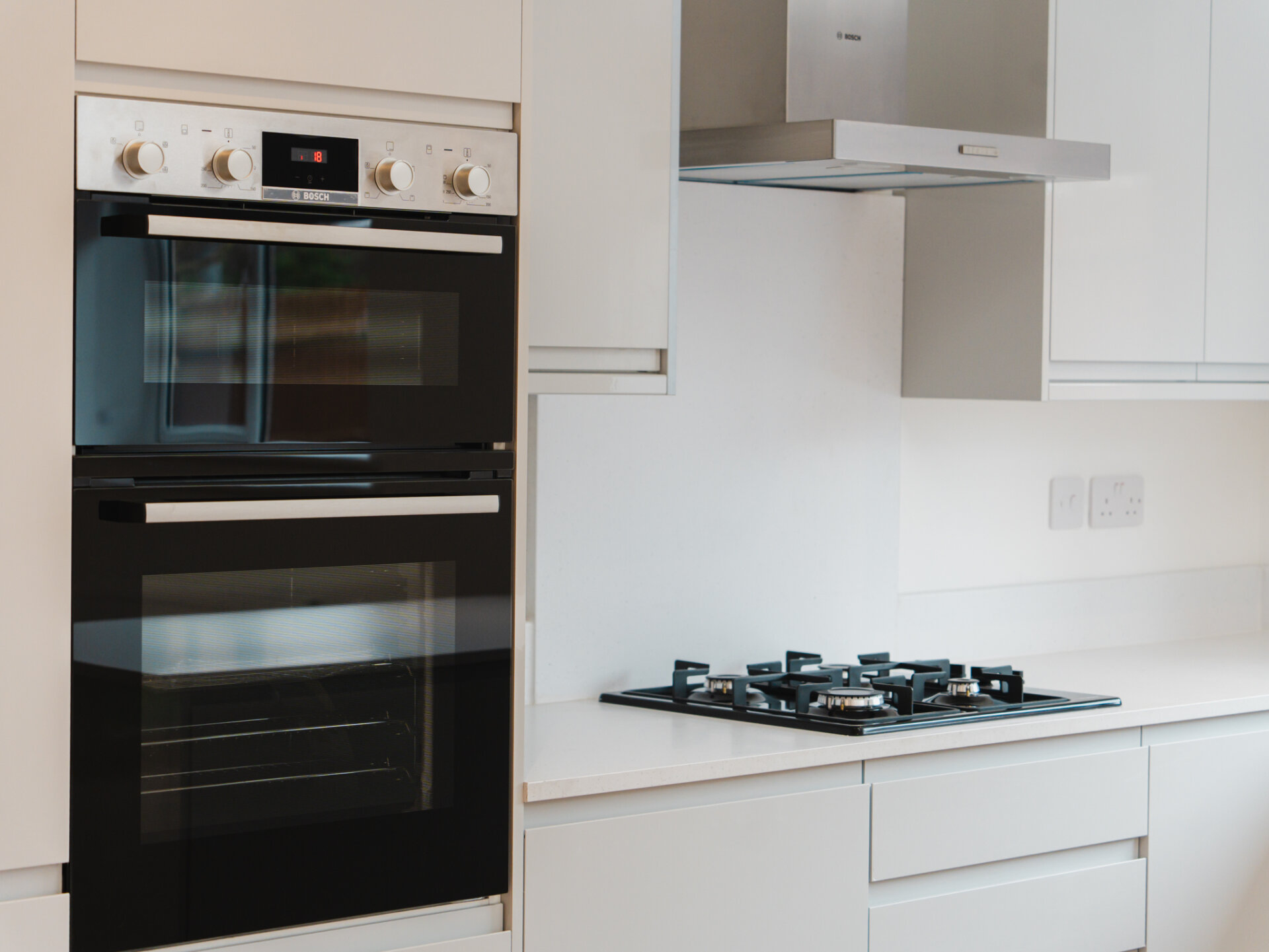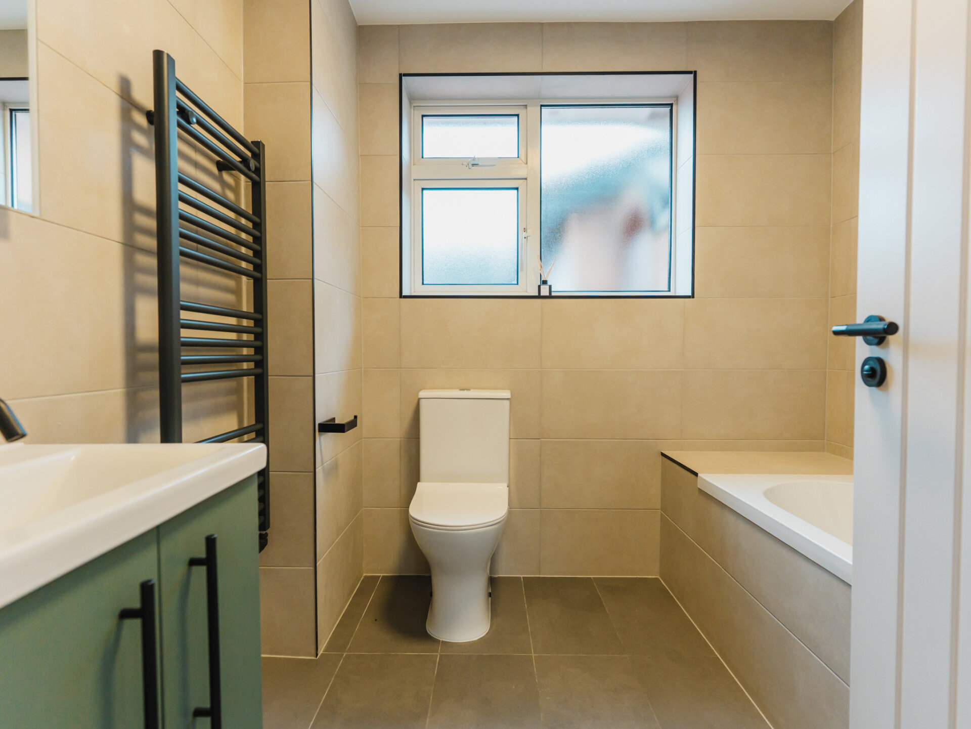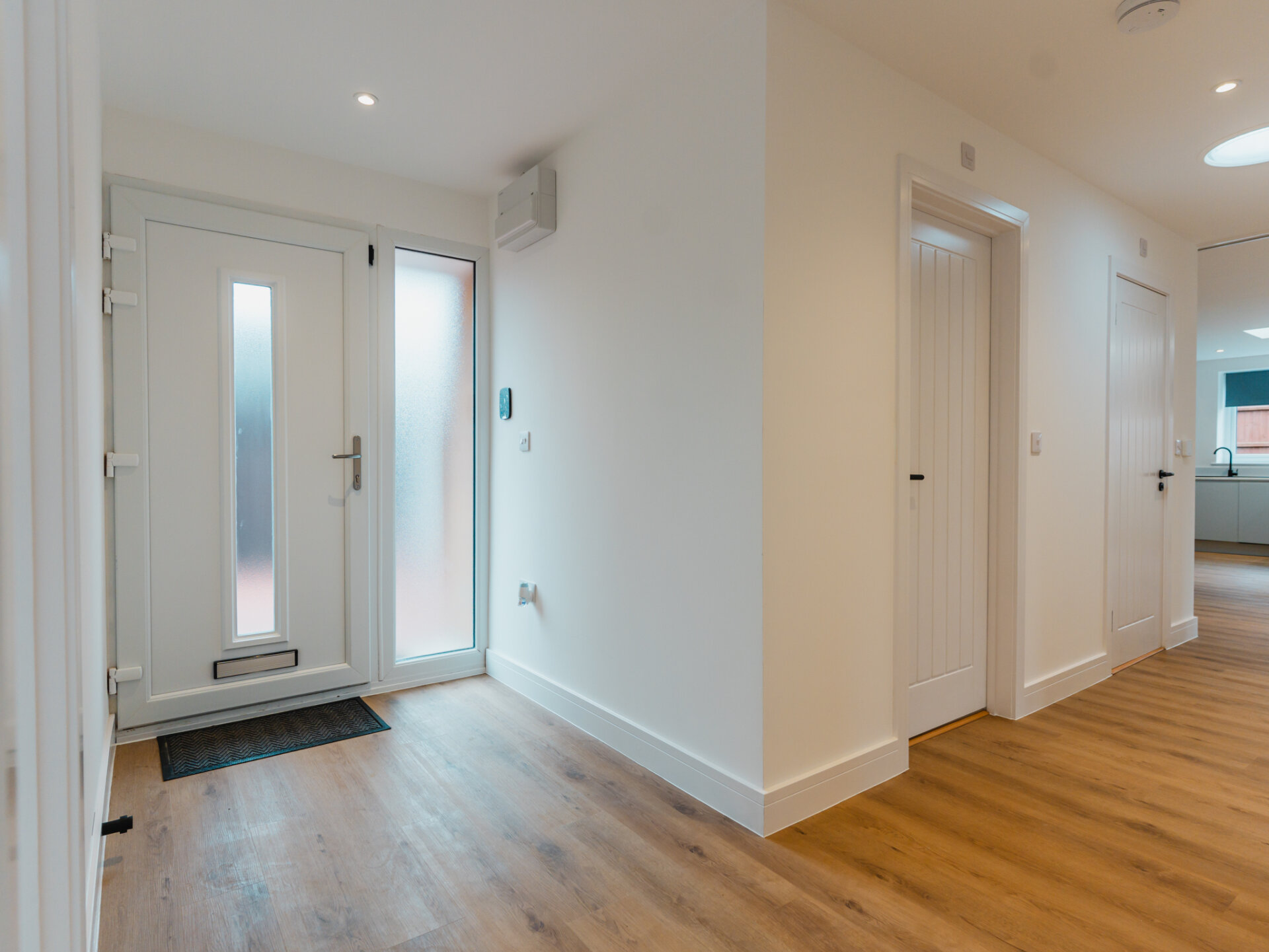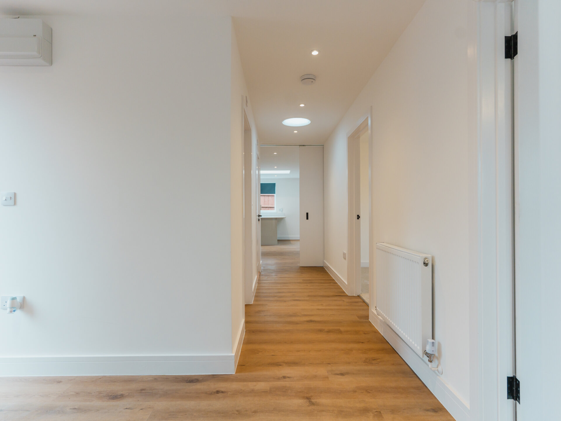 Entry to the home is via a wide entrance hallway with a sky lantern, providing access to both the living and bedroom quarters. Bright and airy, the property offers an immediate sense of space upon entering. The largest bedroom is well-equipped with a newly fitted, designer three-piece en-suite, with ample space for all necessary furniture, plush wool carpets and a large double-glazed bay-window to the front aspect. Two further well-proportioned bedrooms provide generous accommodation and offer dual-aspect double-glazed windows. To the rear, a light touch has been applied to the internal fittings, allowing the home’s materiality to take centre stage. Almost completely open-plan and separated by a sliding door, a seamless grey colour palette complements the bespoke kitchen, featuring solid worktops, luxury LVT flooring and two separate wide skylights. Integrated appliances include a fridge-freezer, dishwasher, four-ring gas hob and double oven. Newly installed double-glazed uPVC French doors provide convenient access and pleasant views onto the South-west-facing rear garden. A real sense of space is enjoyed here. The property is well equipped with a newly fitted Worcester combi-boiler with five years remaining on it’s warranty. A beautiful designer three-piece family bathroom with rainfall shower and separate w/c complete the accommodation.