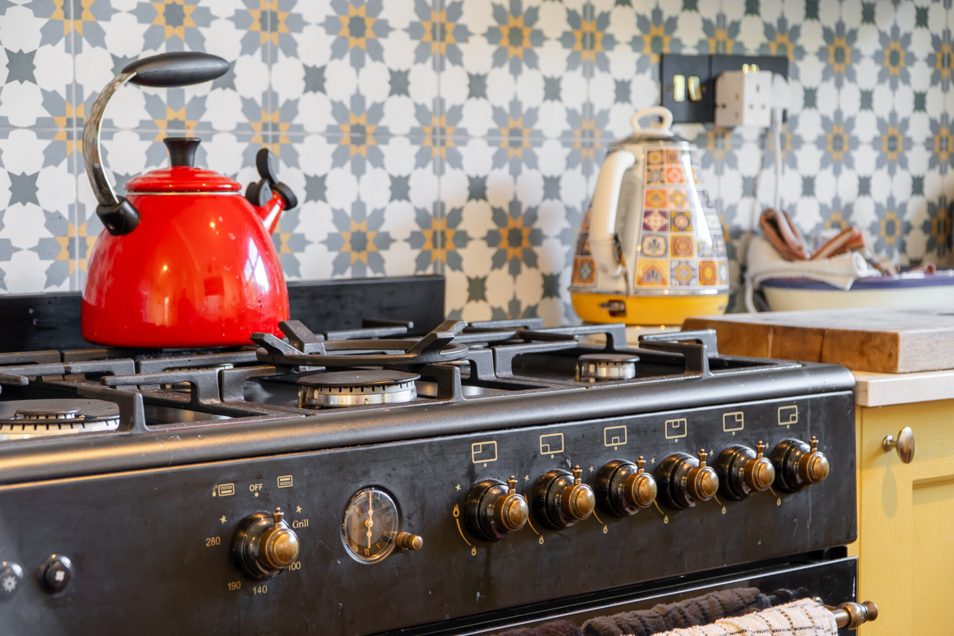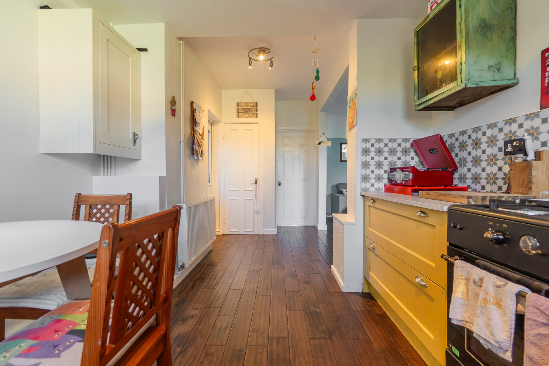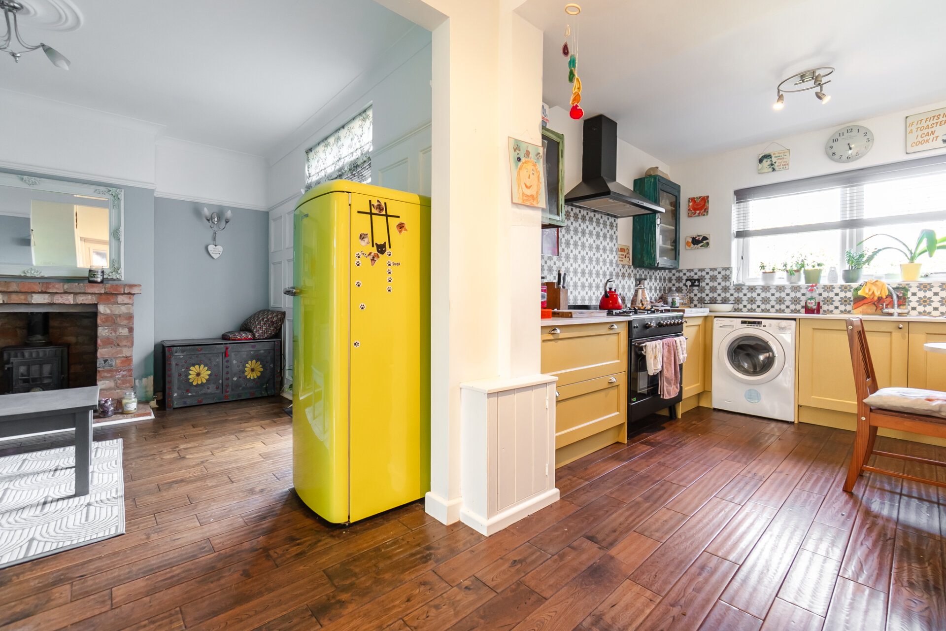 The kitchen is a particularly joyful expression of the home’s personality. Arranged in a practical layout, it combines sensibility with playful detailing: warm yellow cabinetry, patterned tiled splashbacks and open shelving create a layered feel. A range cooker anchors the space, while a large window above the sink draws in garden views and daylight throughout the day. There is room for dining, reinforcing the kitchen’s role as the social heart of the home. A wide opening connects back to the living space, allowing for an easy, sociable flow.