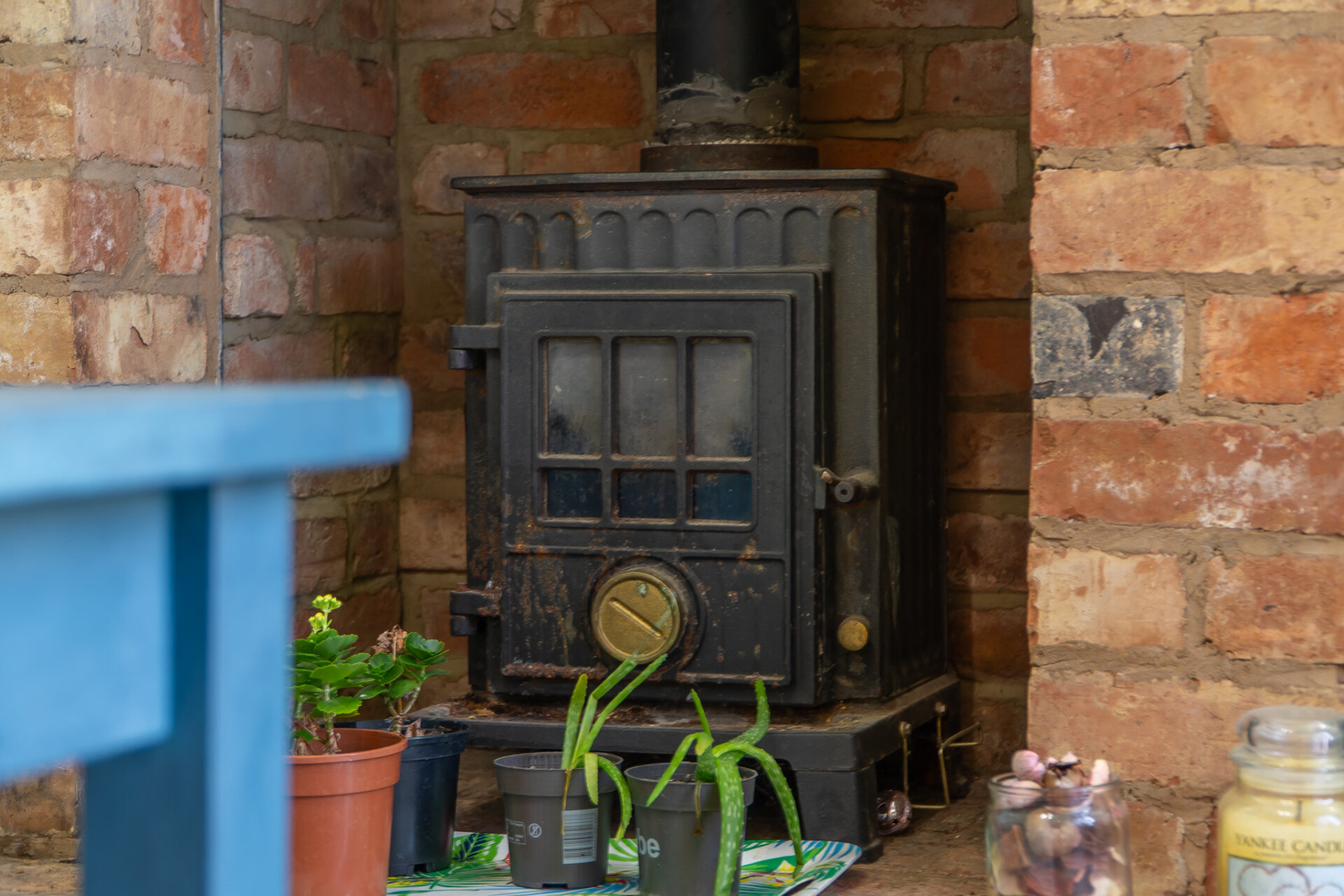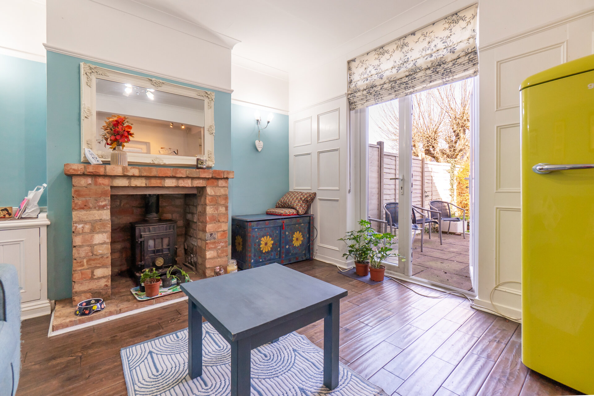 To the rear, a second reception room has been arranged as an additional living space. Here, a wood-burning fire is set within an exposed brick chimney breast, introducing both texture and a natural focal point. Painted panelling and soft tonal colours enhance the sense of chill. With doors leading onto the rear garden, perfect for summer evenings.
