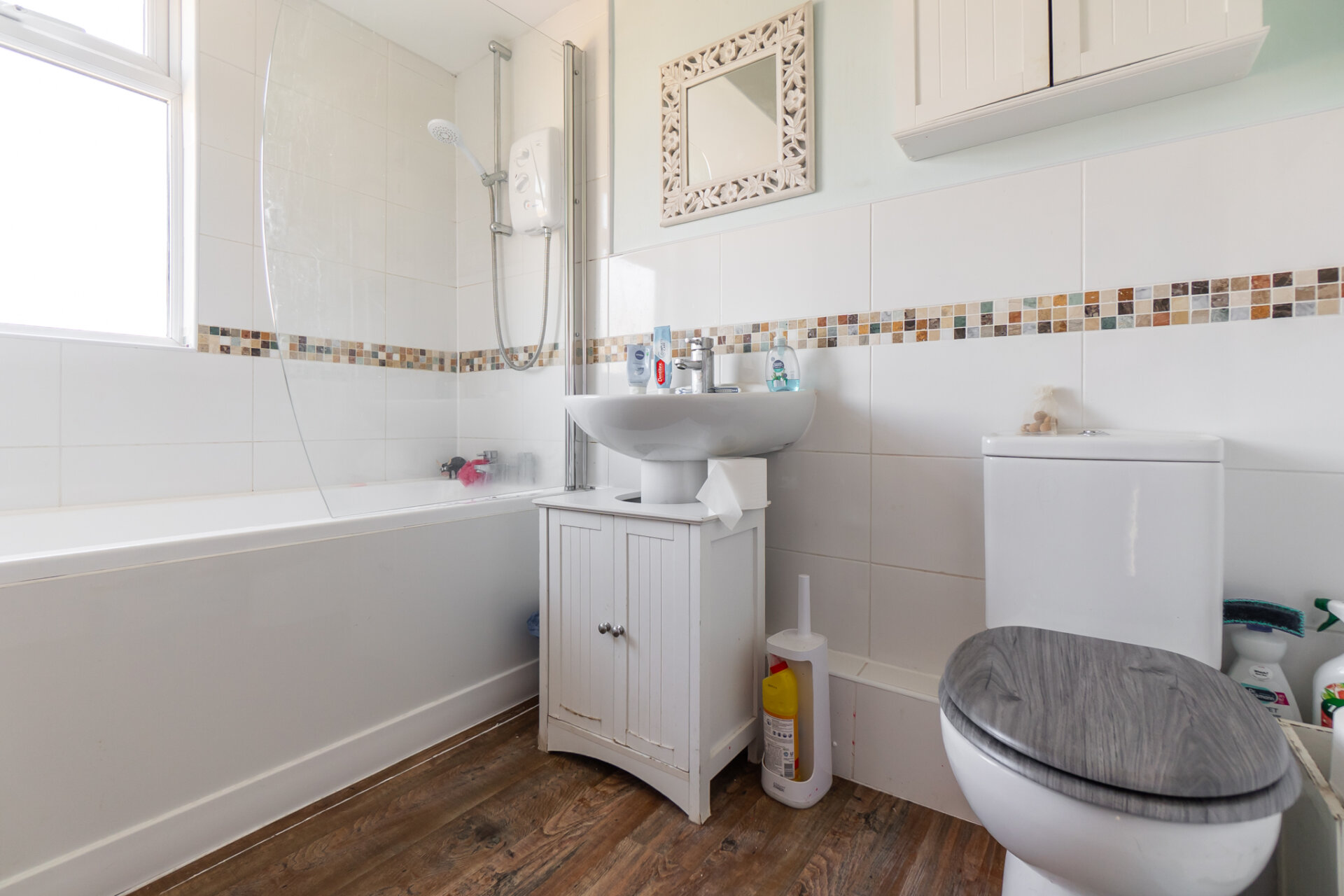 The bathroom is well-maintained, finished in clean white tiling with a full-sized bath and overhead shower.