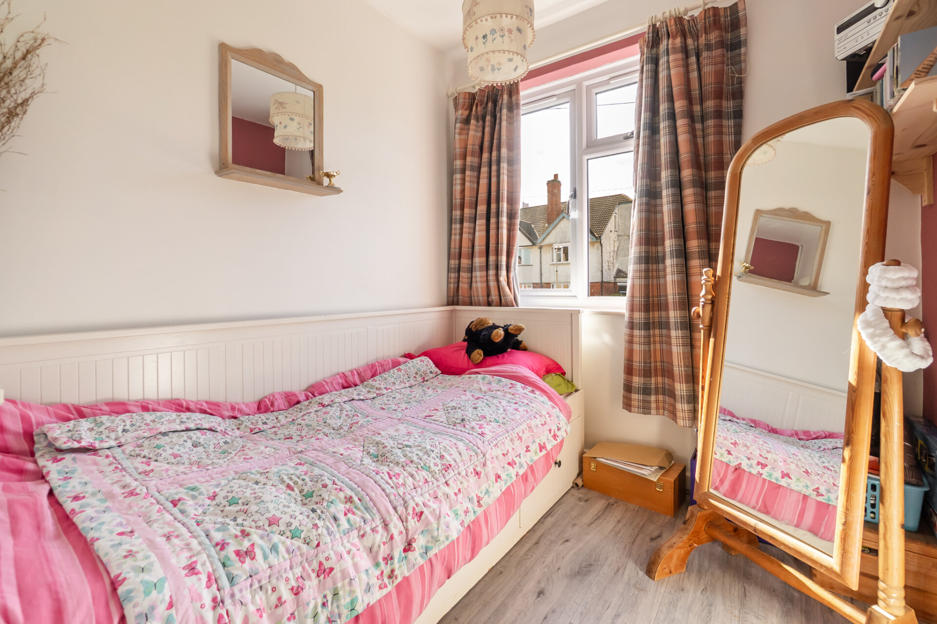Upstairs, three bedrooms are arranged off a central landing. The principal bedroom, its generous proportions and large window lending a calm, restful quality. Decorative finishes are soft and understated. Two further bedrooms - offer flexibility for family life, guests or working from home.