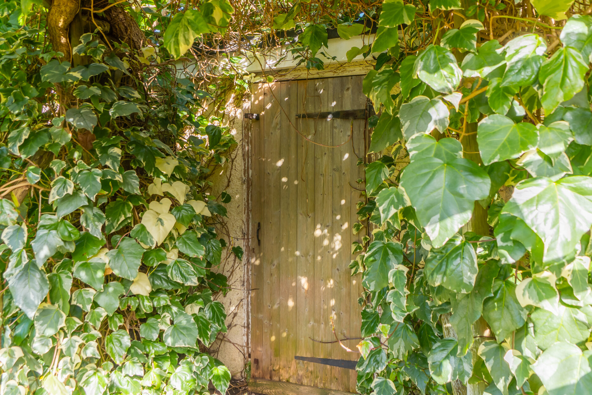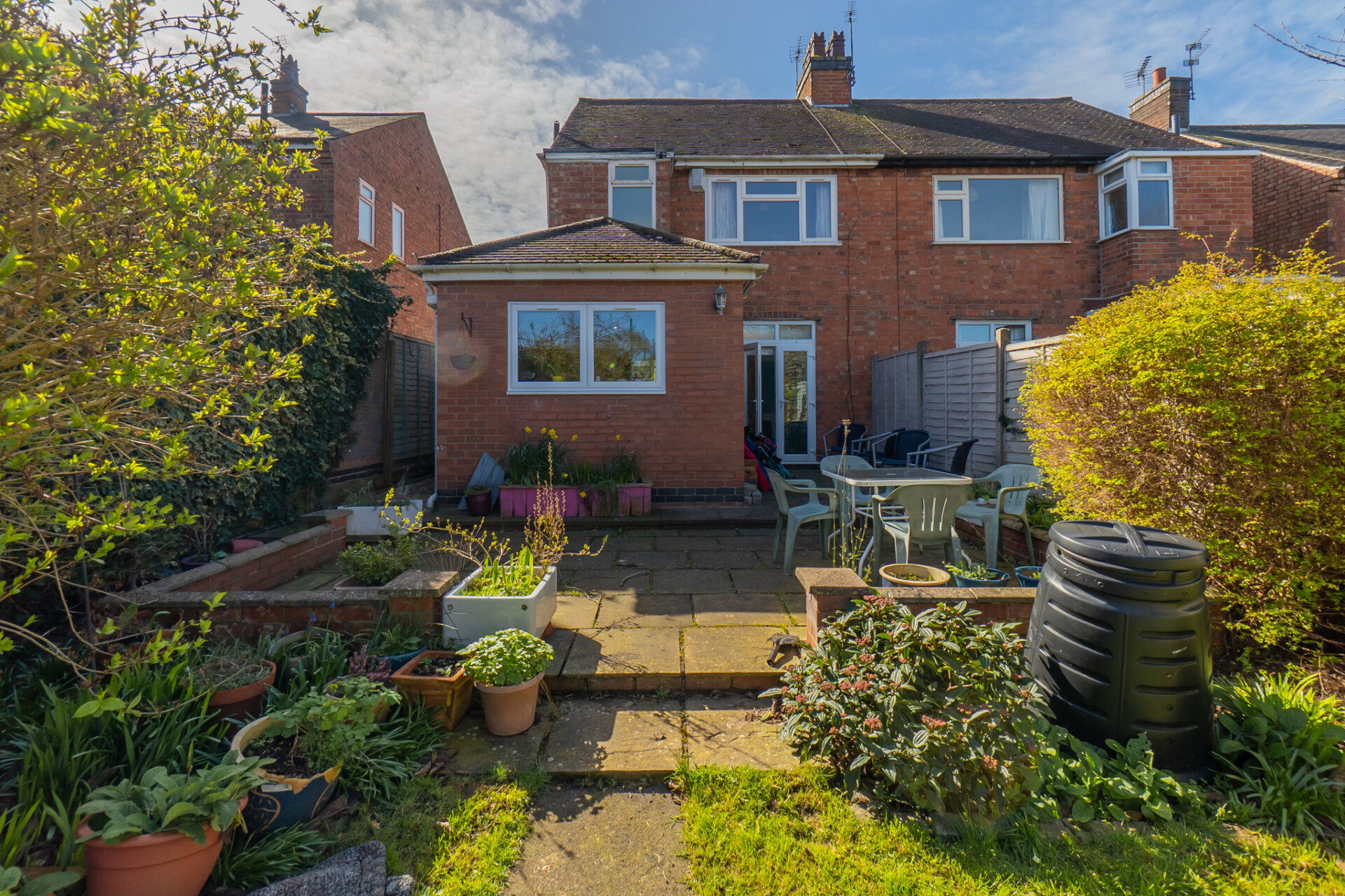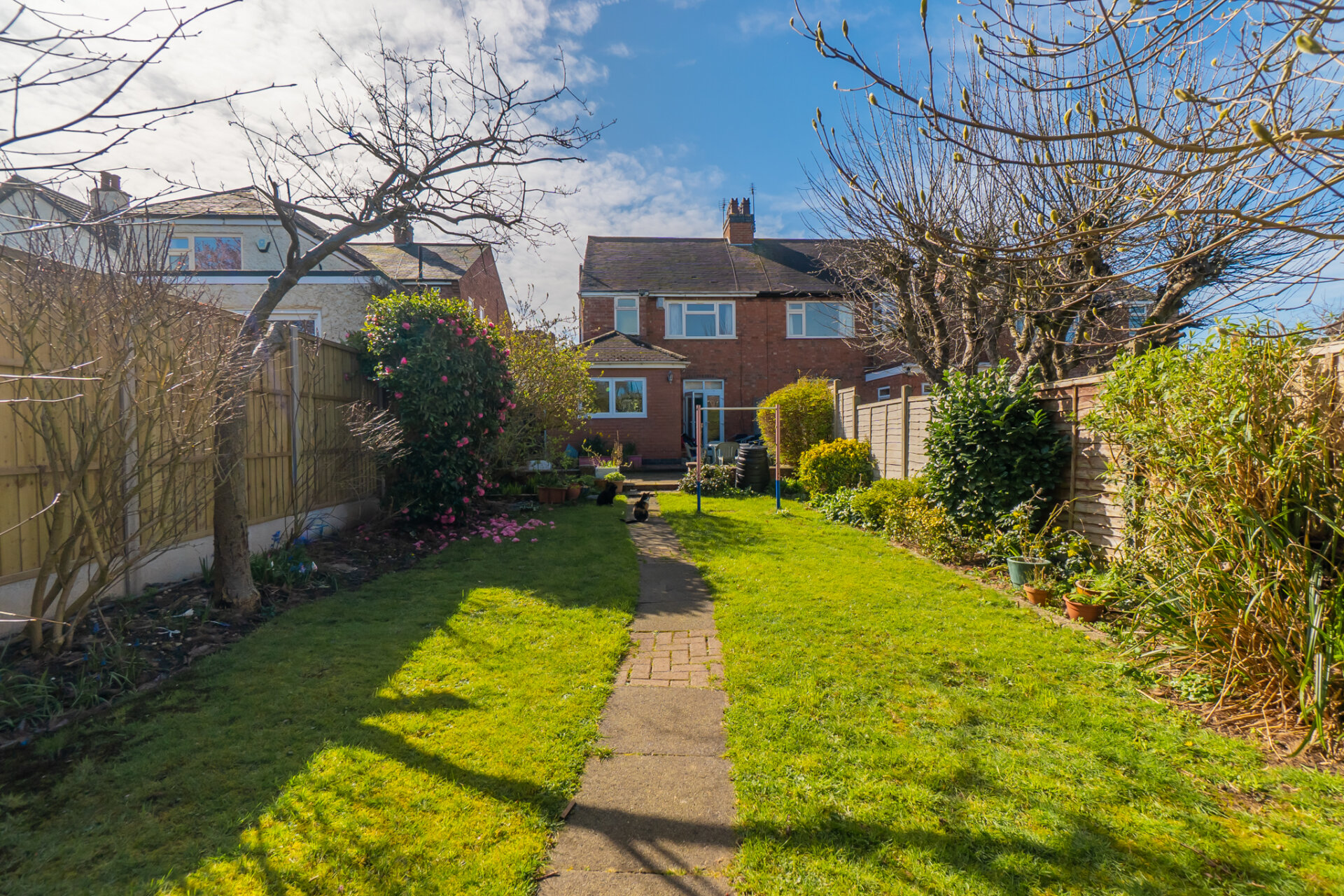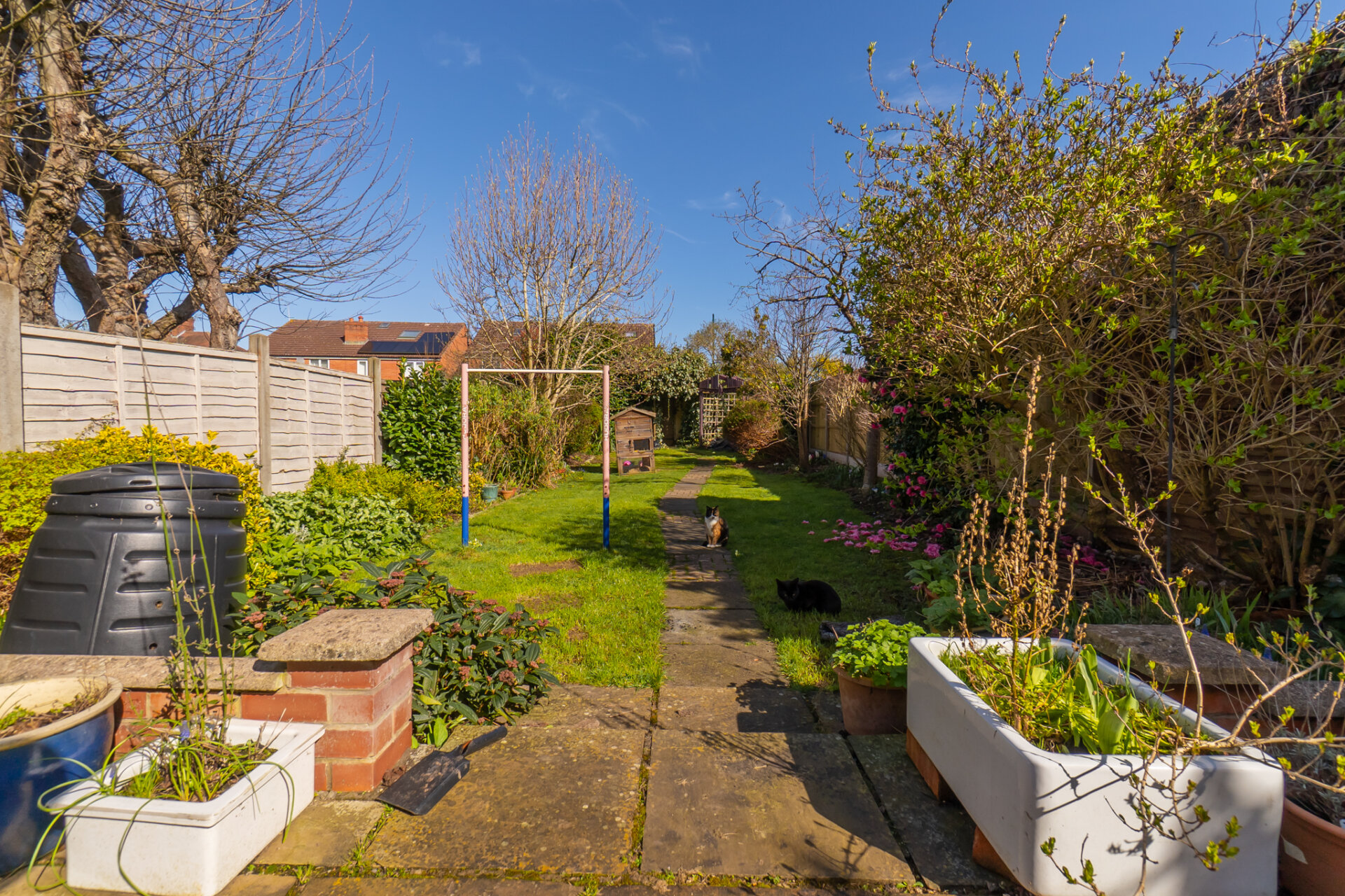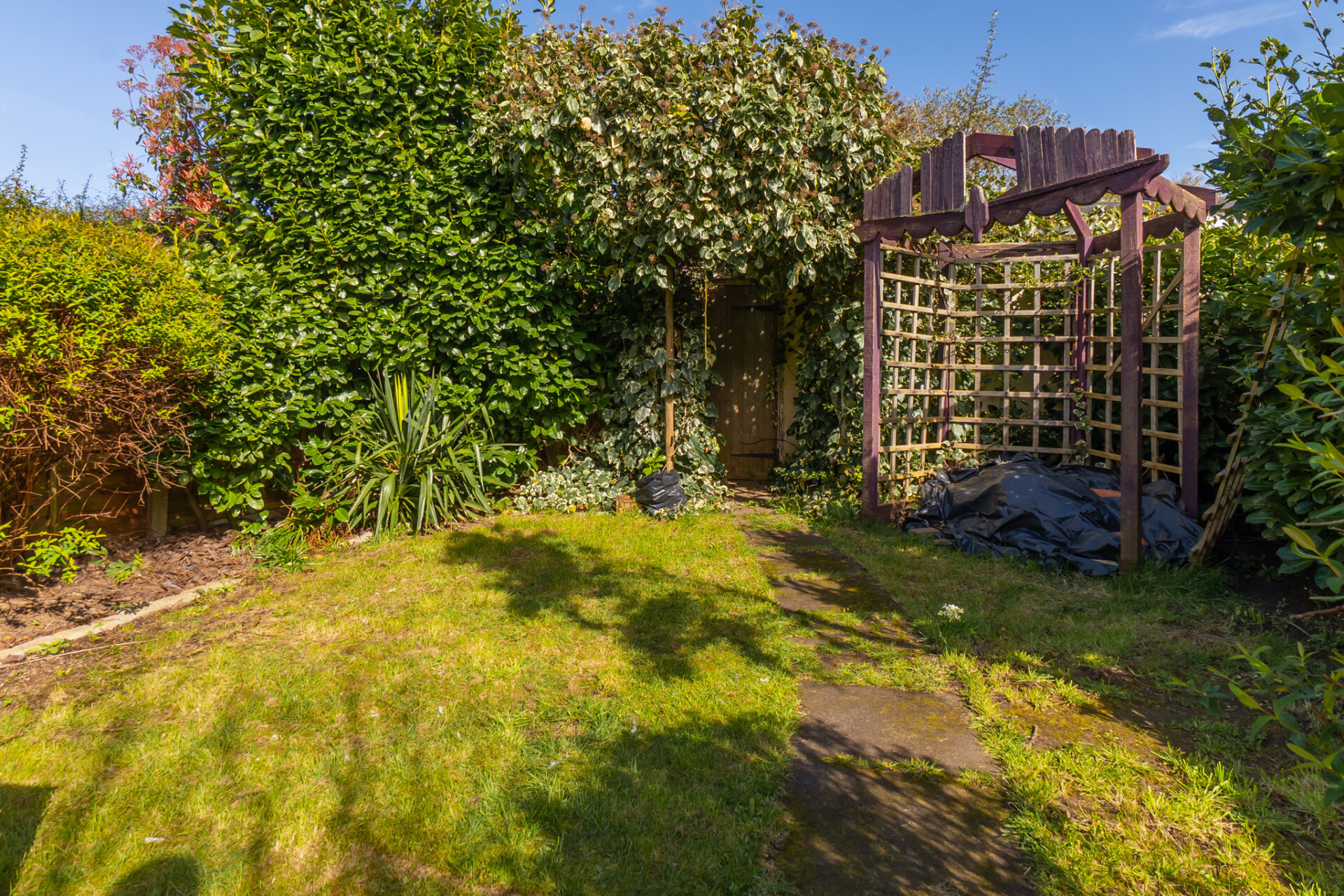 To the rear, the garden extends far beyond the footprint of the house, offering a long, green perspective framed by mature planting. A central path draws the eye through the space, flanked by lawn, established shrubs and seasonal colour. Toward the far end, a timber gate set within climbing greenery hints at a more secret, enclosed area outbuilding. Almost hidden threshold that adds to the garden’s sense of depth. A patio area close to the house provides space for outdoor dining, while the overall orientation allows for excellent natural light throughout the day.