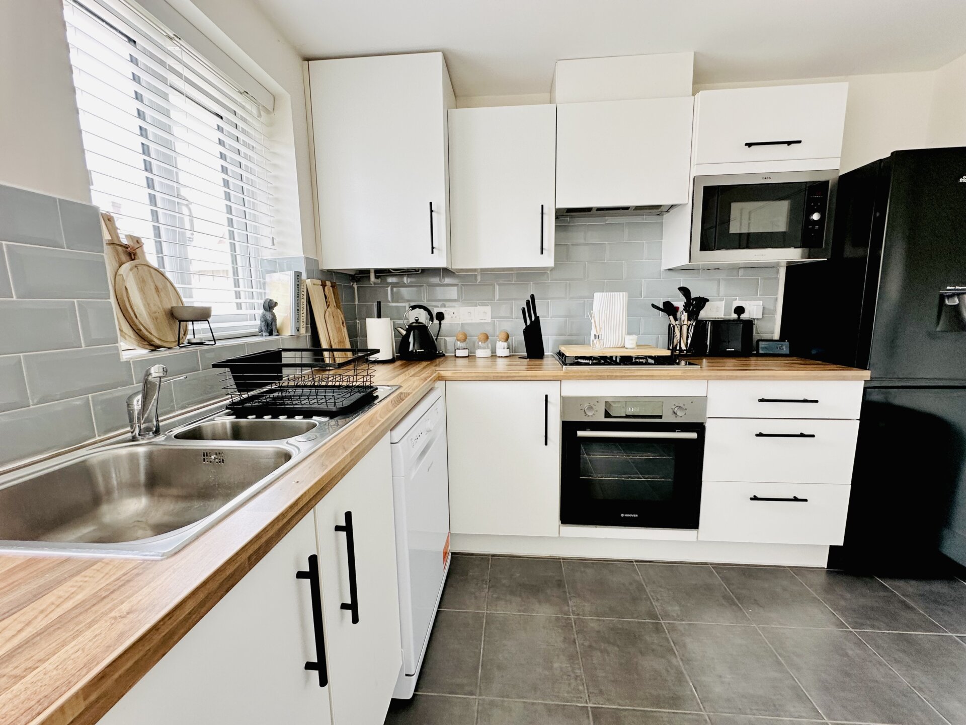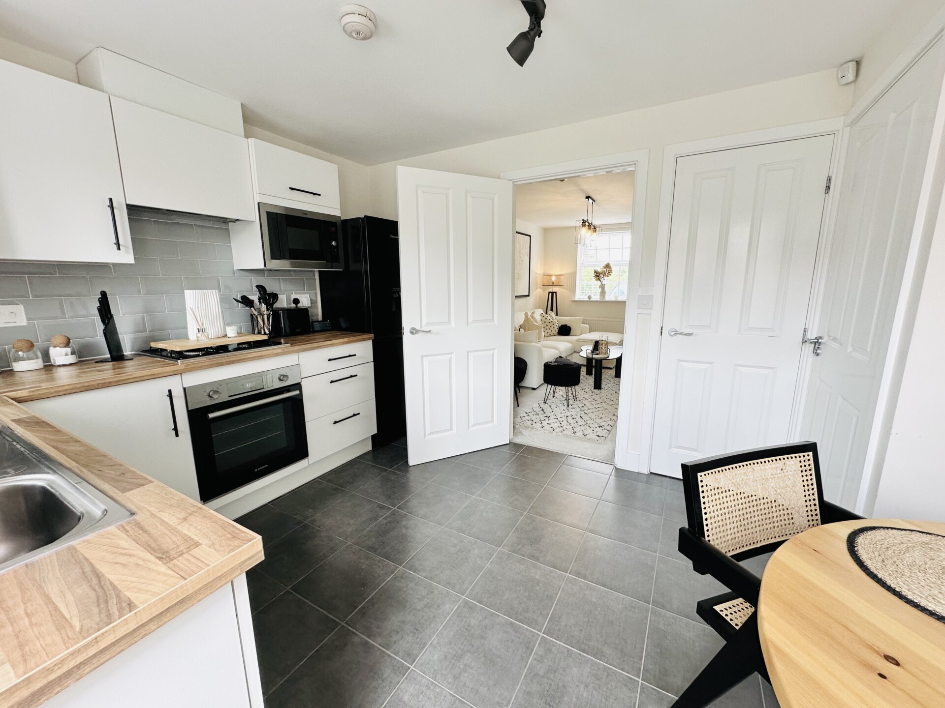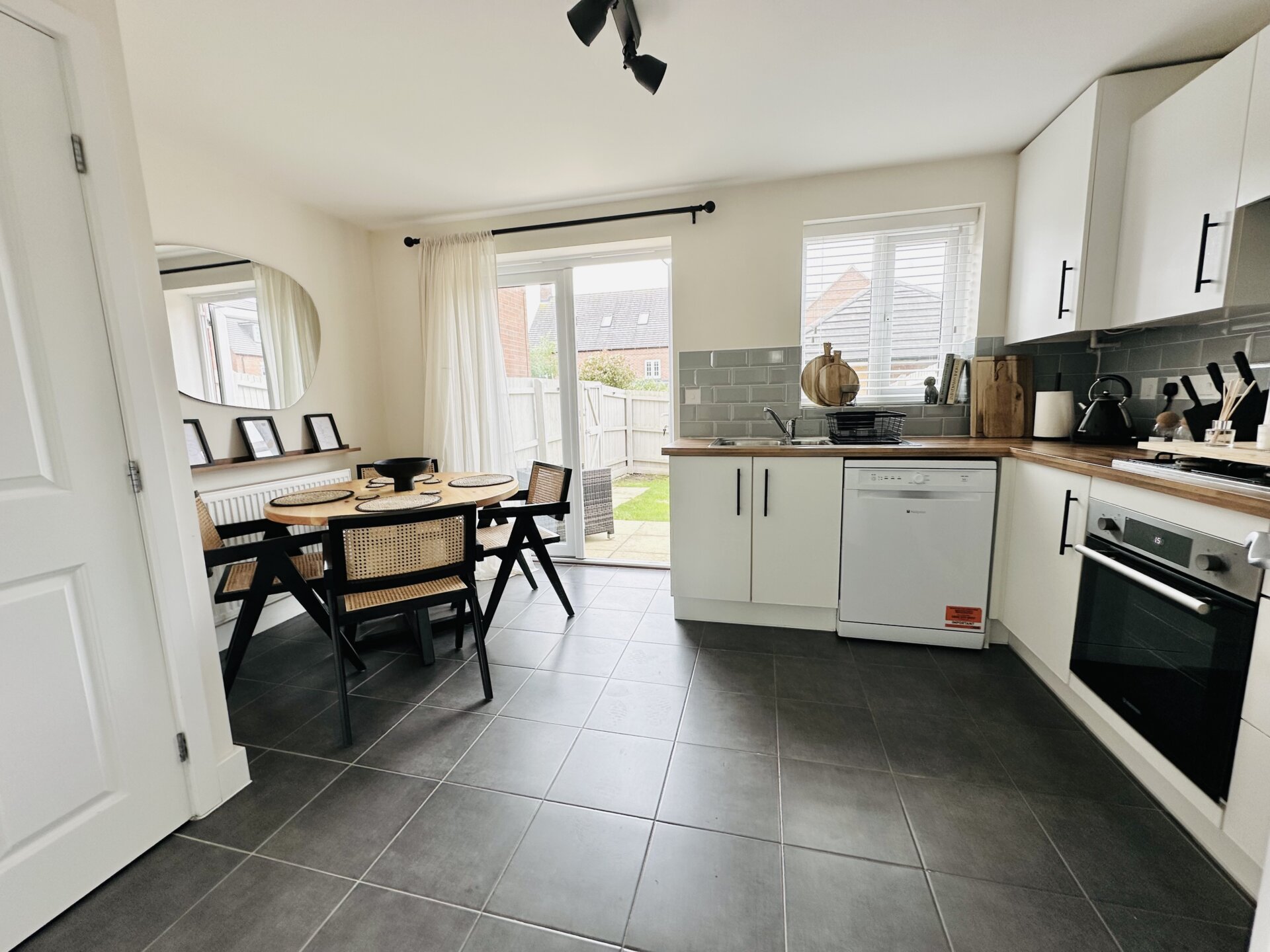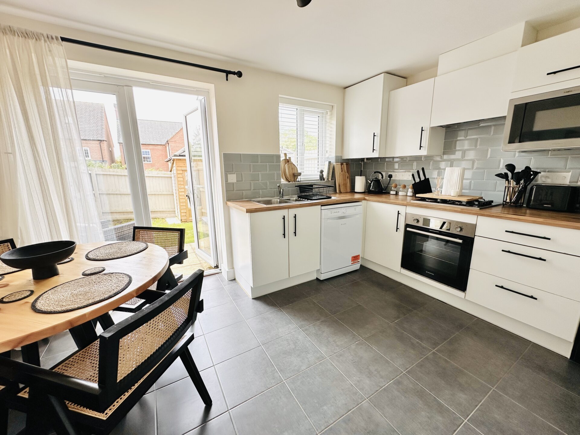 Continuing through to the modern dining kitchen which is fully equipped with an integrated microwave, built-in fan oven with gas hob and extractor fan over, stainless steel sink with drainer and mixer tap over, and two spaces allowing for a washing machine and fridge freezer. Natural light floods the space through the rear aspect window and French doors opening out to the rear patio ideal for summer entertaining. There is also a conveniently placed downstairs WC and an extra storage cupboard.