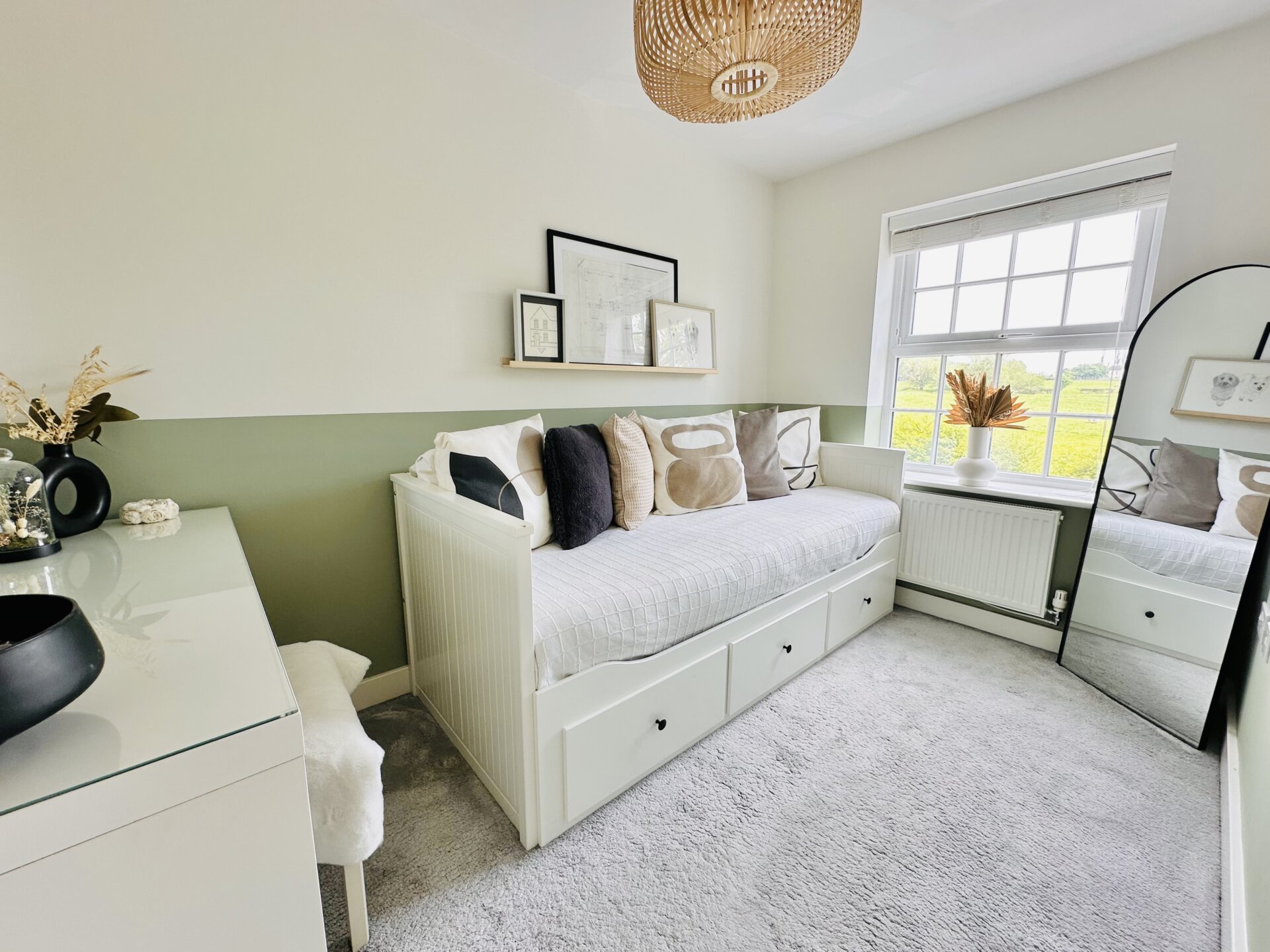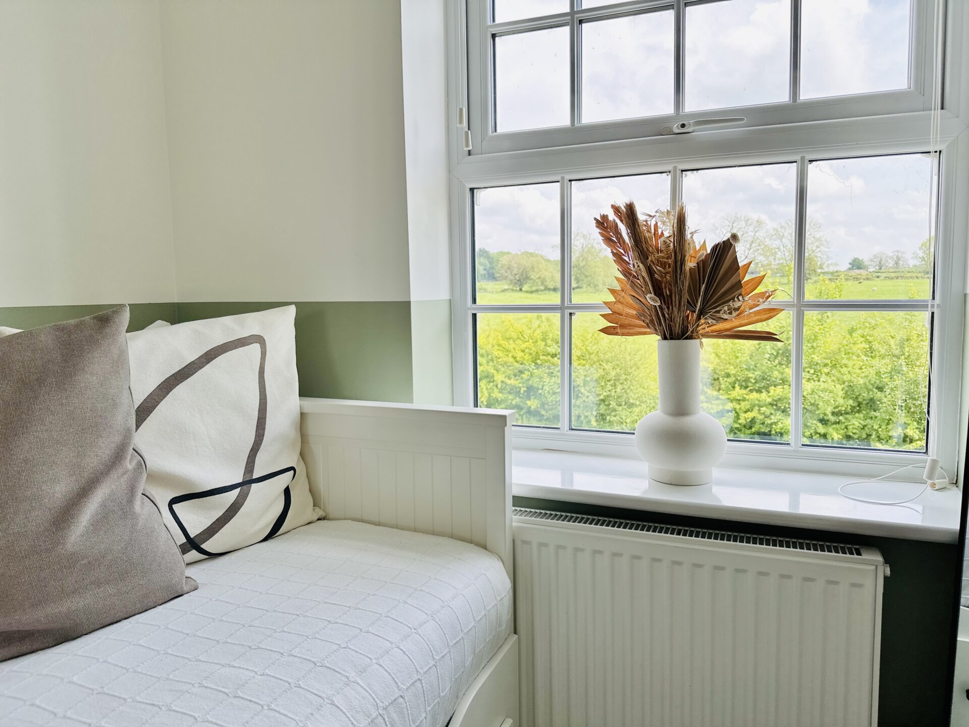 The first floor offers a generously sized master bedroom with built-in wardrobes, a family bathroom with a modern three-piece suite, and two further bedrooms both enjoying beautiful countryside front aspect views.