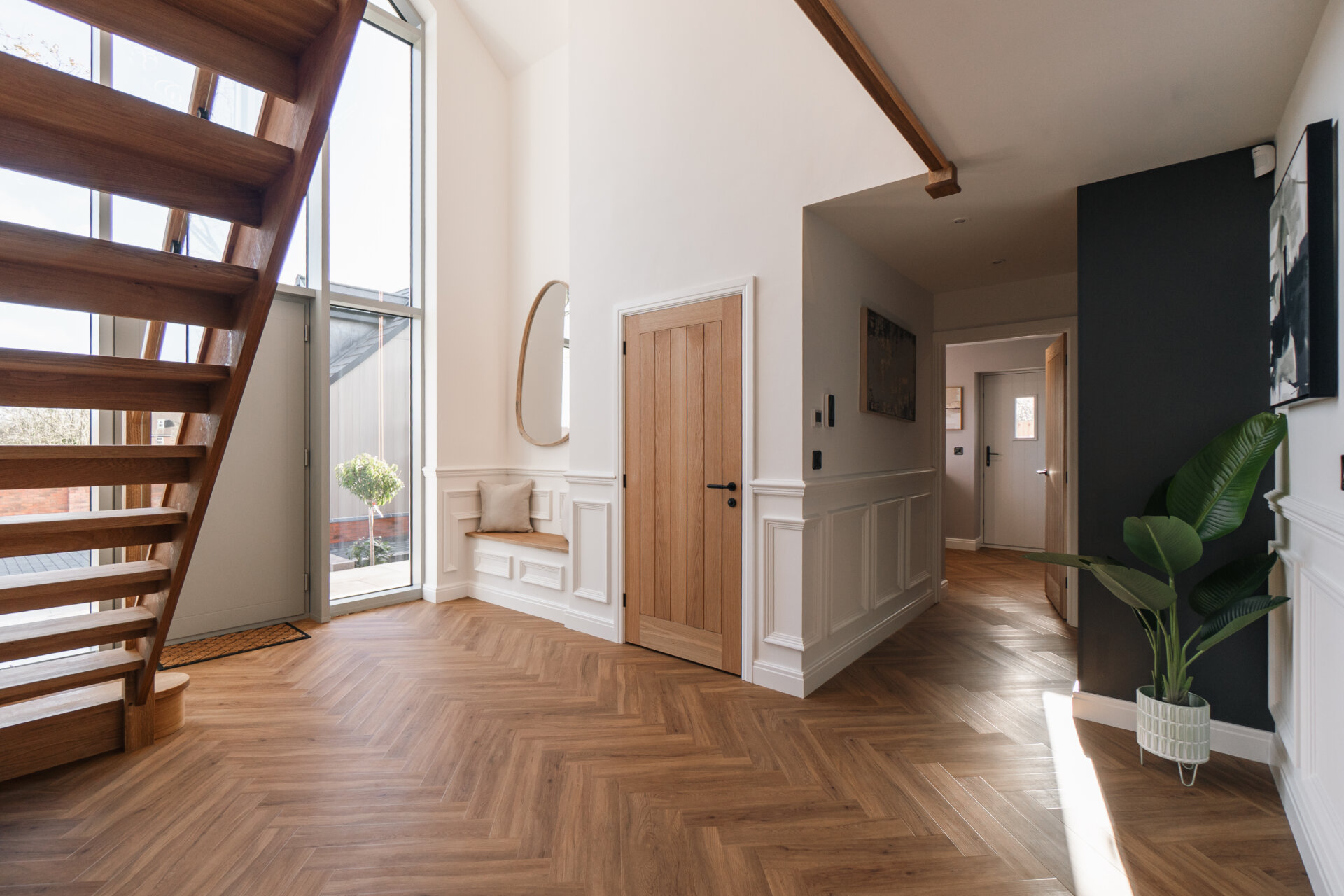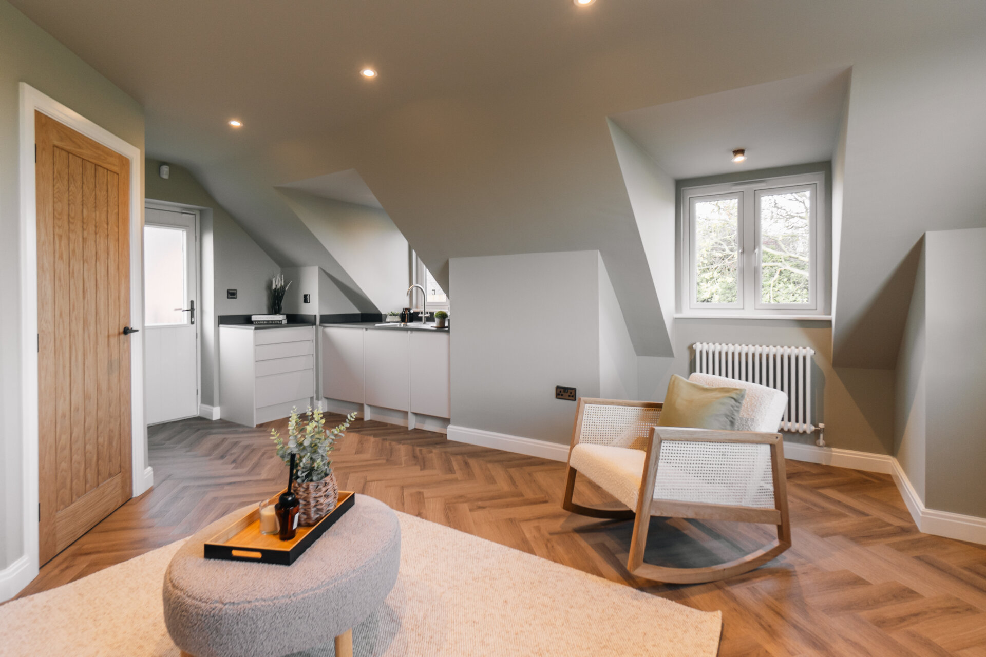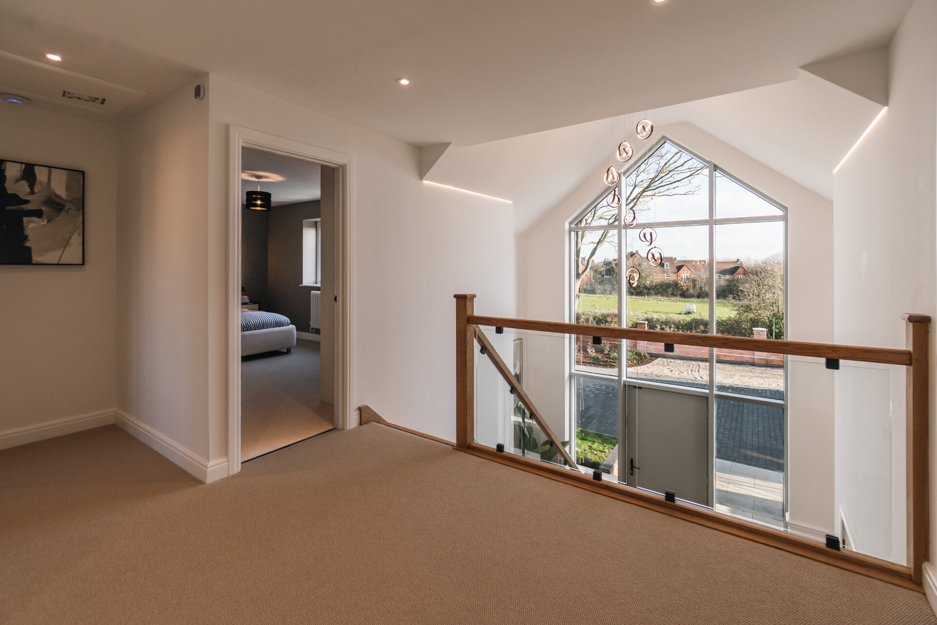 Stepping inside the main house, it becomes instantly apparent that no expense has been spared. Every detail has been curated for a refined lifestyle. A bespoke boot and coat area ensures clutter-free living, while LED lighting elegantly frames the vaulted ceiling and statement landing. The magnificent apex window captures uninterrupted views over nearby fields, a peaceful single-track lane, and a stream.