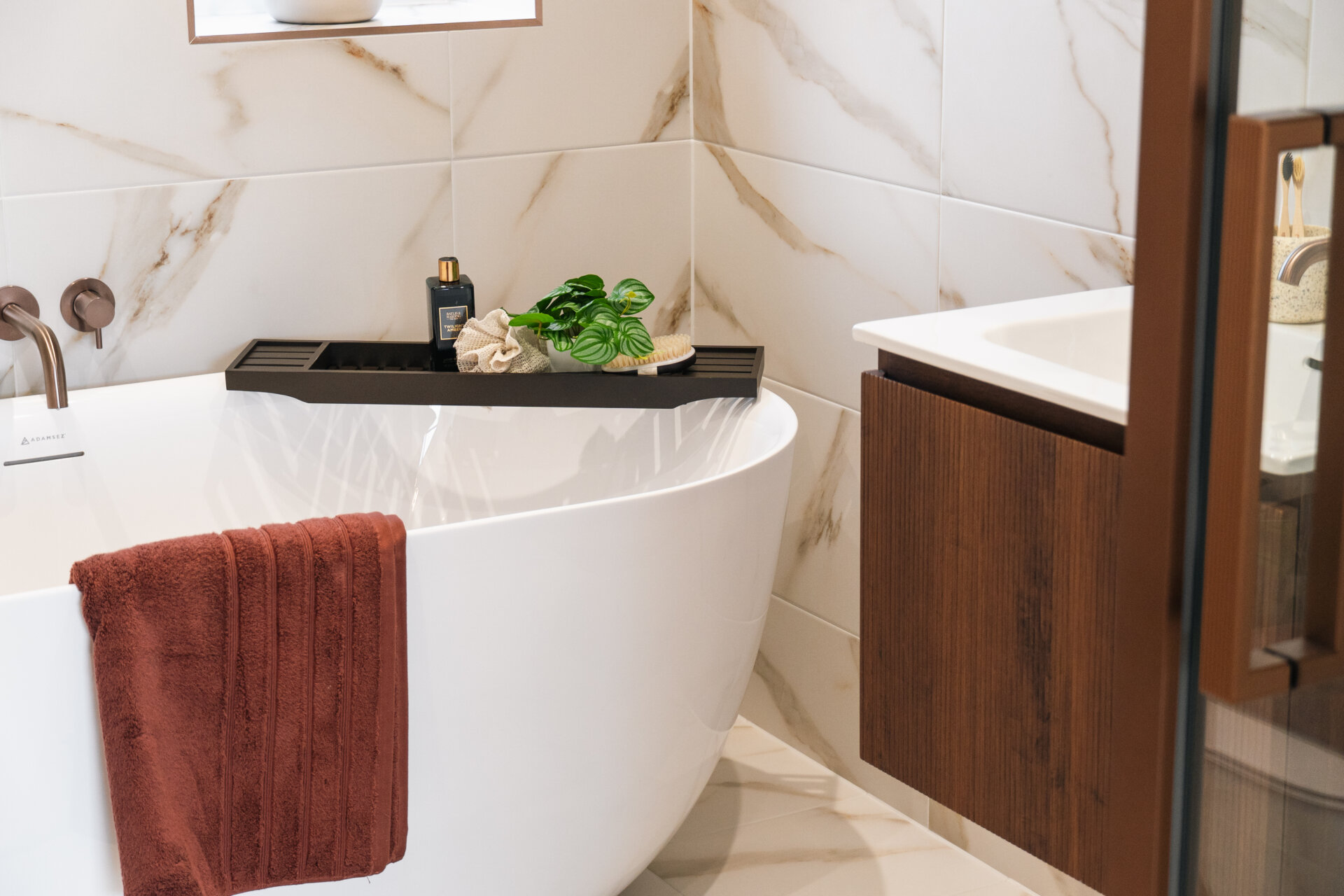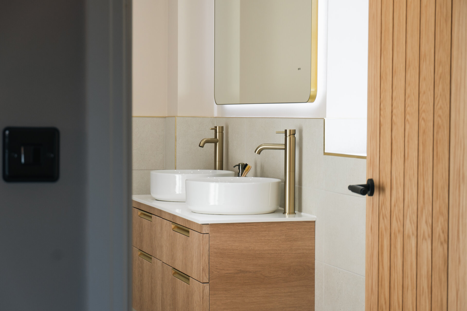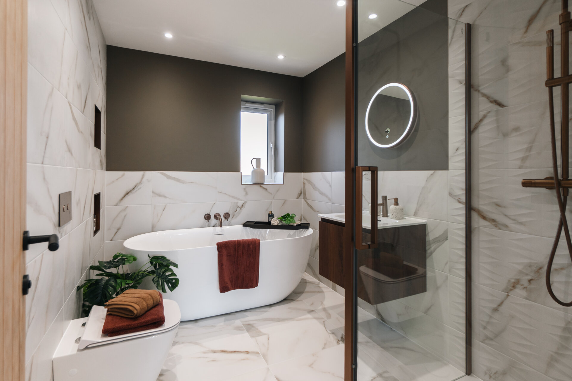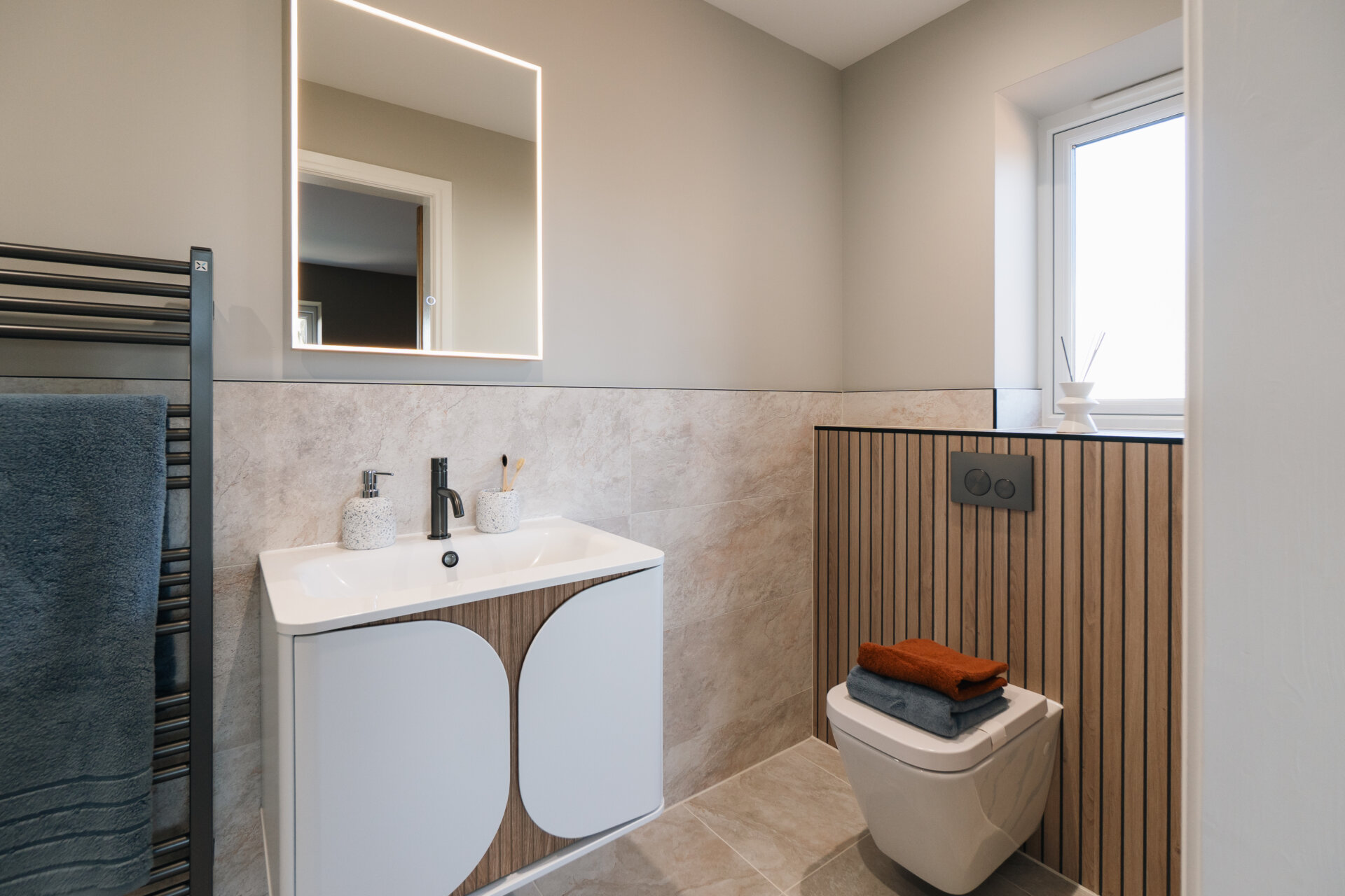 A sophisticated family bathroom. Again, with Porcelanosa tiles - serves the remaining bedrooms, all of which are generous doubles, offering peaceful space for family or adaptable spaces for hobbies, home working, or visiting guests.