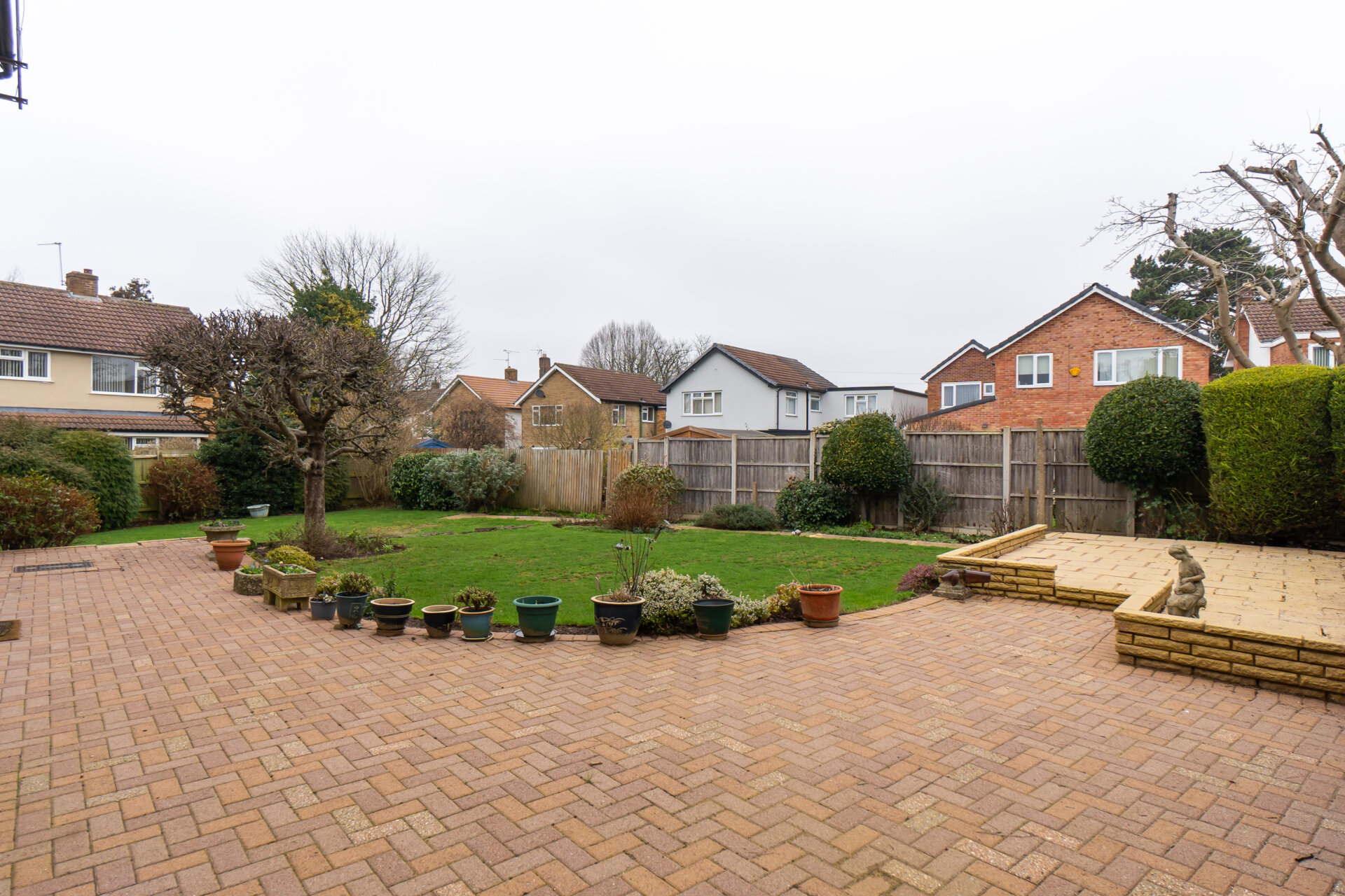 Outside, the house sits within a notably generous and beautifully established plot. The wraparound rear garden is a standout feature, with mature trees, raised borders and well-considered planting creating a sense of seclusion and year-round interest. A large paved terrace provides space for outdoor dining and entertaining, flowing into an expanse of lawn. The garden also affords direct access to the double garage, which is well equipped and sensibly positioned.