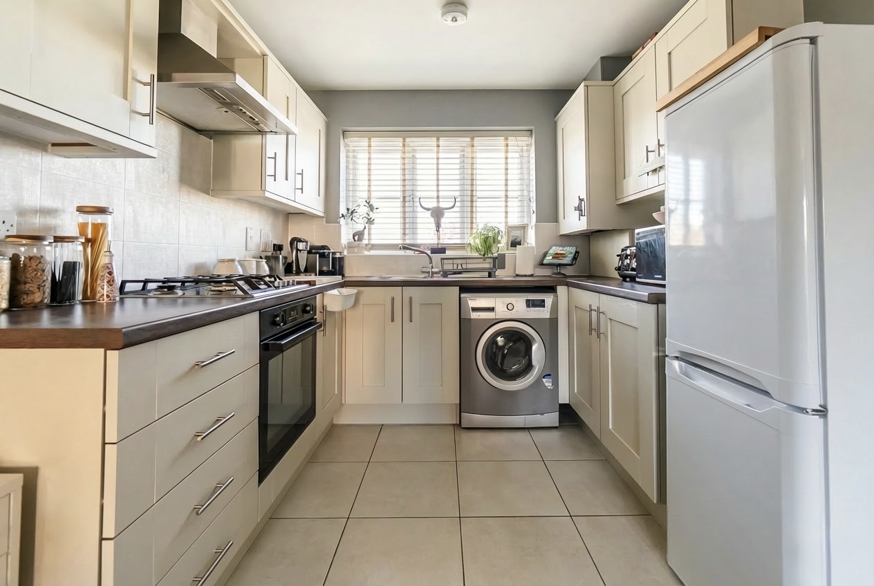 The L- shaped open plan living is a welcoming space with a cosy lounge area, and the dining space has French doors directly onto the garden, ideal for summer entertaining. The modern kitchen is fully equipped with an integrated built-in oven with gas hob and extractor fan over, stainless steel sink with drainer and mixer tap over, and two spaces allowing for a washing machine and fridge freezer. Natural light floods the space through the front aspect window.