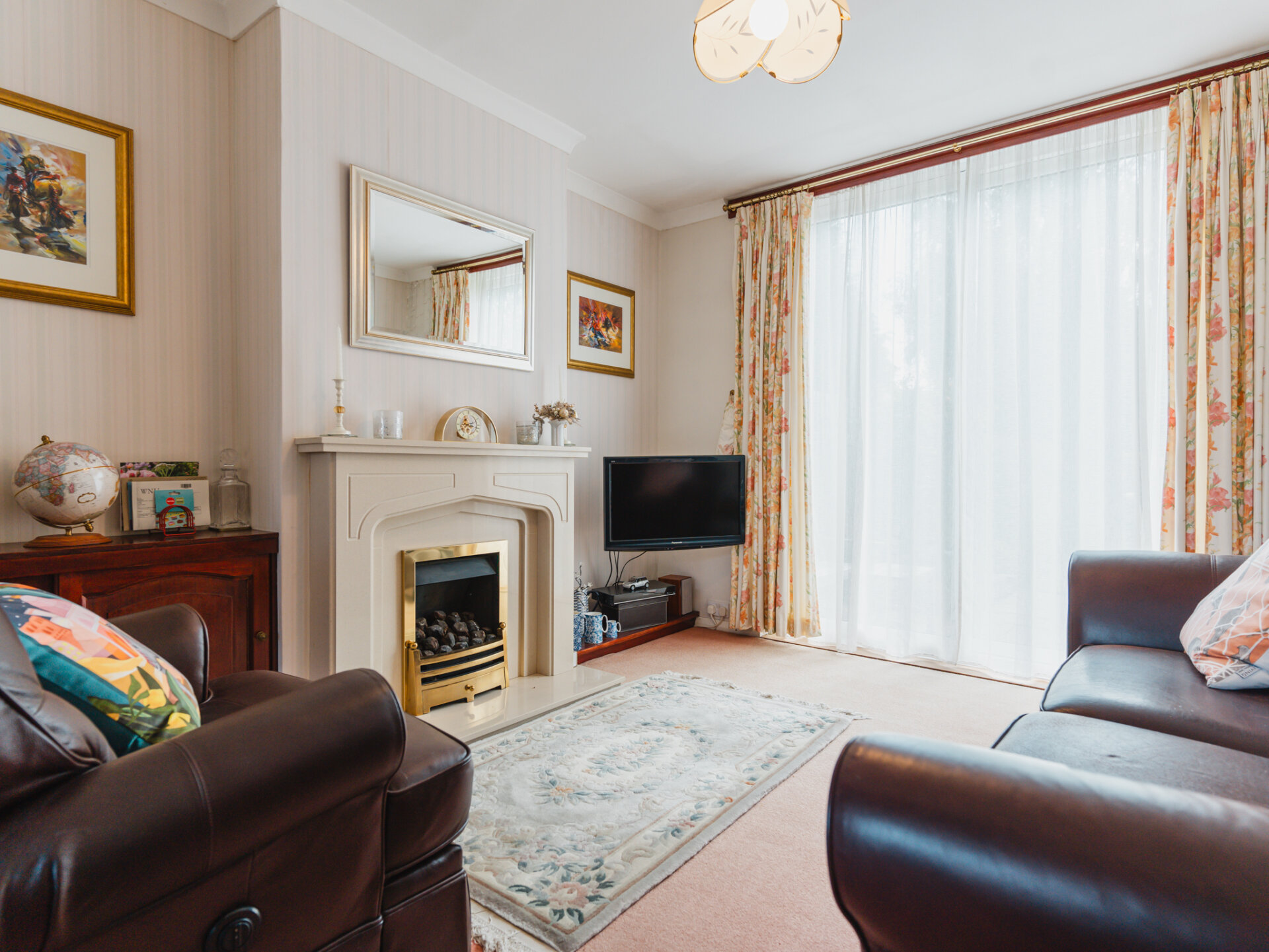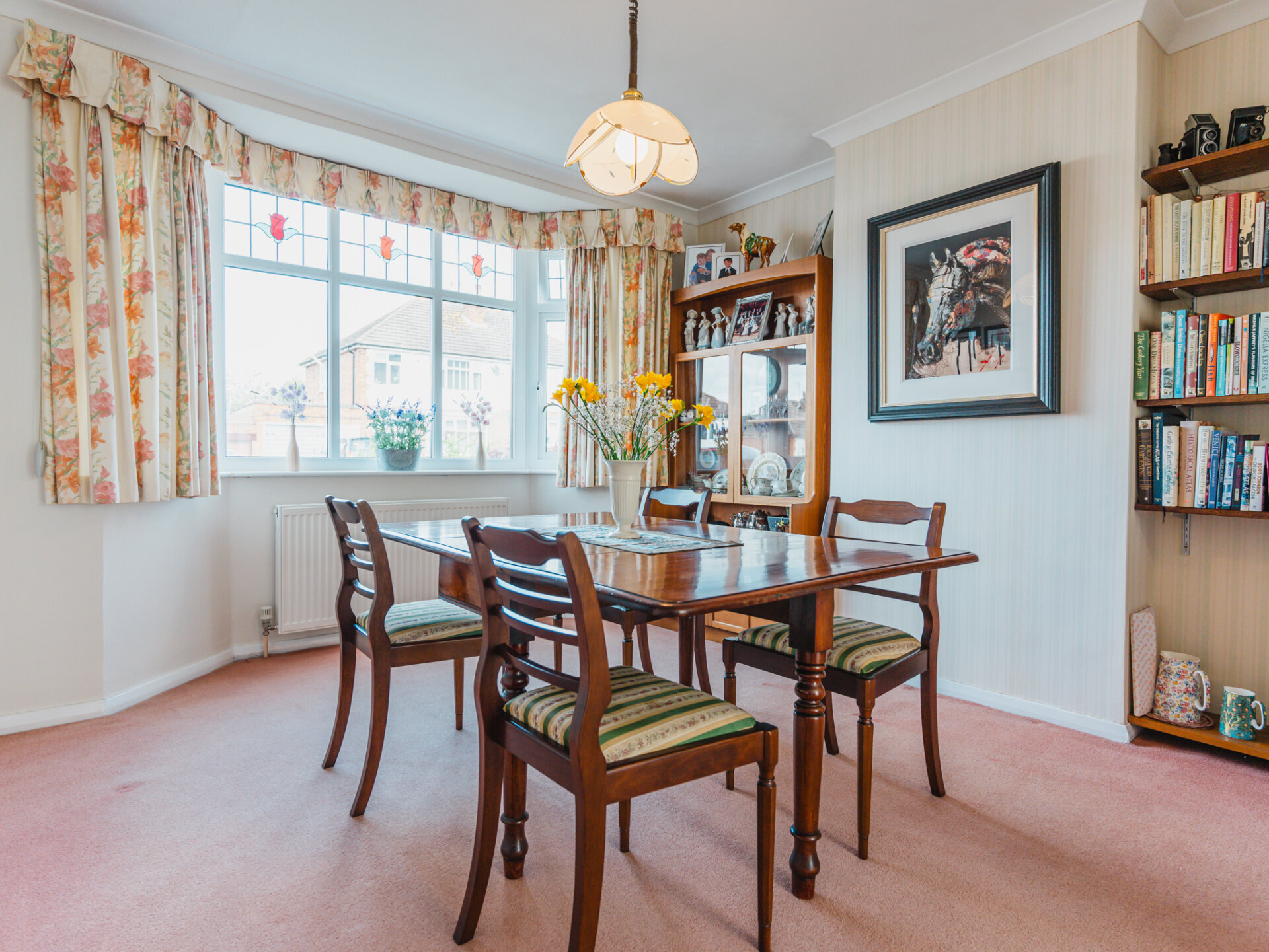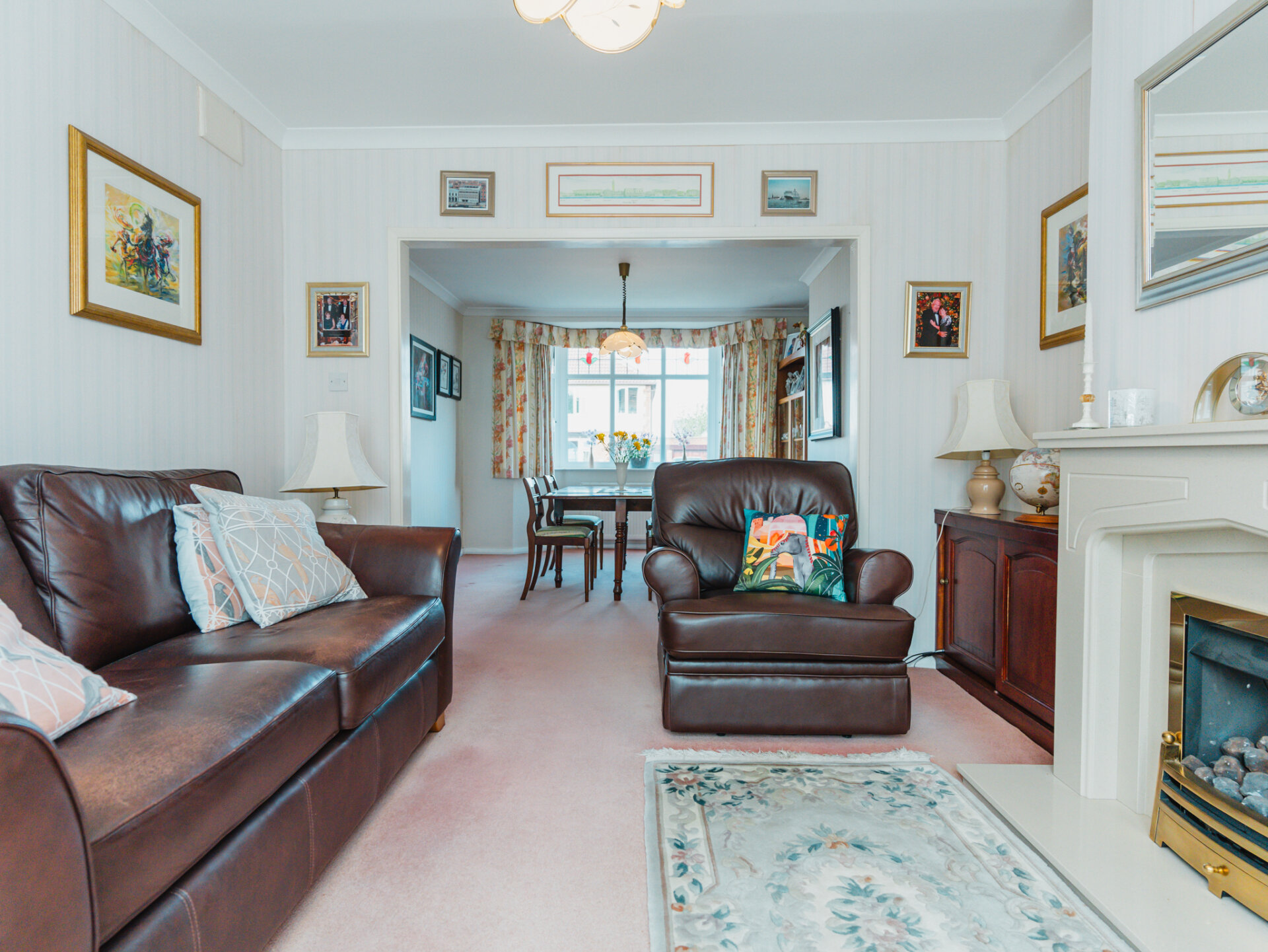 Upon entering the property through the enclosed storm porch, you are greeted by a welcoming entrance hall. The hallway, featuring a staircase to the first floor, provides access to all ground-floor rooms. To the left, you’ll find the inviting dining room—a perfect space for family meals and entertaining guests. The dining room is beautifully lit by a bay window to the front aspect and opens seamlessly into the living room at the rear. The living room enjoys views over the south-facing garden through its sliding patio doors, creating a bright and airy feel.