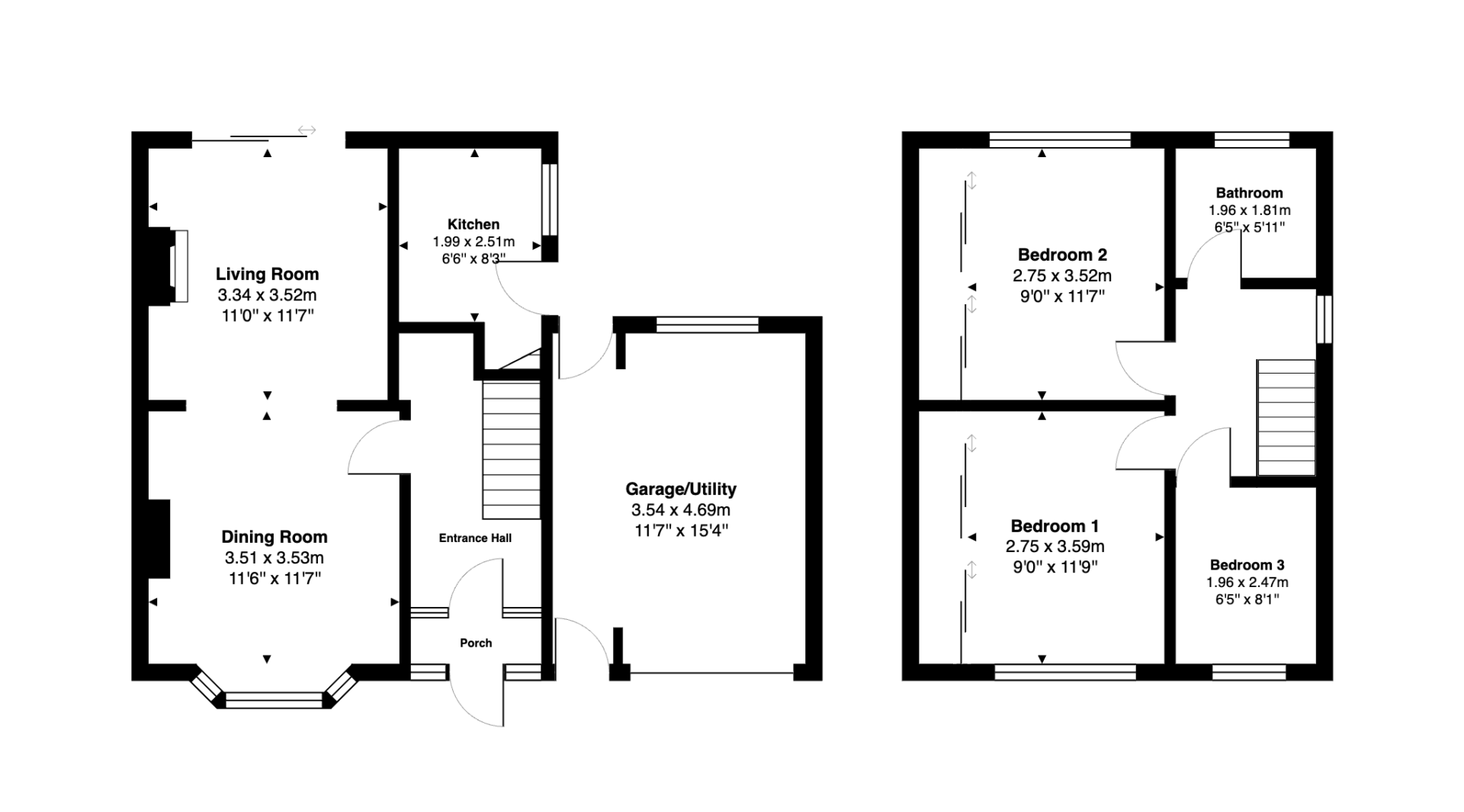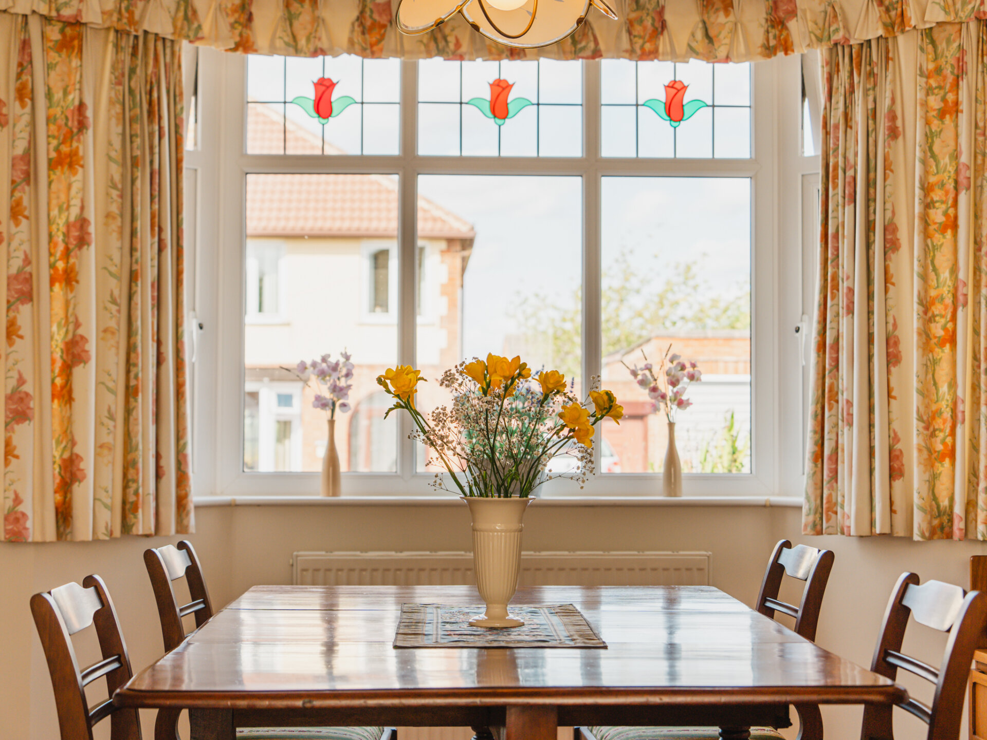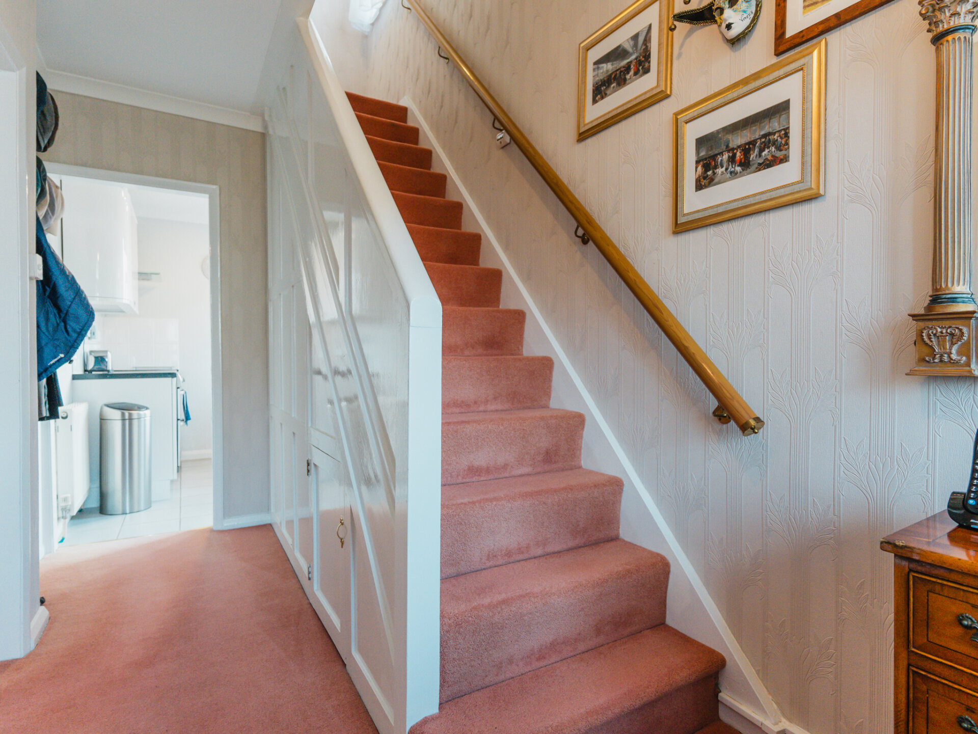 Upon entering the property through the enclosed storm porch, you are greeted by a welcoming entrance hall. The hallway, featuring a staircase to the first floor, provides access to all ground-floor rooms. To the left, you’ll find the inviting dining room—a perfect space for family meals and entertaining guests. The dining room is beautifully lit by a bay window to the front aspect and opens seamlessly into the living room at the rear. The living room enjoys views over the south-facing garden through its sliding patio doors, creating a bright and airy feel.