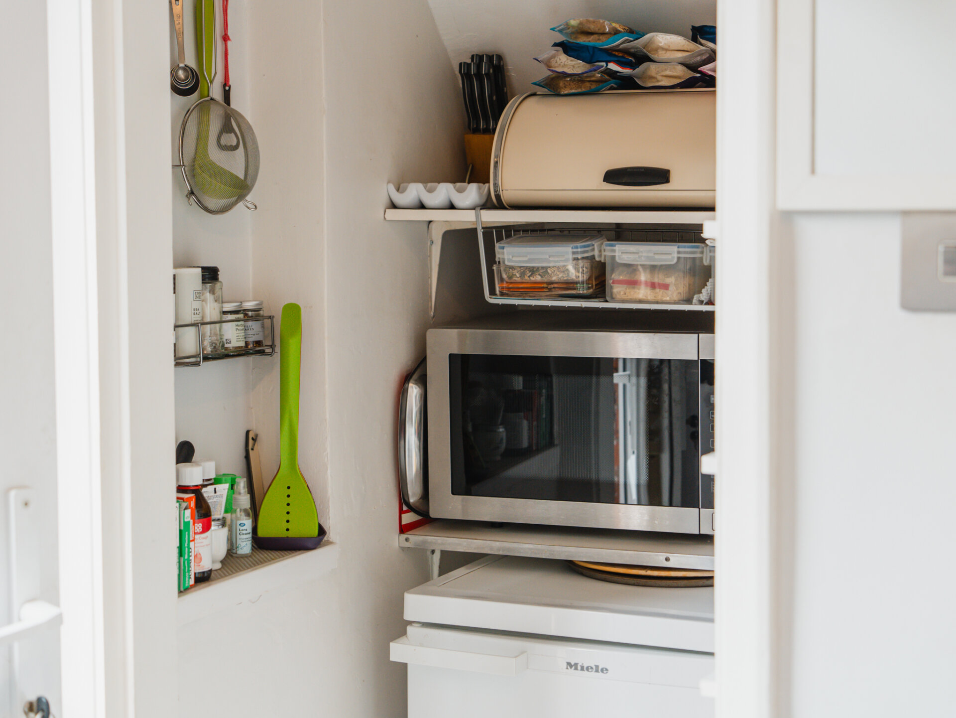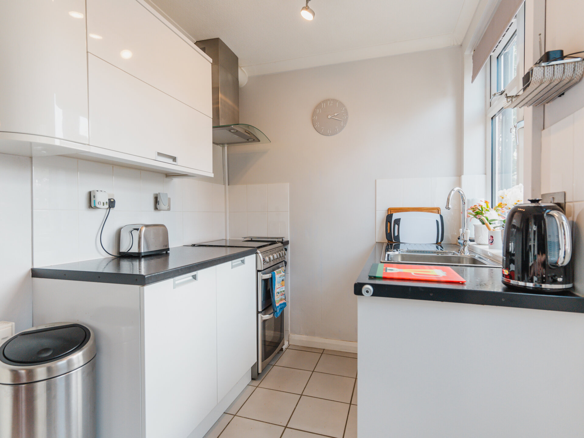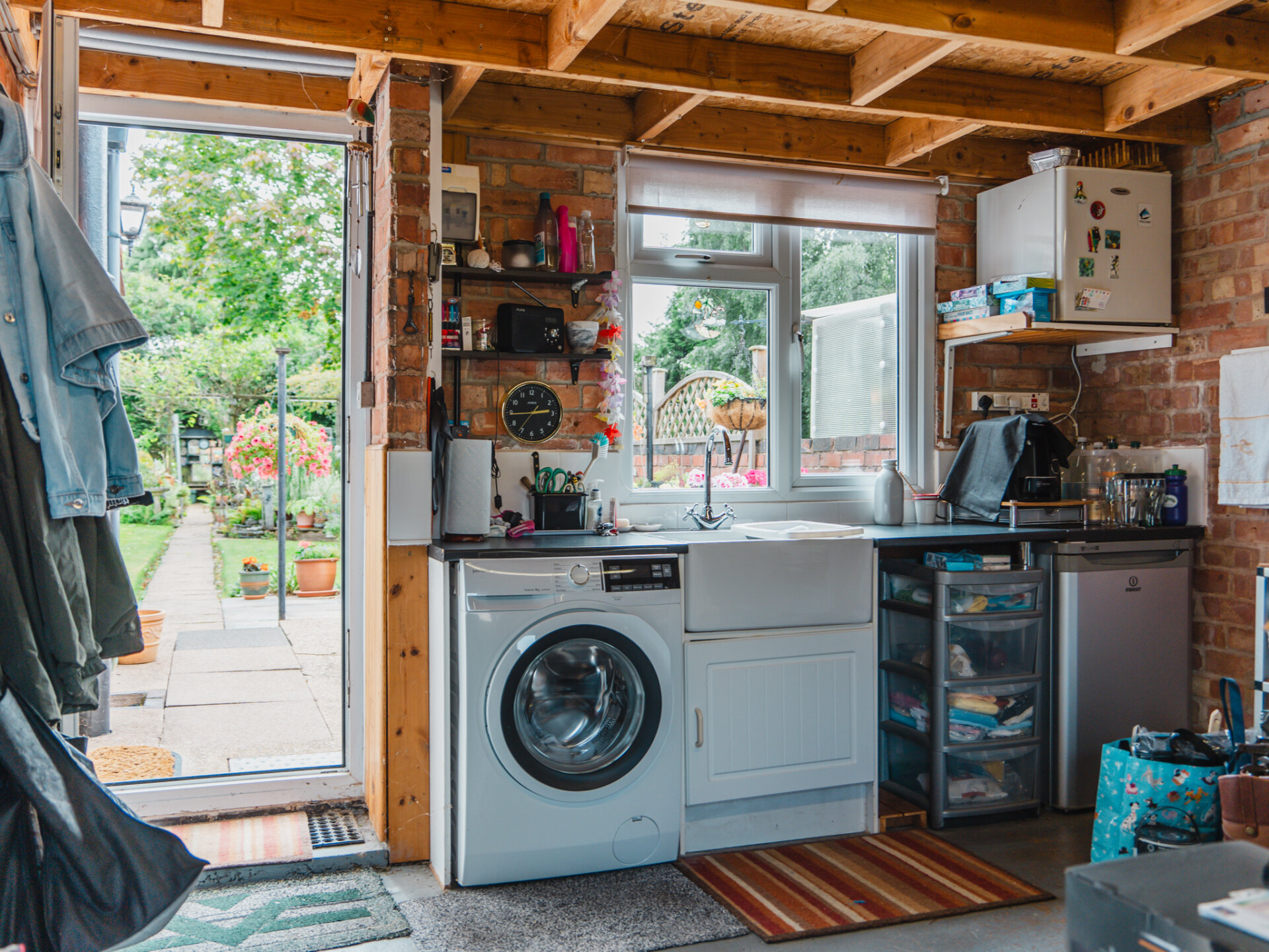 At the rear of the entrance hall, the modern kitchen is fitted with sleek gloss white units and contrasting black worktops. The kitchen is well-equipped with a freestanding cooker and hob, a fitted extractor fan, and a handy pantry cupboard with storage space for a fridge and microwave. A side door leads out to the garden and garage/utility area, where you’ll find ample additional storage, an extra sink, and space for a washing machine and freezer.