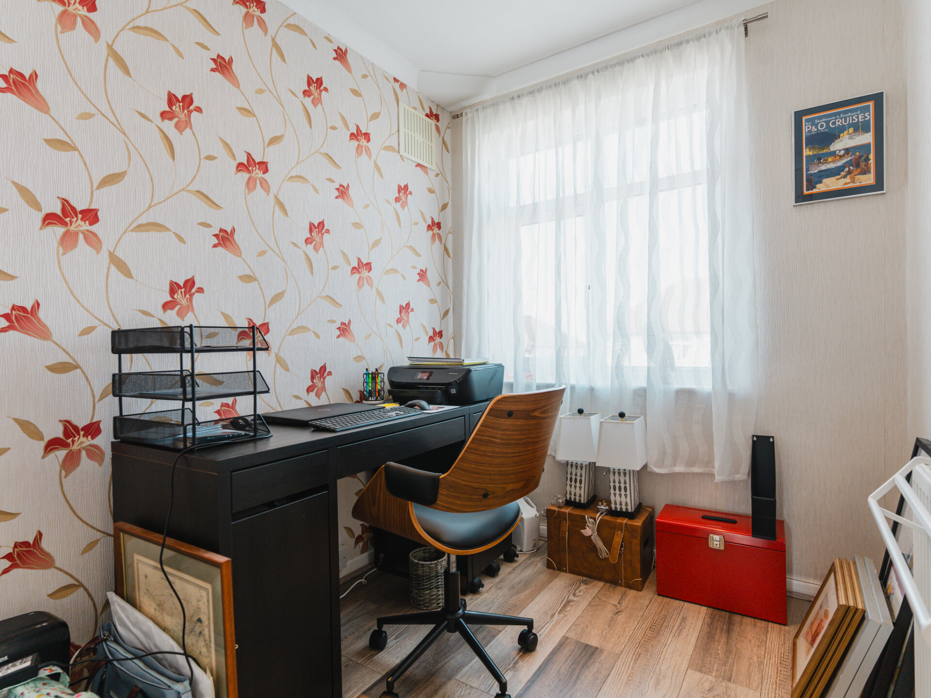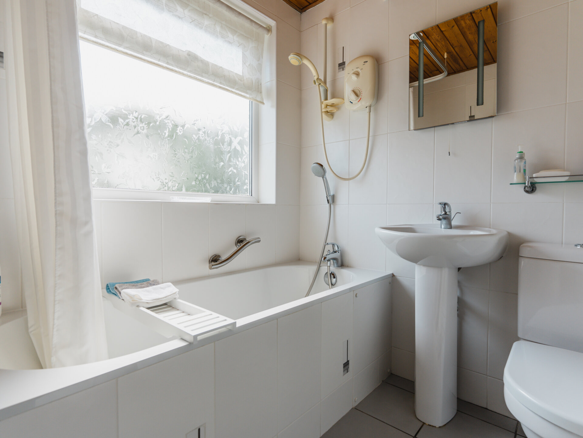 Upstairs, there are three bedrooms. Two are generously sized double bedrooms, both featuring fitted wardrobes and offering pleasant views—one to the front and the other overlooking the rear garden. The third bedroom is a traditional single room, currently used as a home office, making it ideal for those who work from home or require a study space. All three bedrooms are served by a well-appointed family bathroom, which includes a bath with an electric shower overhead, a pedestal hand wash basin, WC, and a heated towel rail.