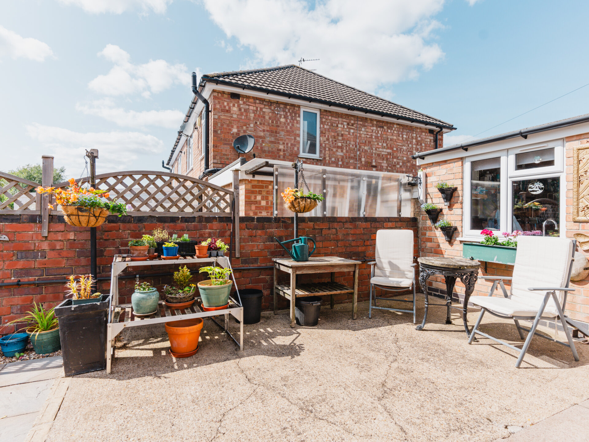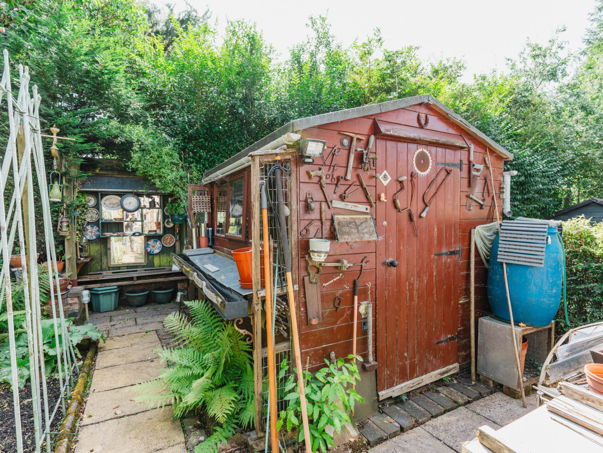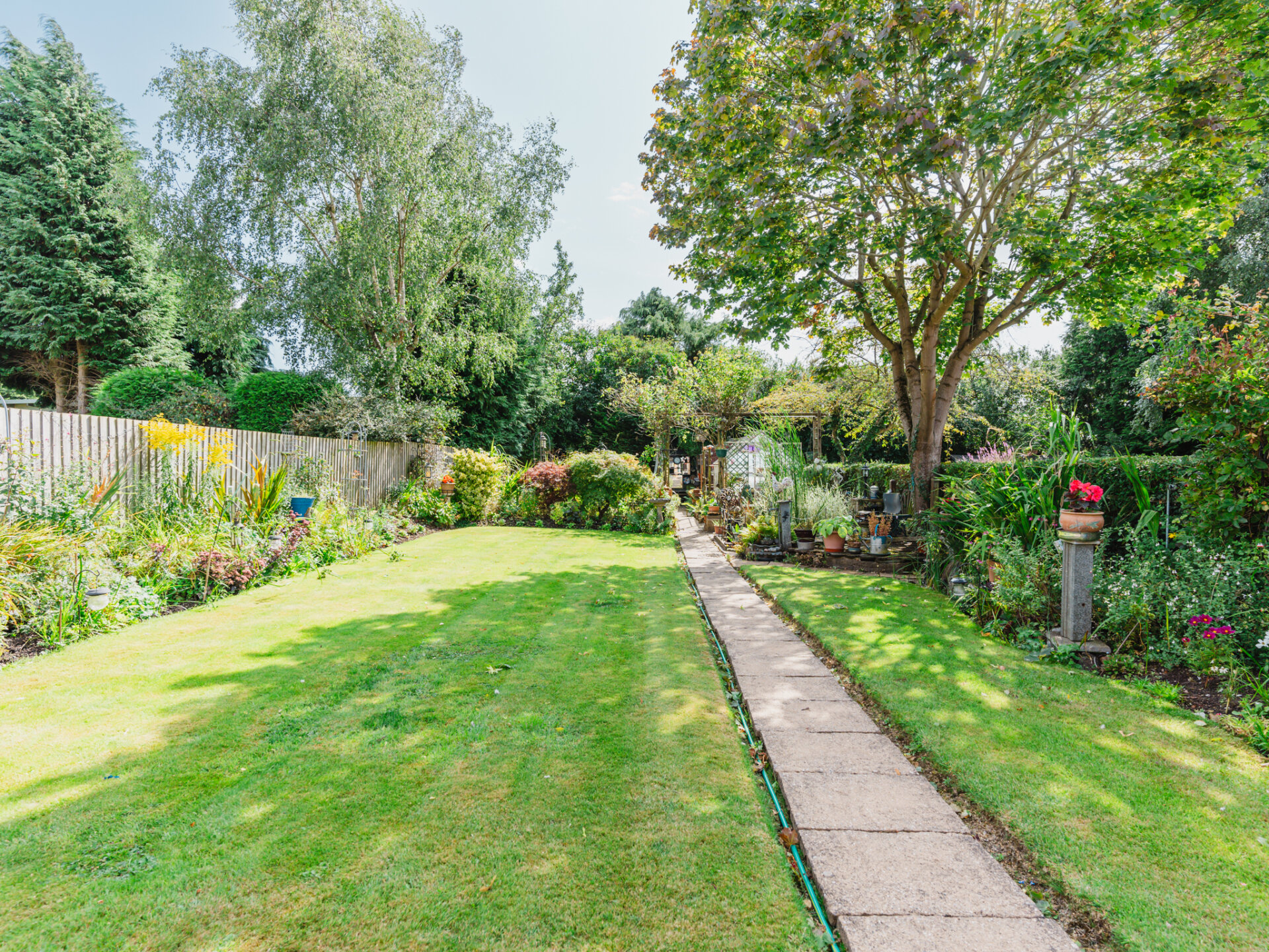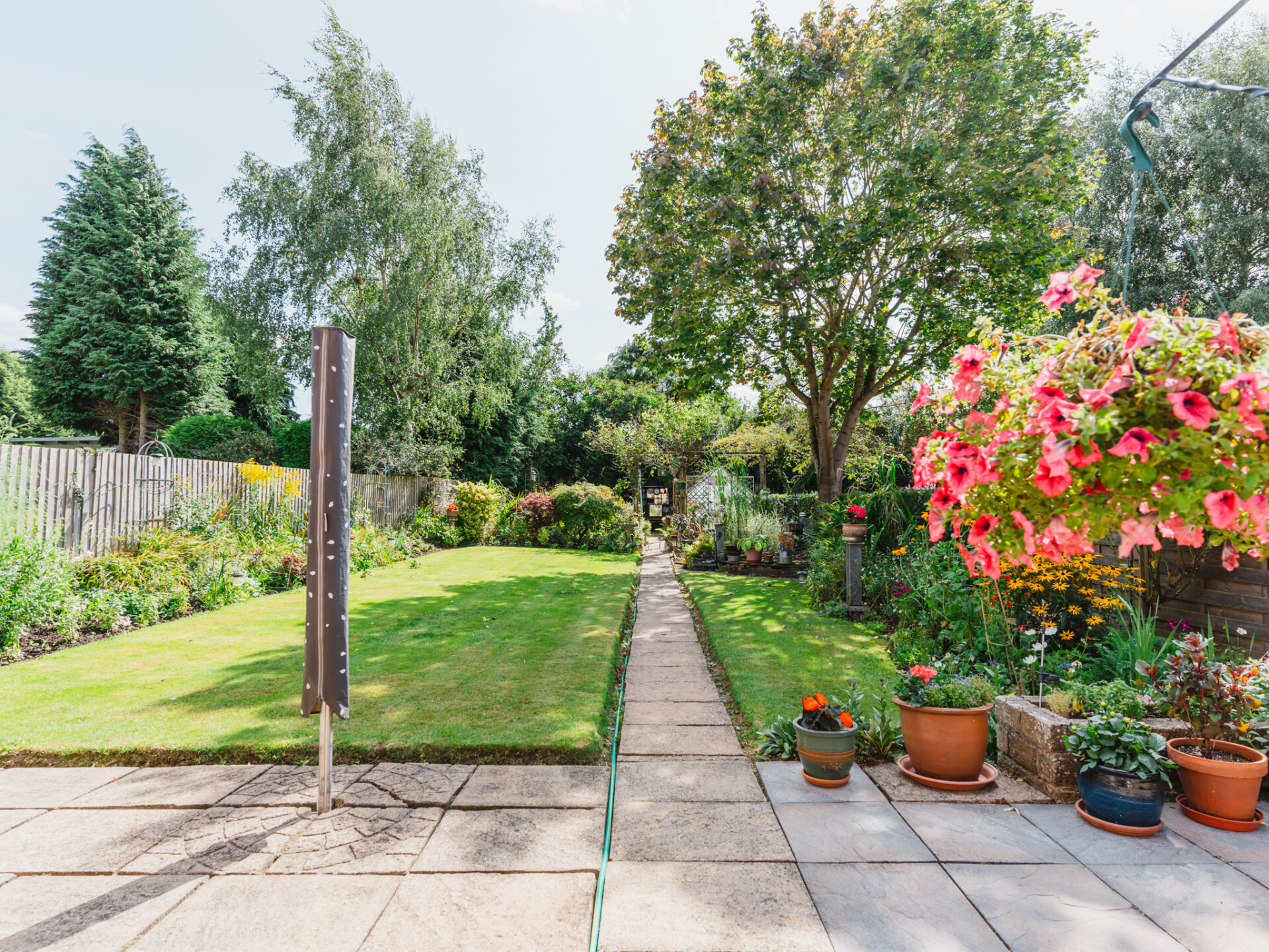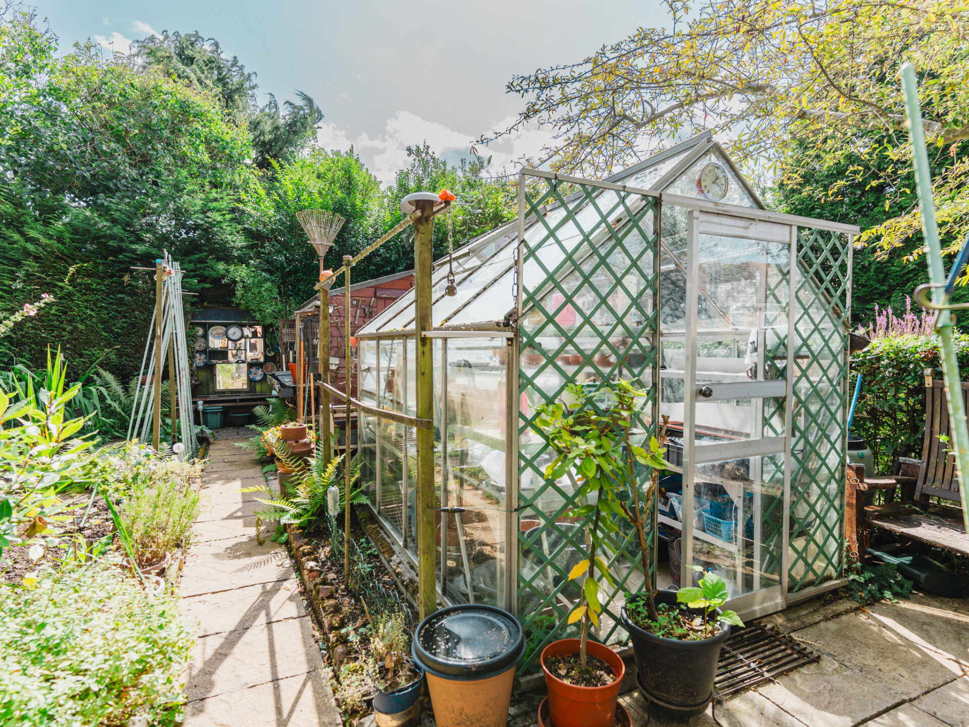 The rear garden is truly a highlight of this home—a large, south-facing oasis featuring a spacious patio seating area, perfect for al fresco dining and summer barbecues. The garden is mainly laid to lawn, bordered by well-established flower beds and a pathway leading to the end of the garden, where you will find two vegetable beds, a greenhouse, and a timber garden shed—ideal for gardening enthusiasts.