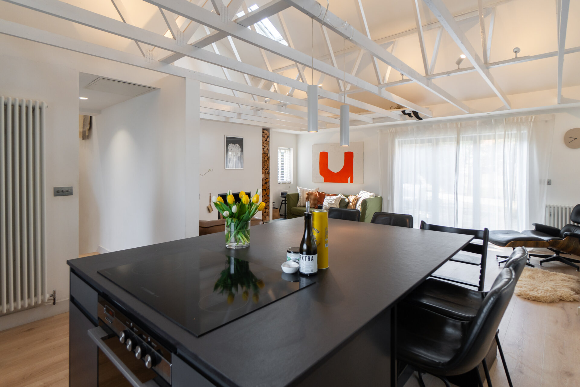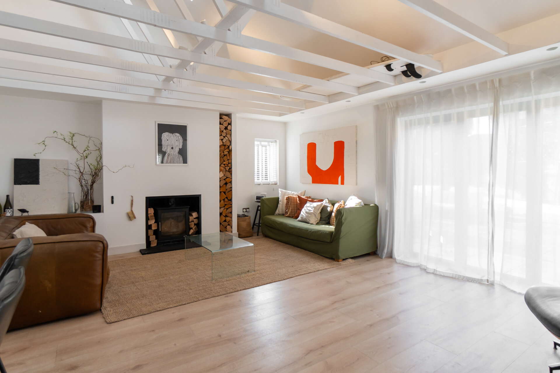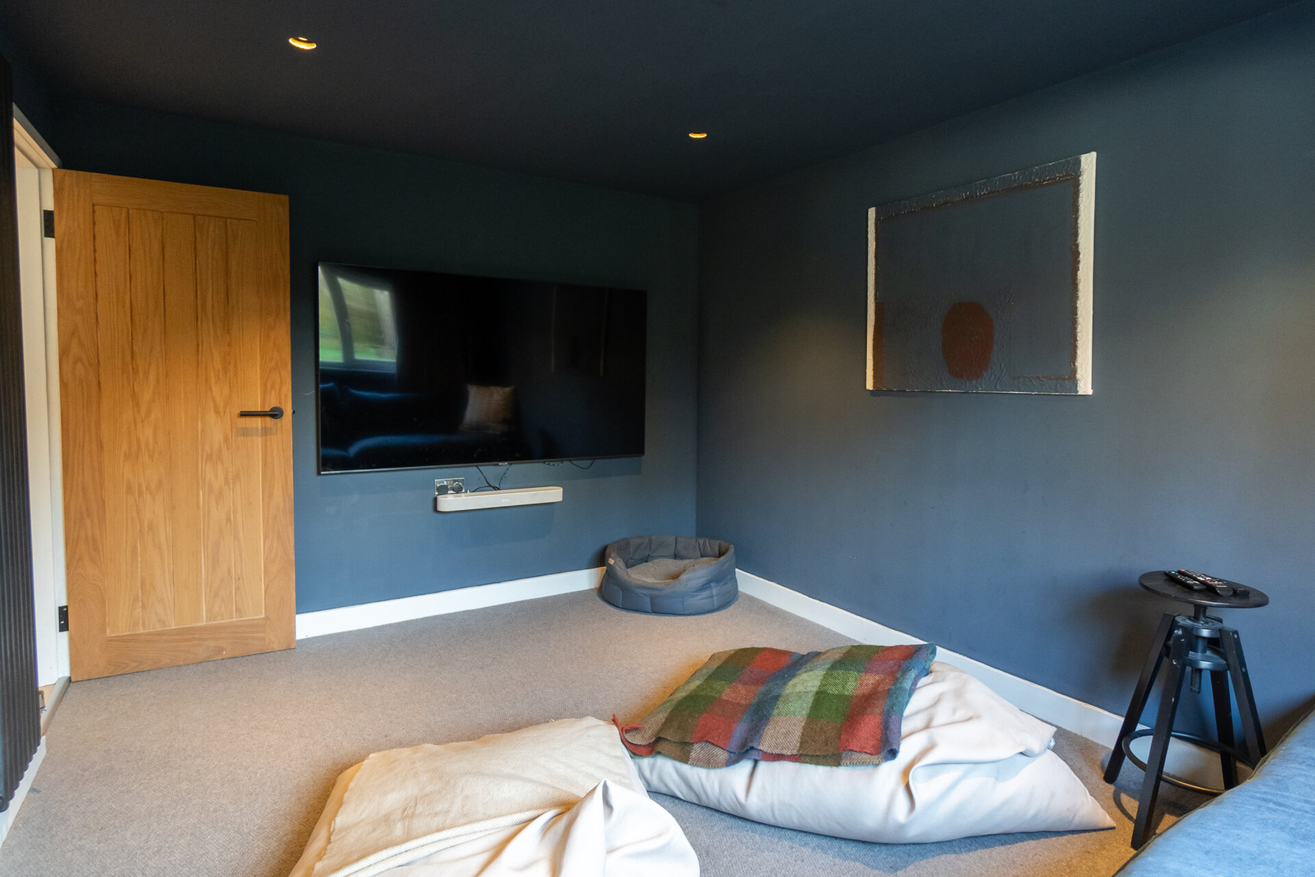Entry is via a double-height hall, a generous and clarifying threshold that immediately articulates the home’s vertical organisation. From here, the ground floor opens into a voluminous open-plan living space, where kitchen, dining and sitting areas are held beneath an expressive roof structure and wrapped in glazing to multiple elevations. Full-height bi-fold doors draw the garden into the plan, enabling the interior to extend seamlessly into the landscape. A centrally positioned island anchors the kitchen as both a functional workspace and a social nucleus, while integrated appliances maintain the continuity of the pared-back interior palette. A wood-burning stove introduces warmth and texture, offering a tactile counterpoint to the otherwise restrained material language. The lower ground floor is conceived as a flexible, semi-autonomous domain, well-suited to multigenerational living, guest accommodation or home working. A family room is accompanied by a utility, shower room and an additional room currently configured as a cinema. With its own sense of separation from the primary living areas, this level could readily operate as a self-contained annexe, subject to the usual consents.