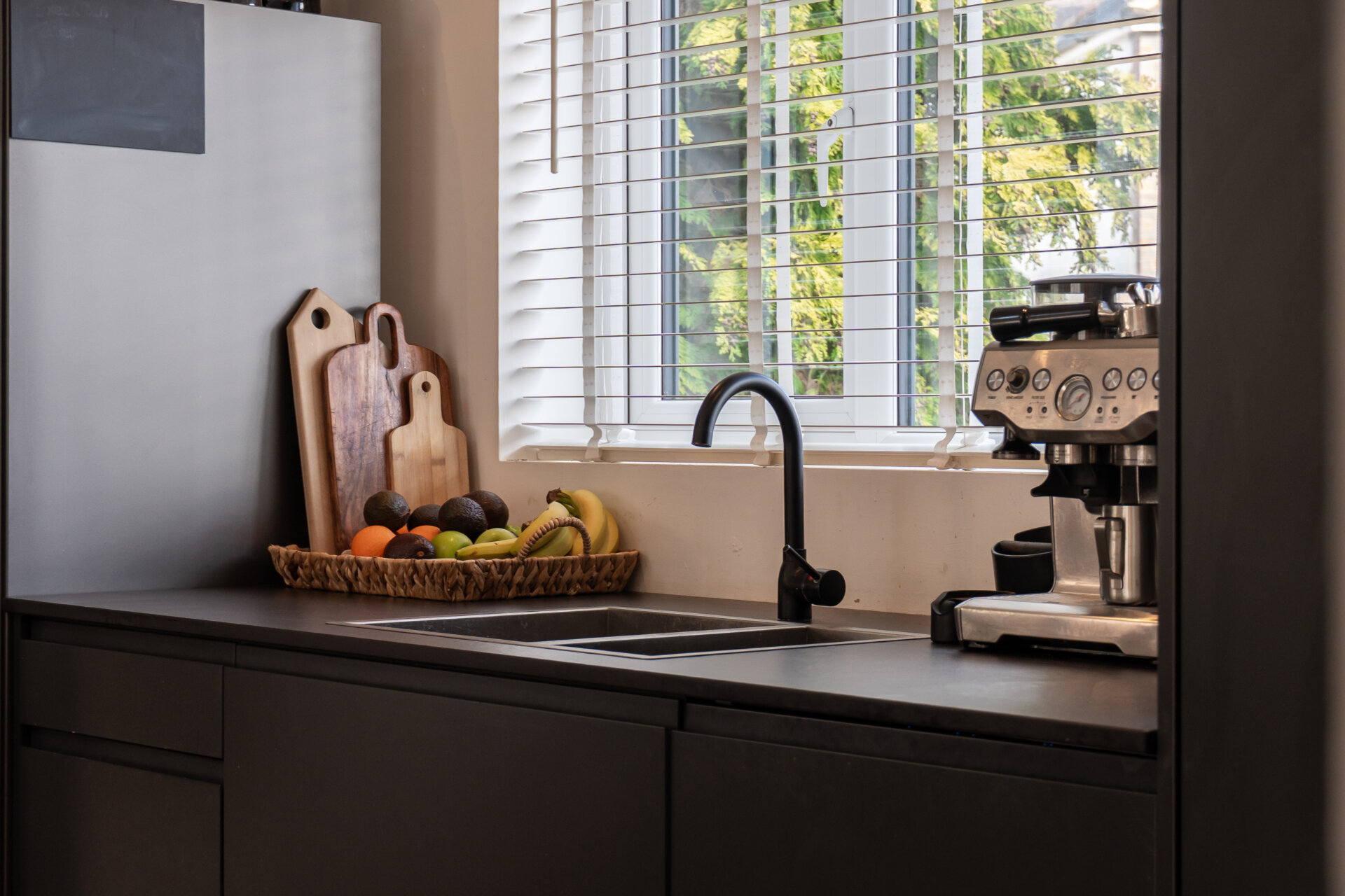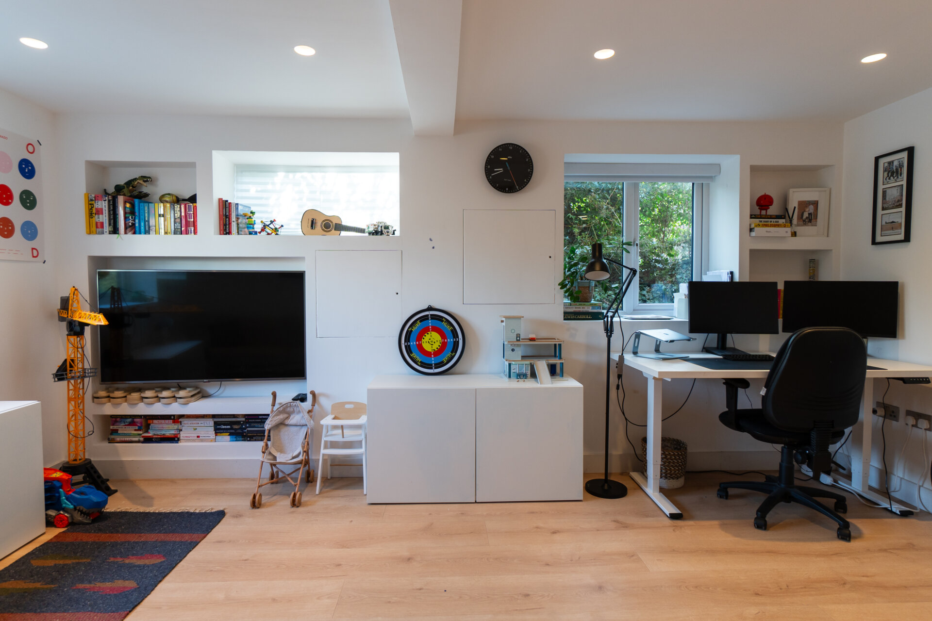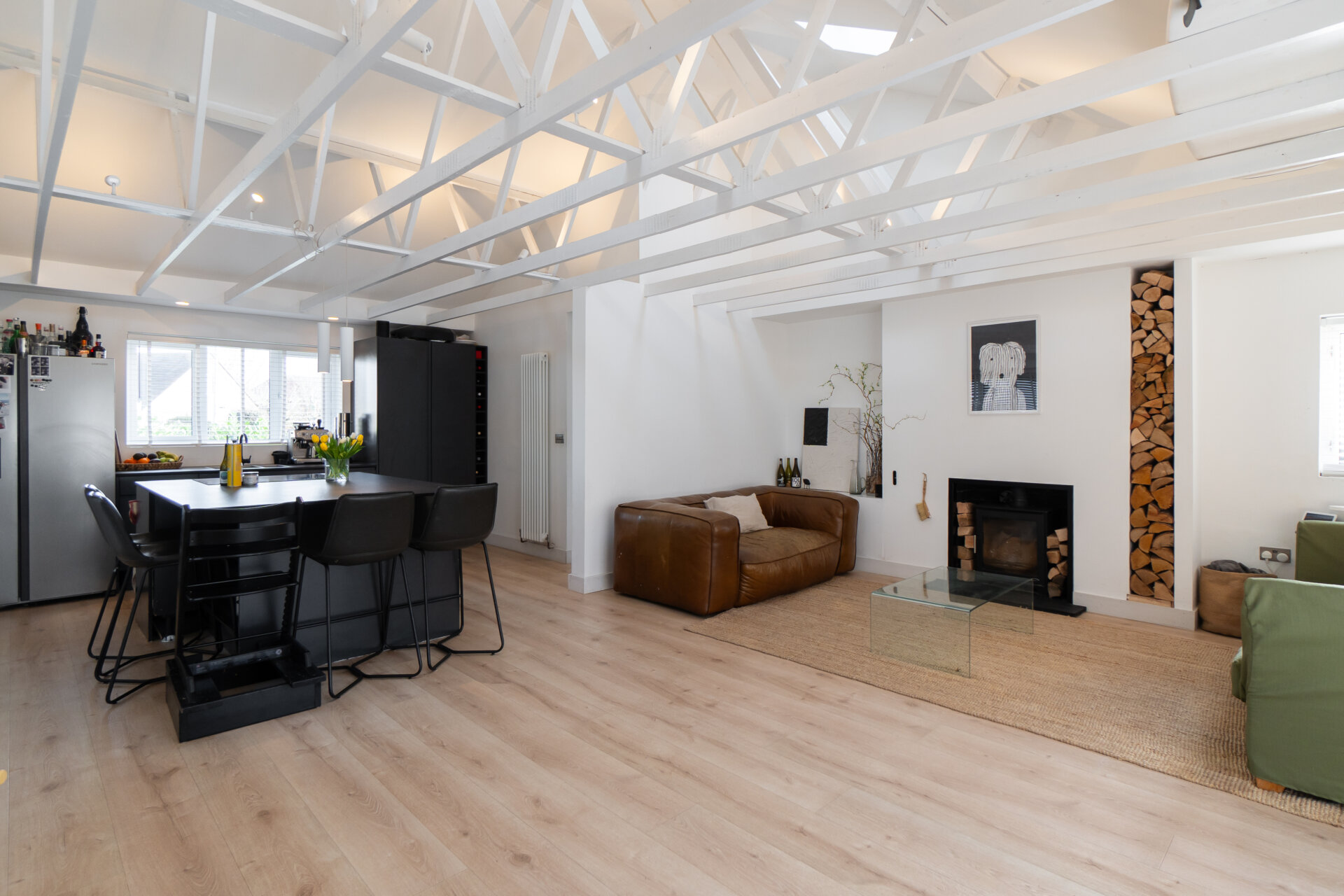 Entry is via a double-height hall, a generous and clarifying threshold that immediately articulates the home’s vertical organisation. From here, the ground floor opens into a voluminous open-plan living space, where kitchen, dining and sitting areas are held beneath an expressive roof structure and wrapped in glazing to multiple elevations. Full-height bi-fold doors draw the garden into the plan, enabling the interior to extend seamlessly into the landscape. A centrally positioned island anchors the kitchen as both a functional workspace and a social nucleus, while integrated appliances maintain the continuity of the pared-back interior palette. A wood-burning stove introduces warmth and texture, offering a tactile counterpoint to the otherwise restrained material language. The lower ground floor is conceived as a flexible, semi-autonomous domain, well-suited to multigenerational living, guest accommodation or home working. A family room is accompanied by a utility, shower room and an additional room currently configured as a cinema. With its own sense of separation from the primary living areas, this level could readily operate as a self-contained annexe, subject to the usual consents.