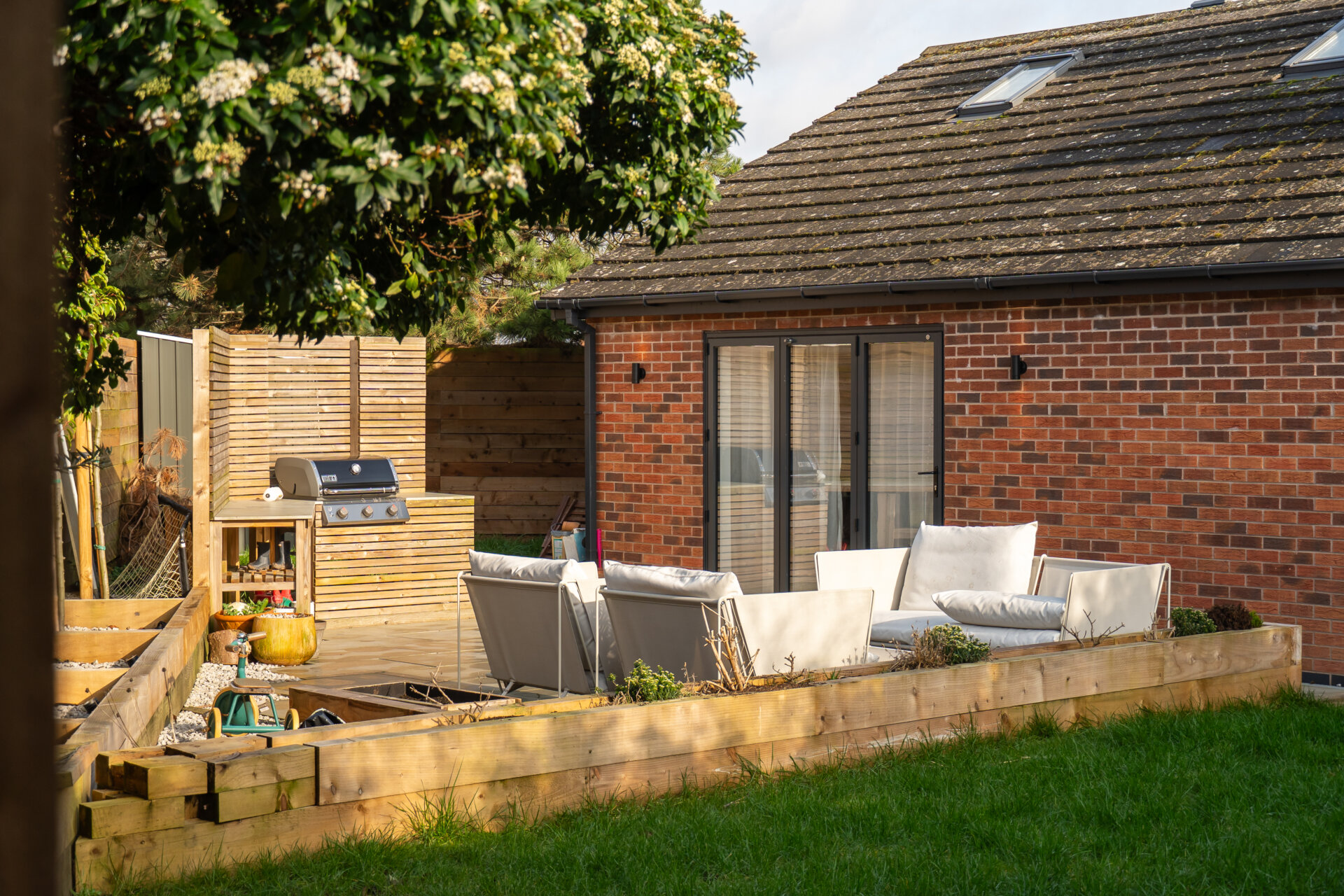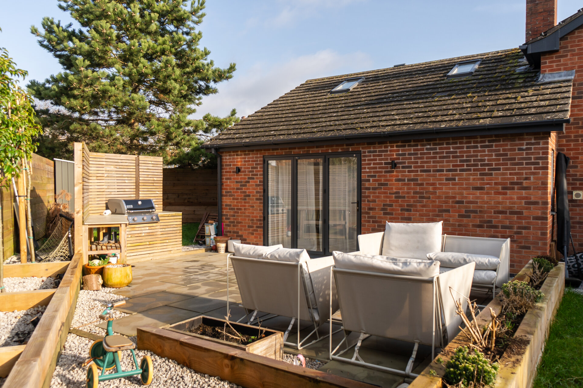 Externally, the front of the house is paved to provide off-street parking for two vehicles, with planted beds softening the interface with the street. To the rear, the garden has been gently structured with lawn, terrace and an outdoor cooking area, offering a composed setting for everyday life and informal entertaining, with further potential for reconfiguration, subject to consent.