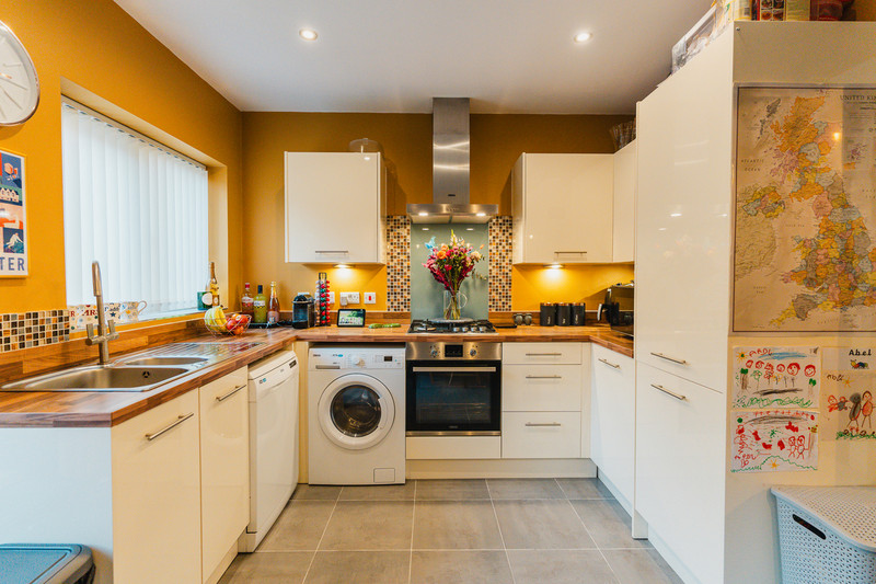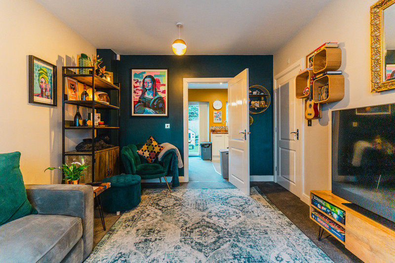 Approaching the property, its exceptional curb appeal is heightened by off-road parking for two vehicles at the front. Stepping inside, the entrance hall welcomes you leading to a luminous and inviting primary reception area. The elegantly appointed fitted kitchen at the rear exudes style with modern pendant lighting and a sophisticated colour scheme. This space boasts a four-ring gas cylinder hob with a concealed extractor hood, an integrated fitted oven and provisions for a washing machine and dishwasher, alongside charming wood-panelling to the side aspect. Double glazed uPVC French doors grant seamless access to the low-maintenance private rear garden, providing a delightful view. A downstairs w/c completes the downstairs accommodation.