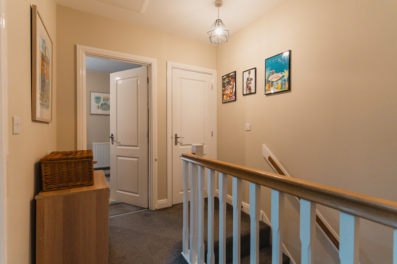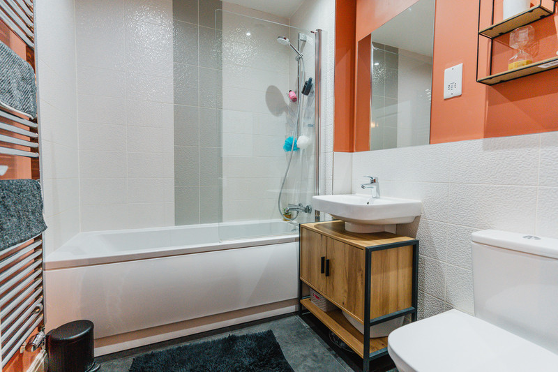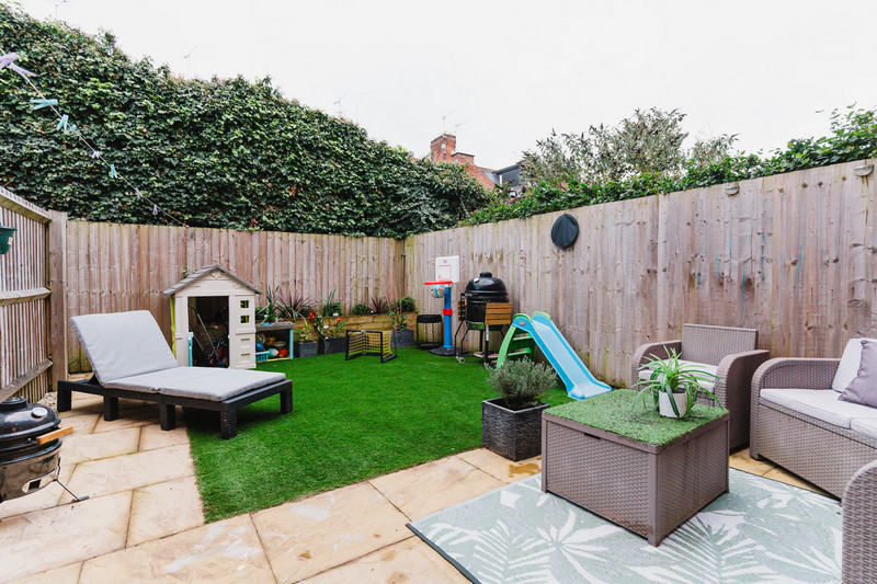 Ascending the stairs reveals a generous landing leading to a large double bedroom adorned with fitted wardrobes and double-glazed windows to the front aspect offering pleasant views. Originally configured as a two-bedroom layout, the second bedroom has been subdivided into two singles, easily convertible back into a spacious double or adaptable for a dressing room/study and single bedroom. Completing the upper level is a modern three-piece family bathroom. Outside, the impeccably maintained rear garden features easy-to-manage astro-turf lawn, a raised patio area, and lush shrubbery, ensuring privacy from neighbouring properties.