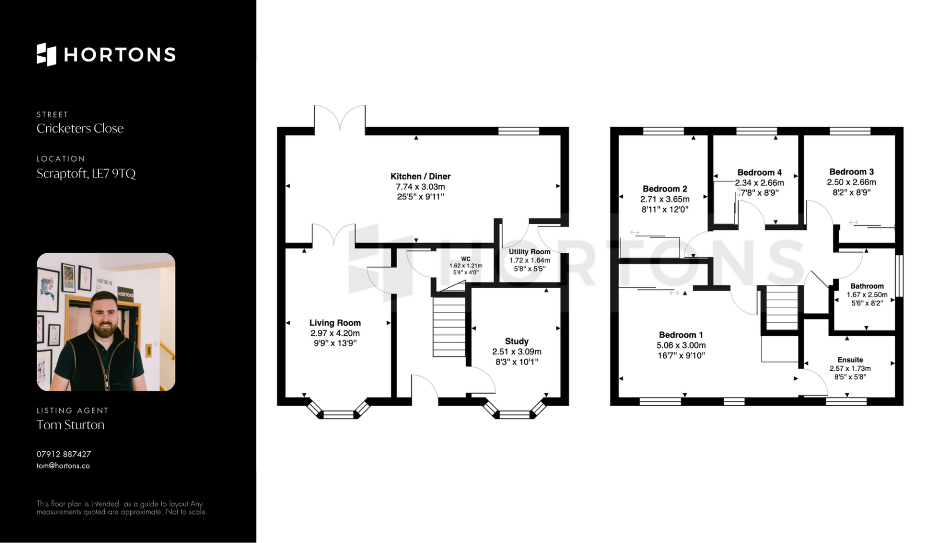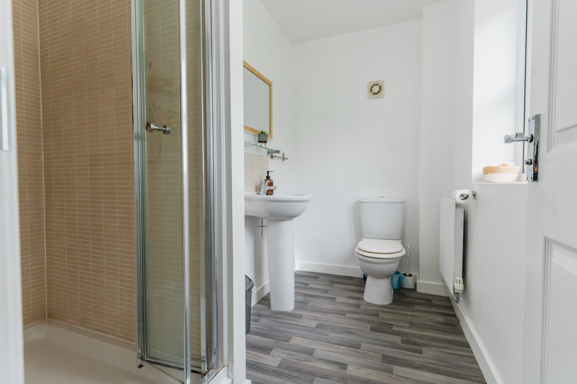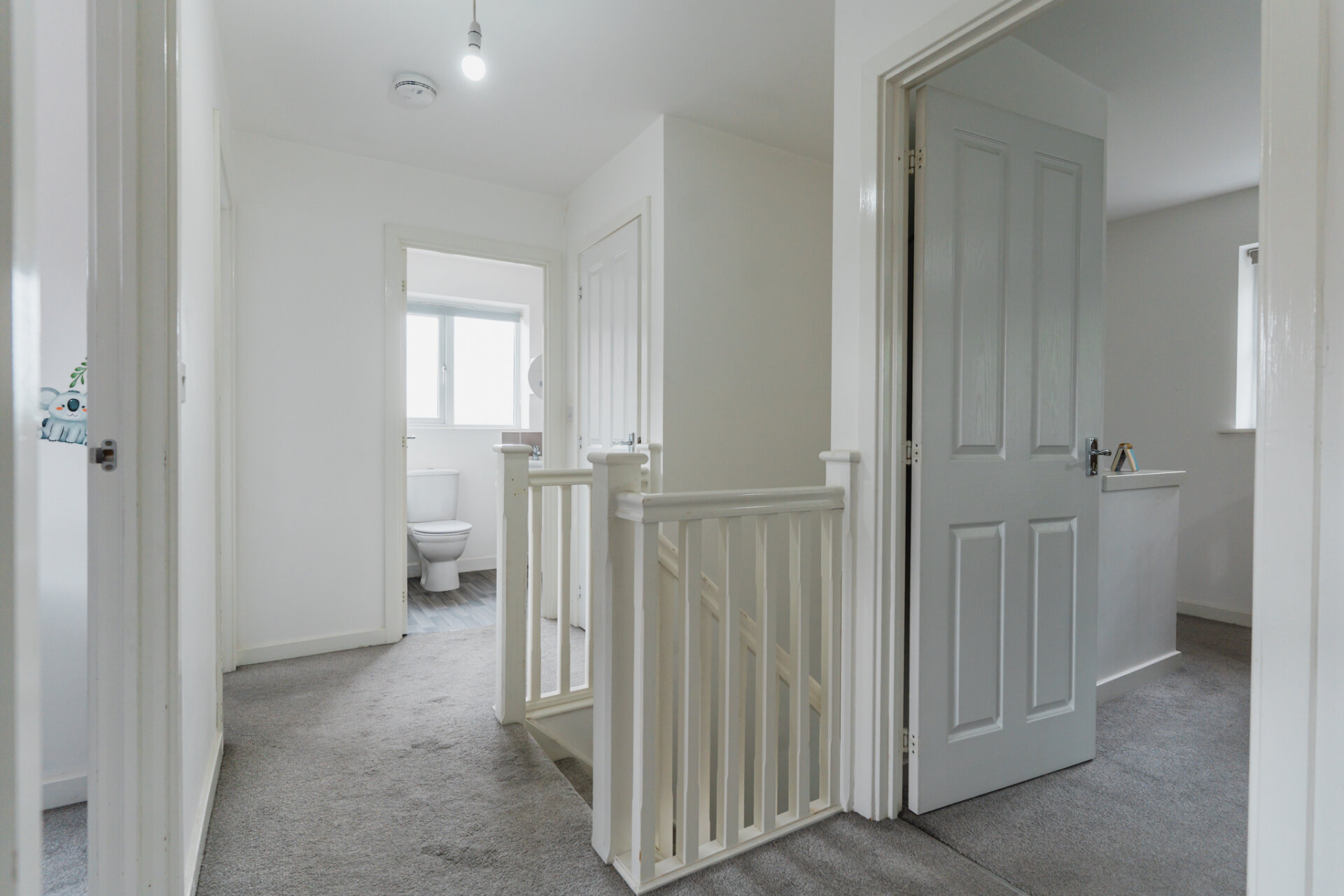 Upstairs, there are four well-proportioned bedrooms — all complete with built-in wardrobes. The main bedroom includes a modern en-suite shower room, while the others are served by a family bathroom with a clean, neutral finish.