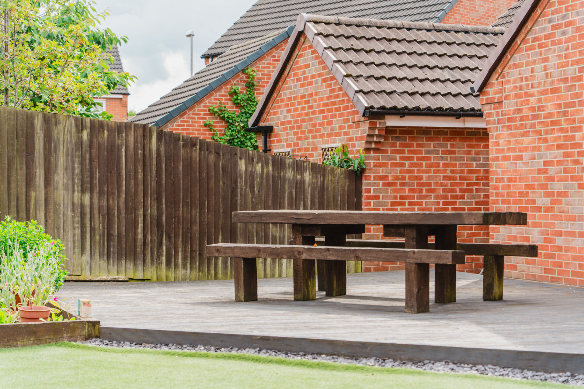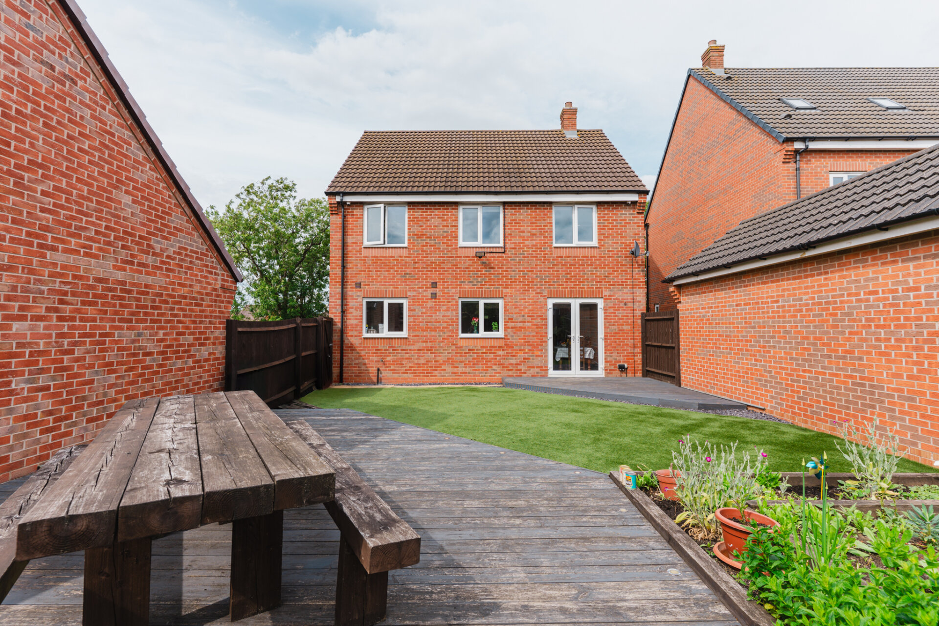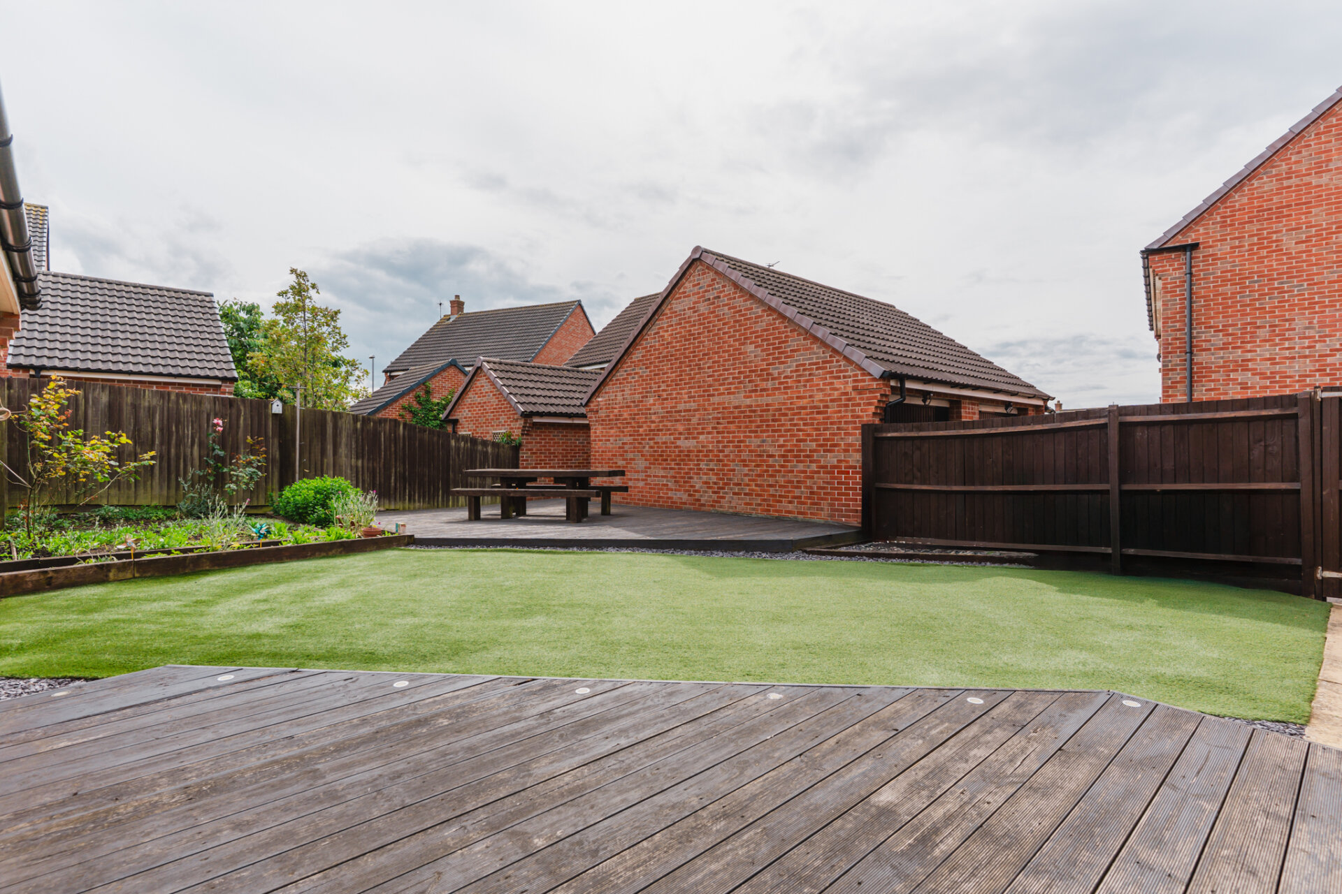 Outside, the south-west facing rear garden is low maintenance and family-friendly, featuring a level artificial lawn, raised decking with integrated lighting, gravelled borders, and floral beds — plus handy outdoor power and a tap.