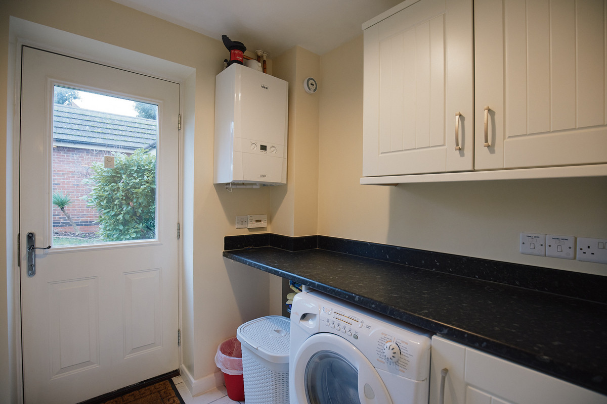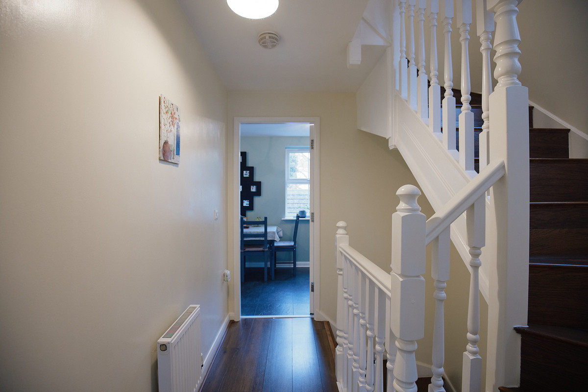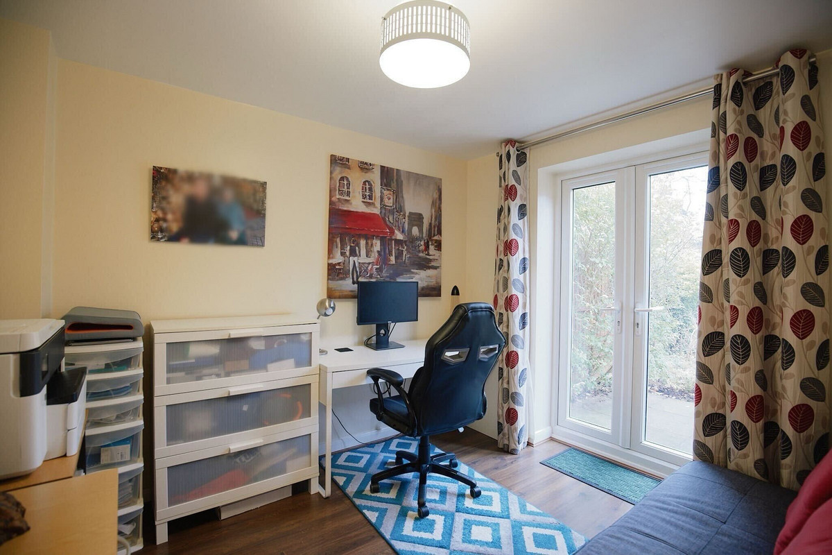 The accommodation is thoughtfully distributed across three floors, starting with a deceptively spacious entrance hall that leads to two double bedrooms on the ground floor, a three-piece family bathroom, and a strategically positioned utility room. The second bedroom, situated at the far end of the ground-floor space, currently serves as a home office and boasts double-glazed French doors opening to the North-facing garden. The utility room is equipped to house a freestanding washing machine and features a three-year-old Ideal Logic Combi boiler.
