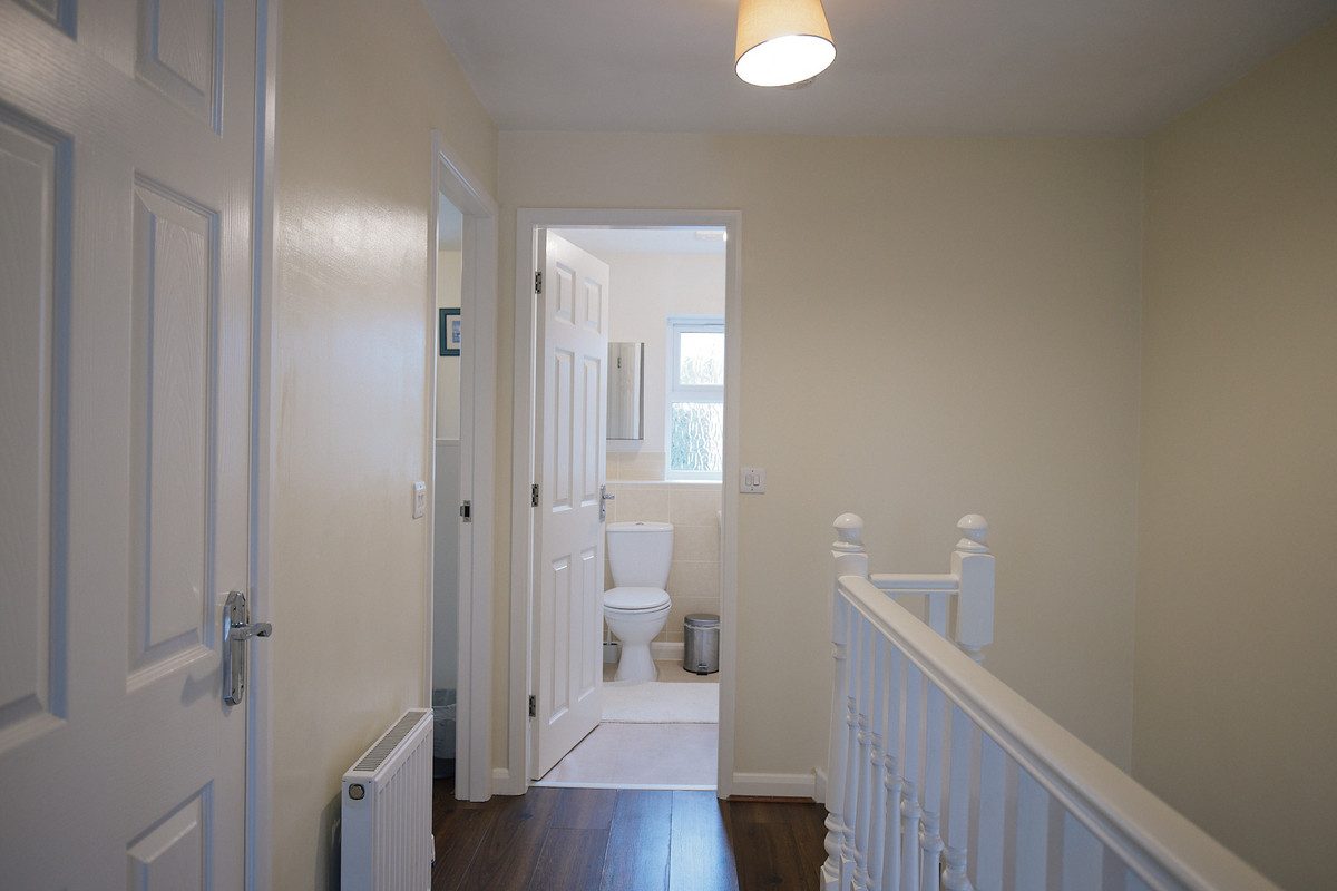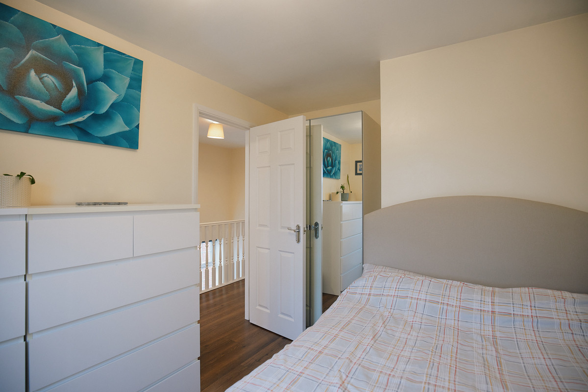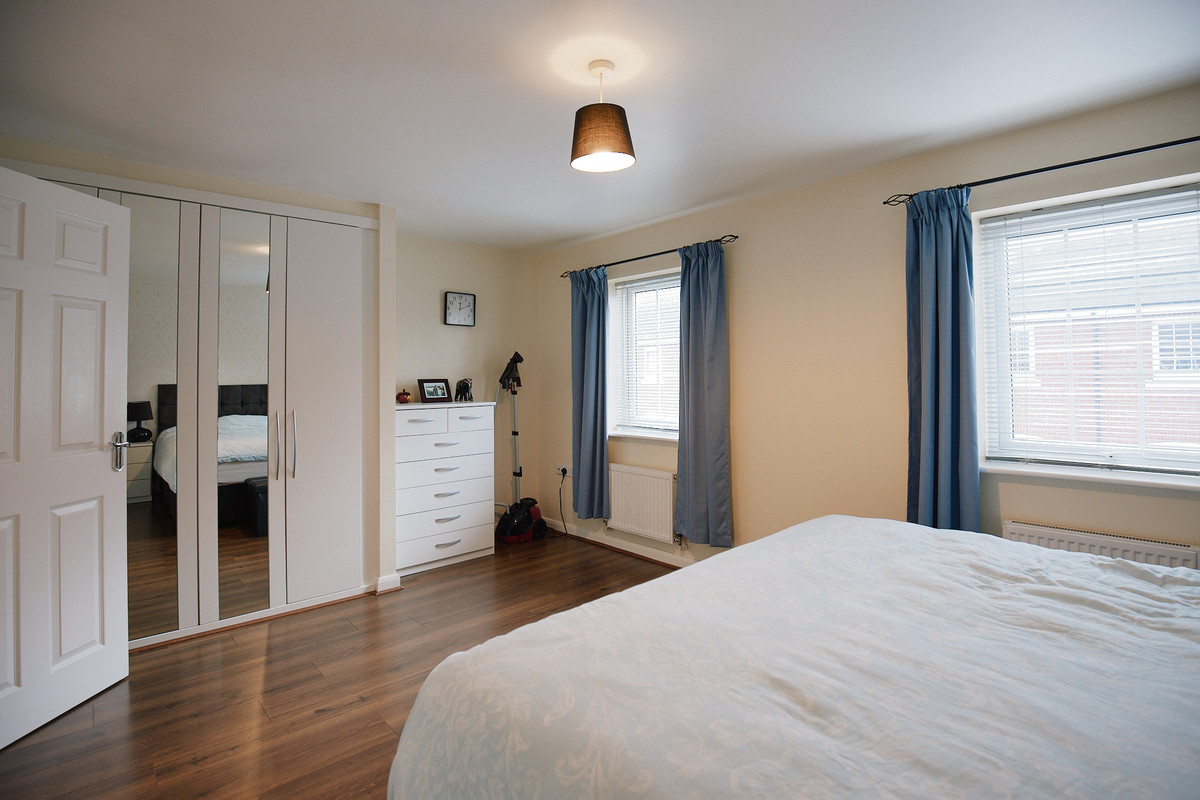 Ascending the initial flight of stairs brings you to a well-presented and stylishly appointed fitted kitchen, complete with a six-ring gas cylinder hob and a concealed extractor hood. The kitchen offers ample surface preparation area and provides views of the rear garden through double-glazed windows on the side aspect. A generously sized primary reception room, featuring modern laminate flooring, a Juliet balcony overlooking the front of the development, and ample space for freestanding furniture, completes this level. A second set of stairs leads to two additional bedrooms and another three-piece family bathroom. The master bedroom, positioned at the front of the second-floor accommodation, includes fitted wardrobes and an en-suite three-piece family bathroom.