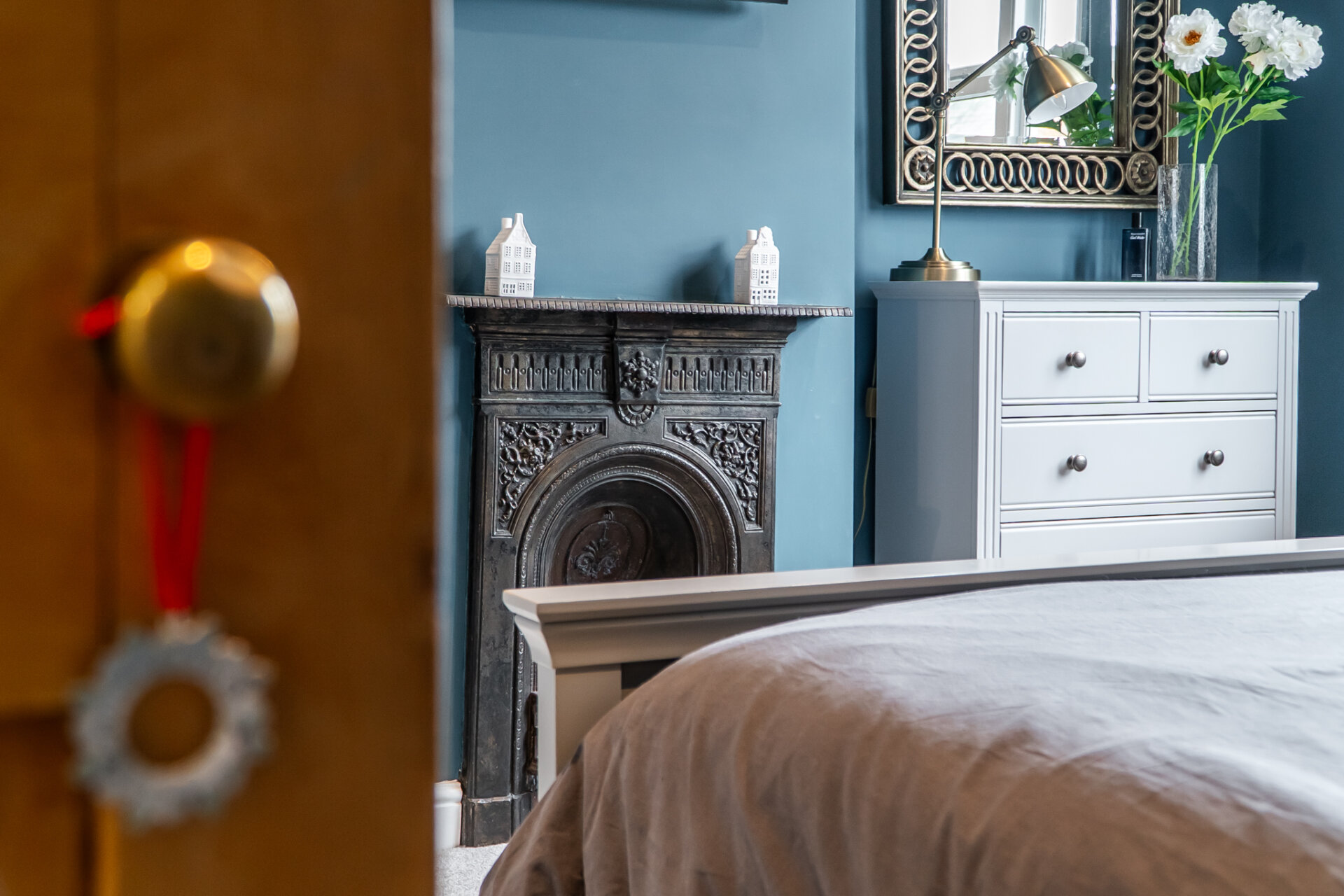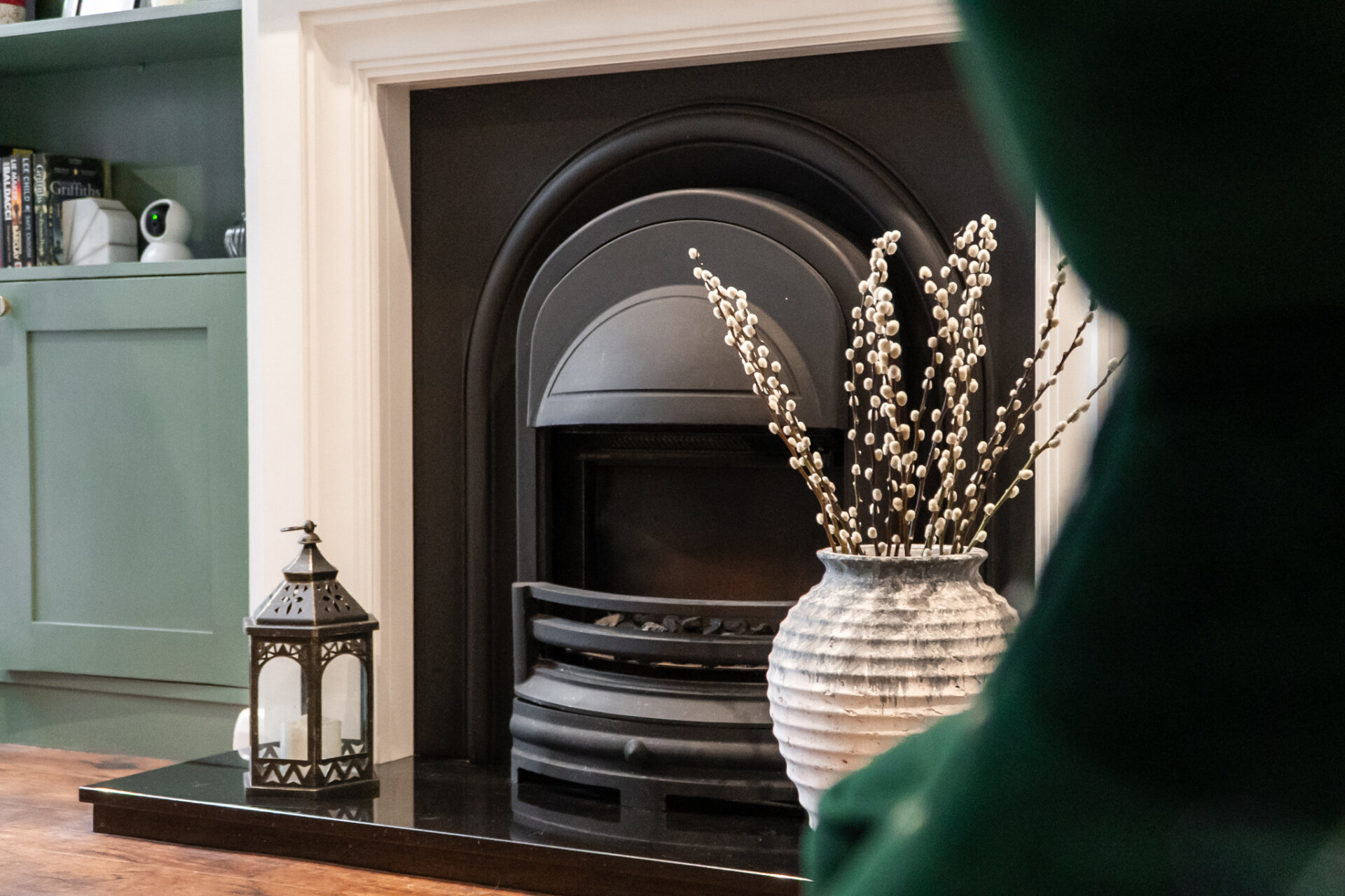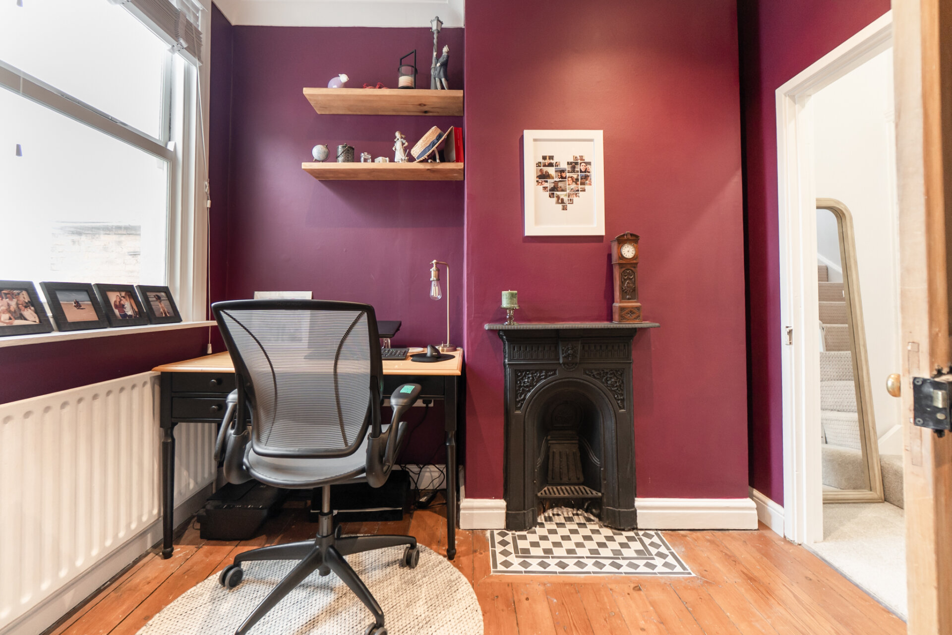 The second reception room is cosy and inviting, featuring an electric flame-effect fire with an ornamental surround and bespoke fitted bookshelves and cupboards in the alcove.
